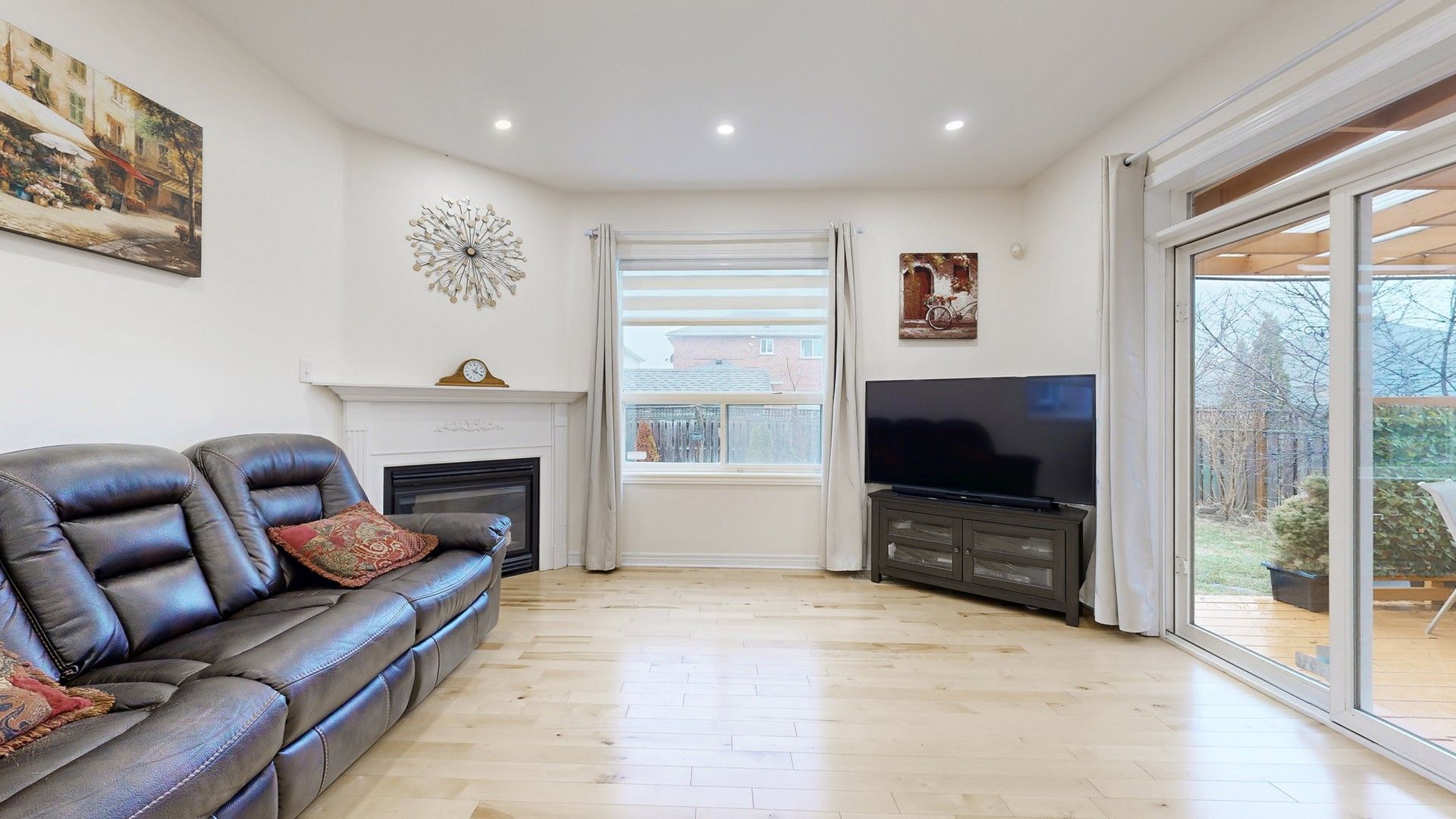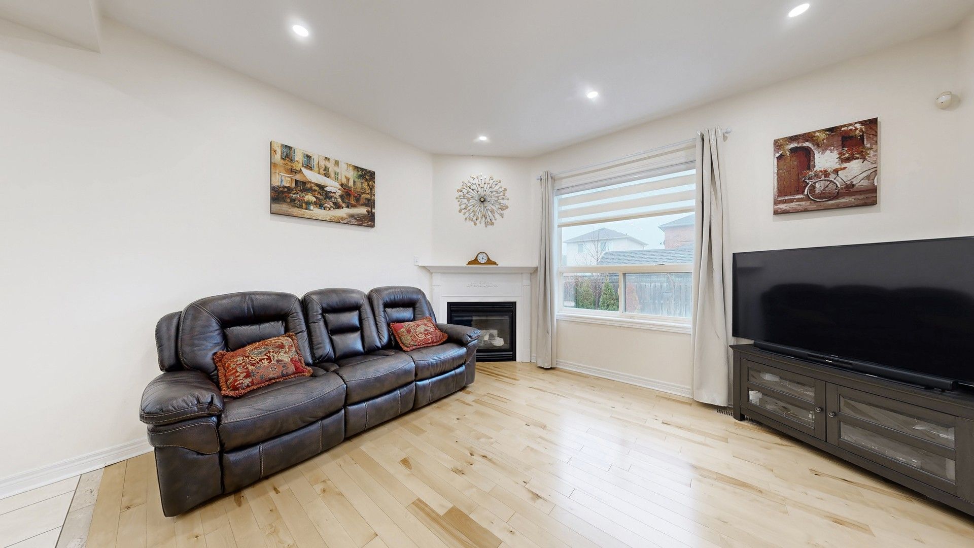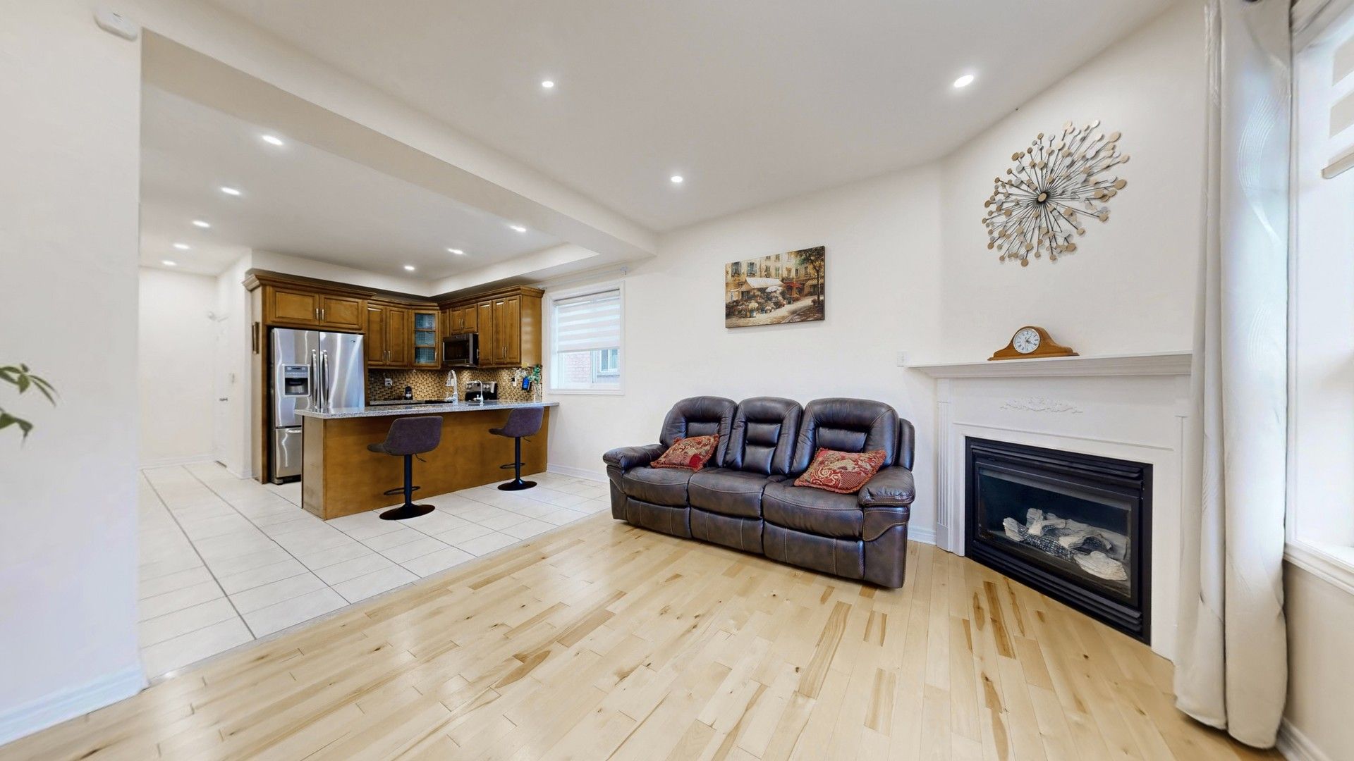 • Open concept main floor with natural light, hardwood floors, and gas fireplace.