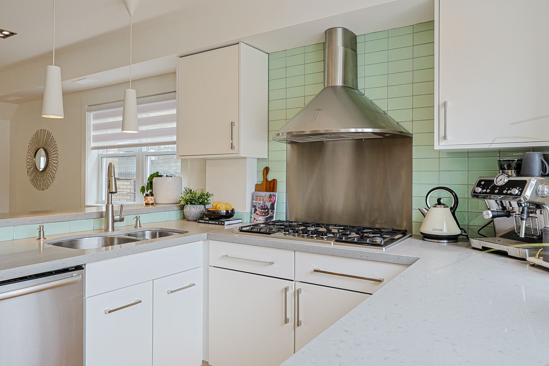 • Sleek kitchen features quartz countertops and a Bosch 5-burner cooktop.