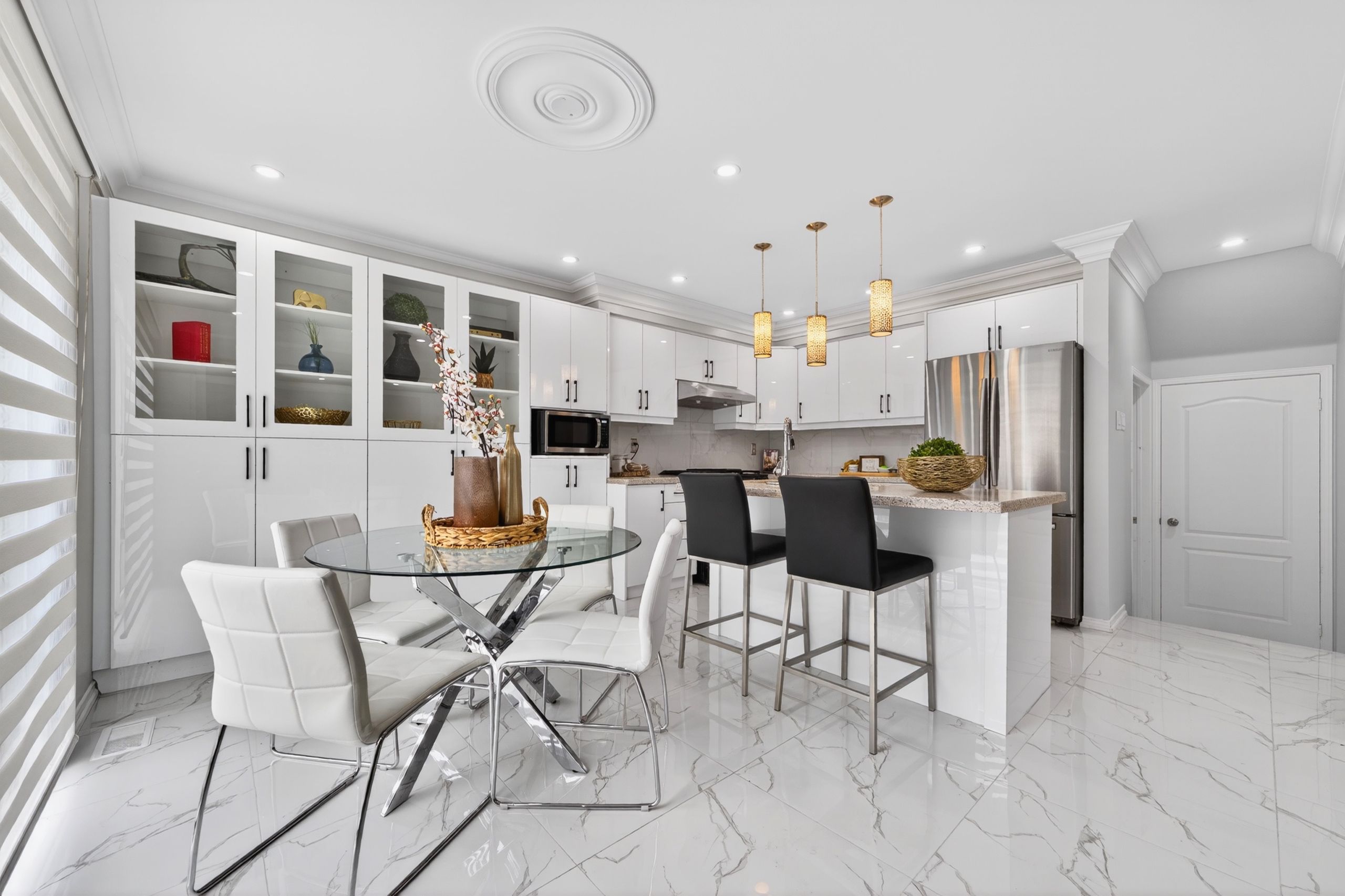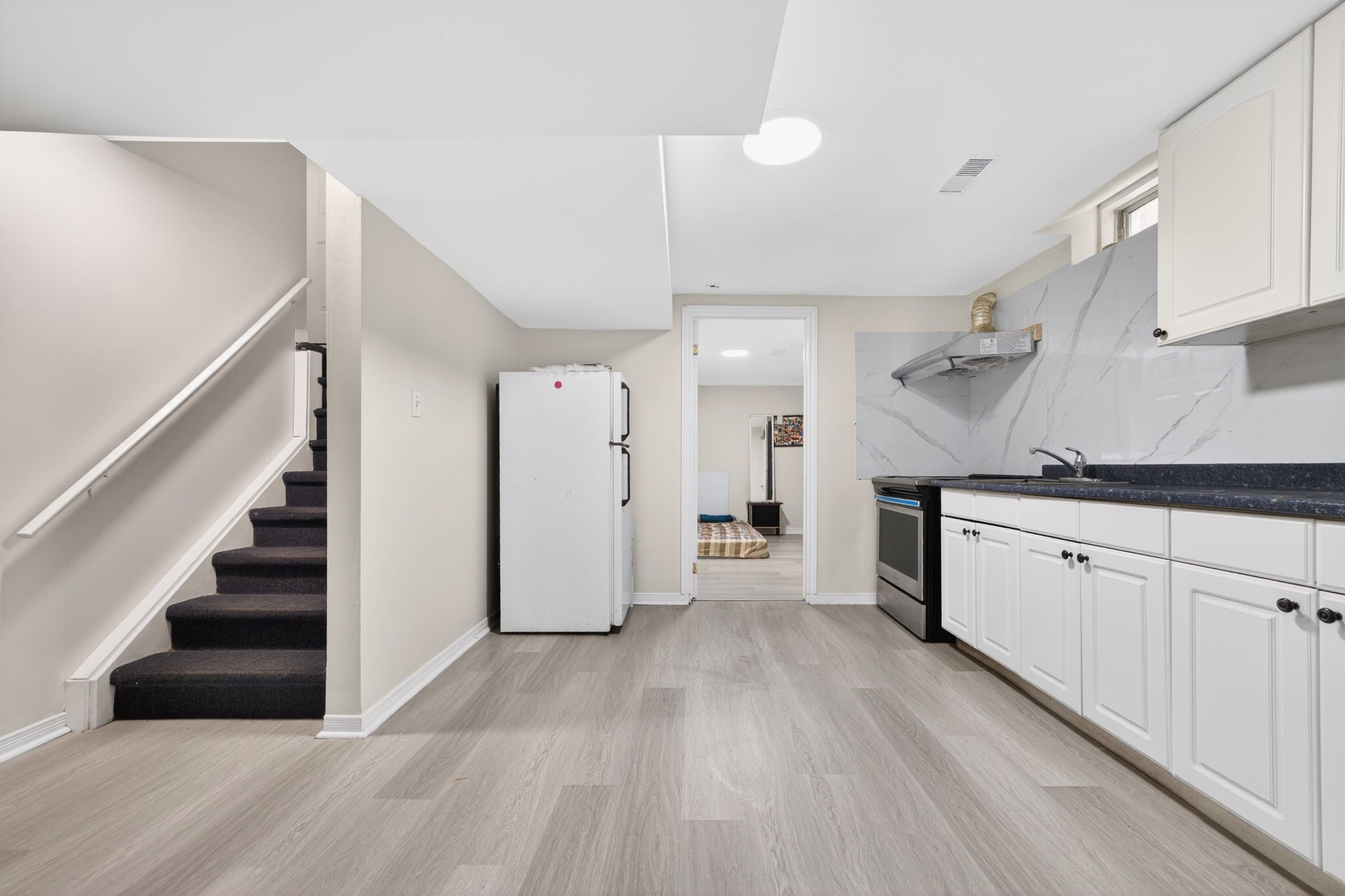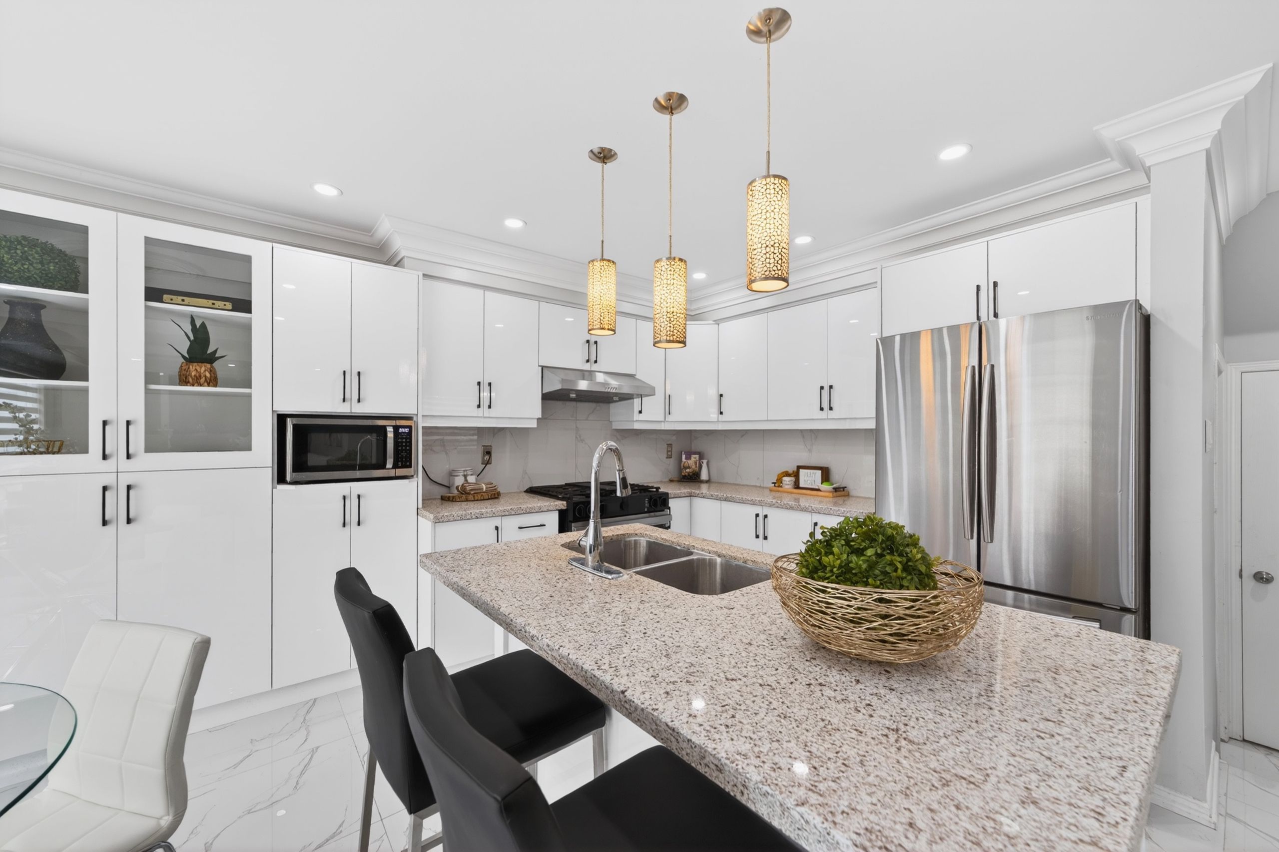 • Modern kitchen features stainless steel appliances and ample space.