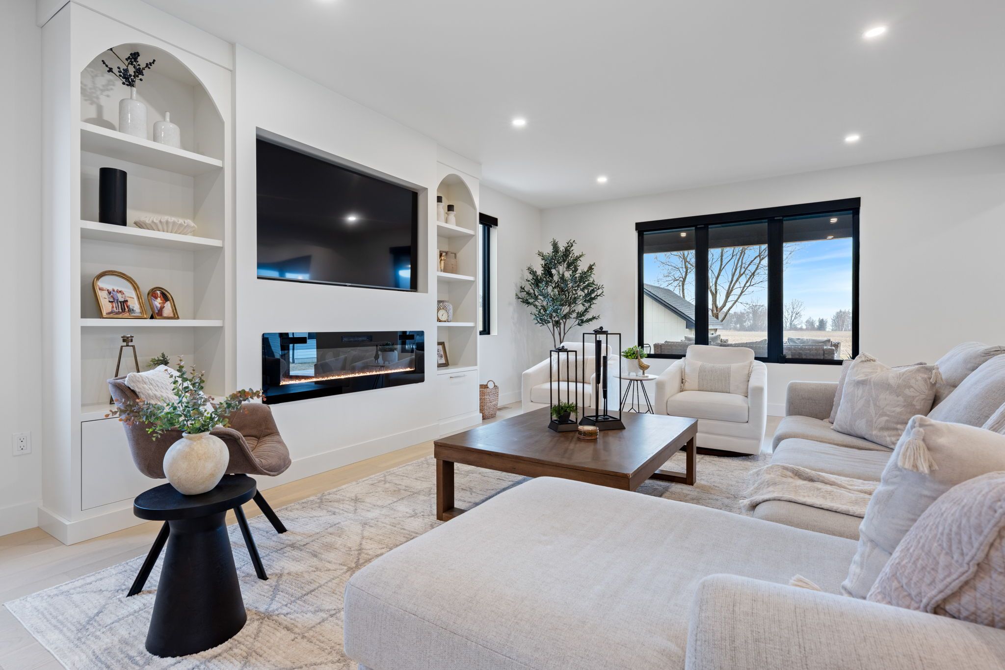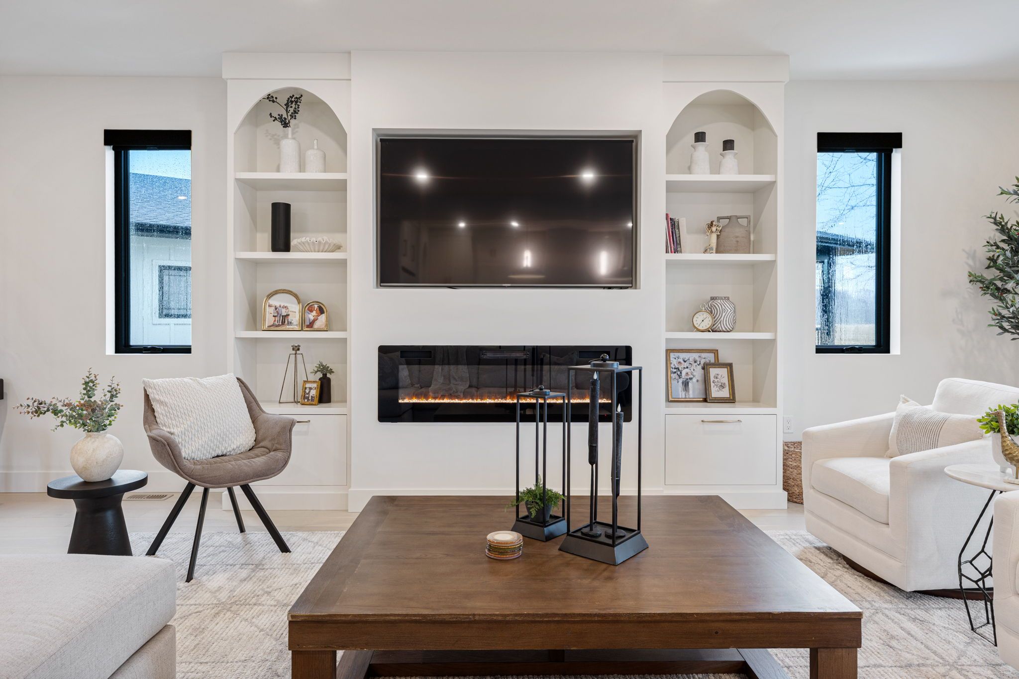 • Bright great room with large windows, custom built-ins, and inviting fireplace.