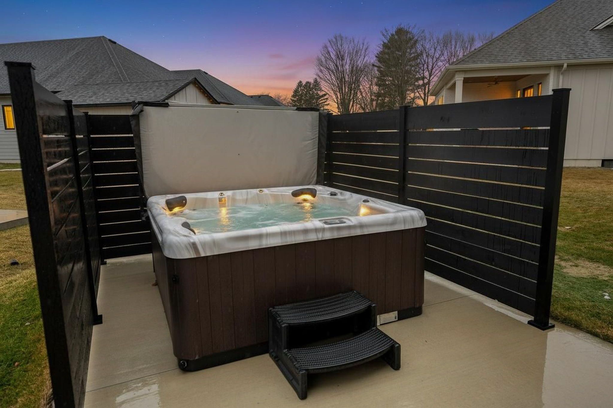 • Beautiful backyard with a covered porch and private hot tub area for relaxation.