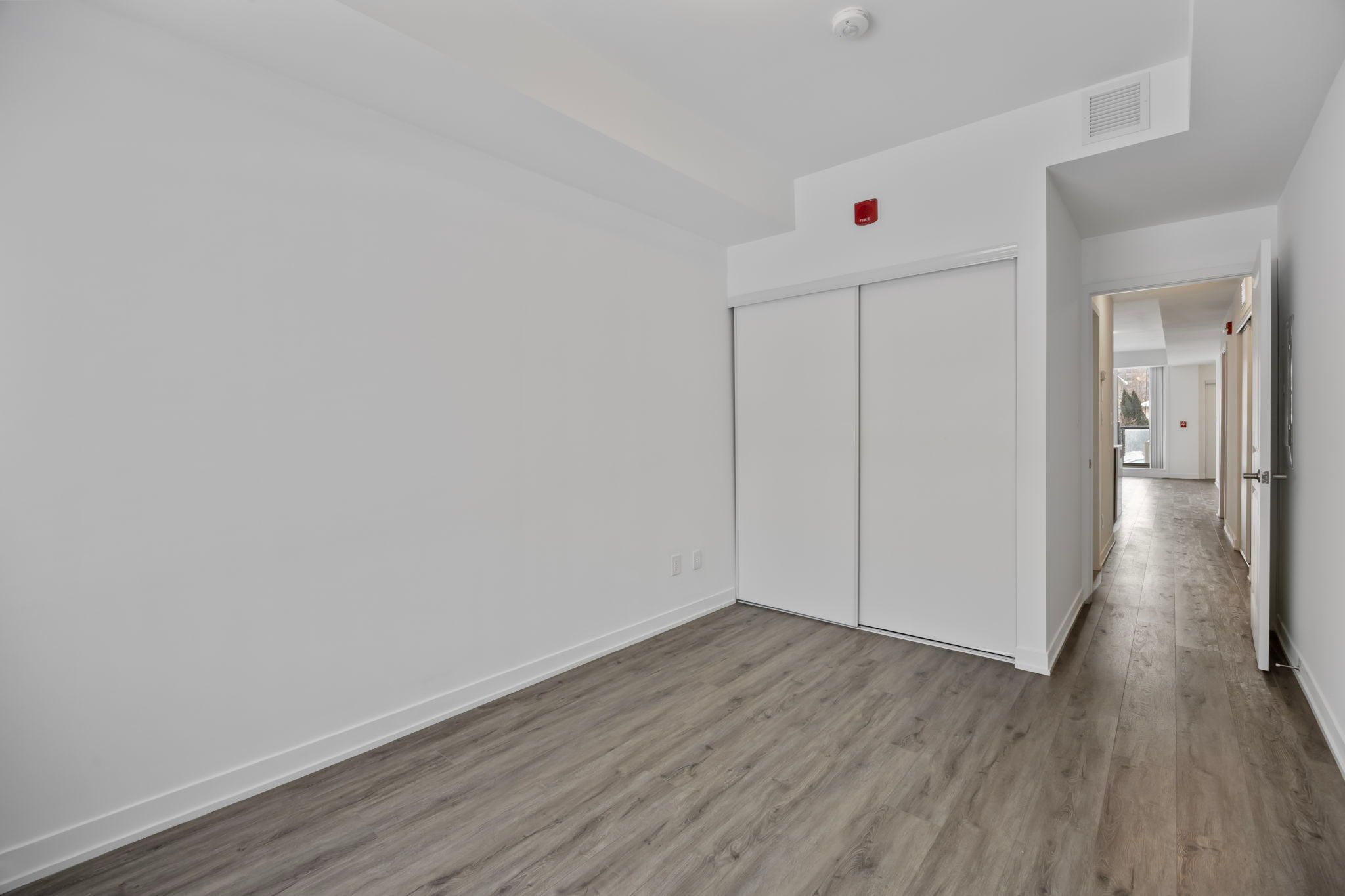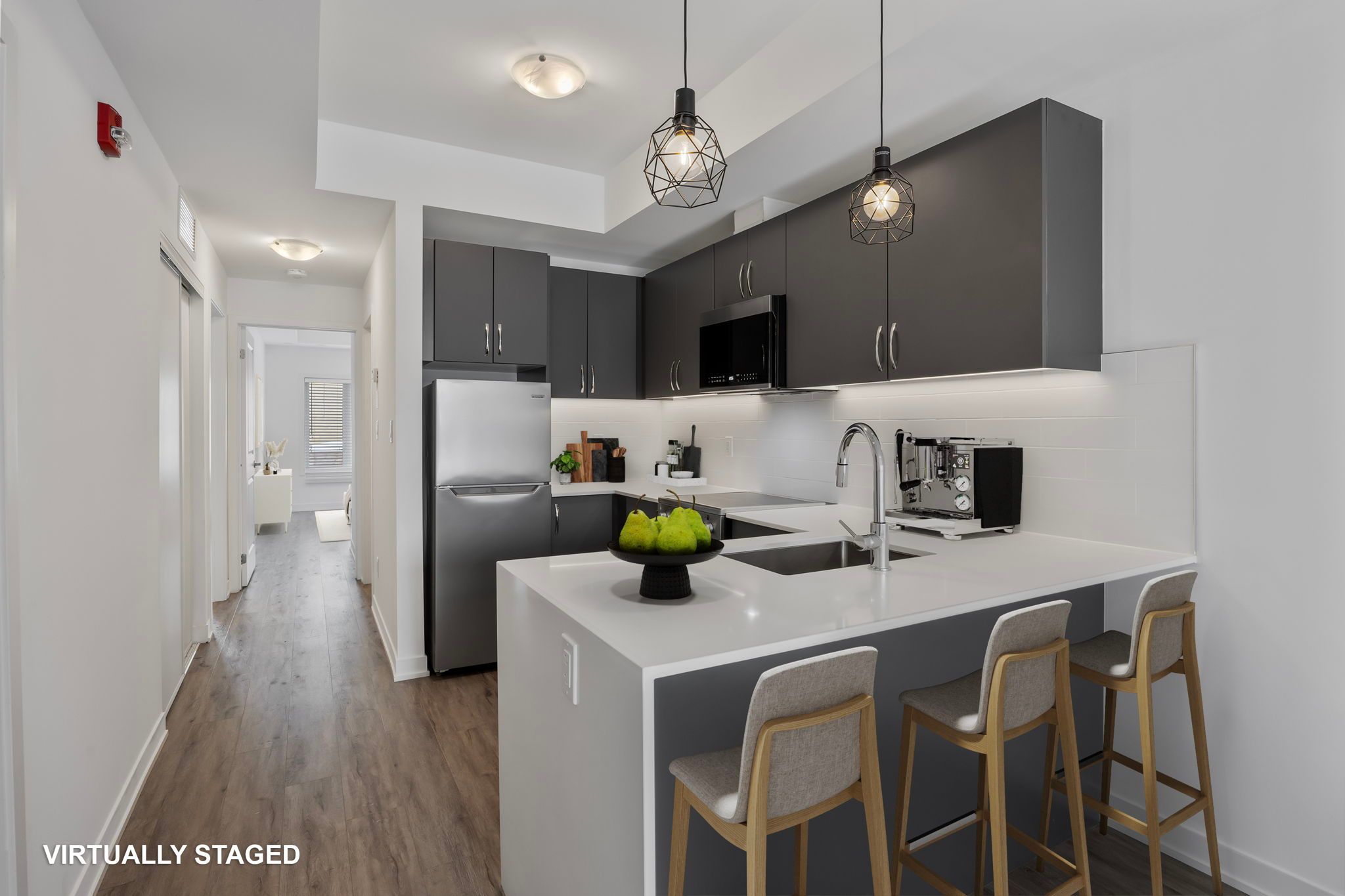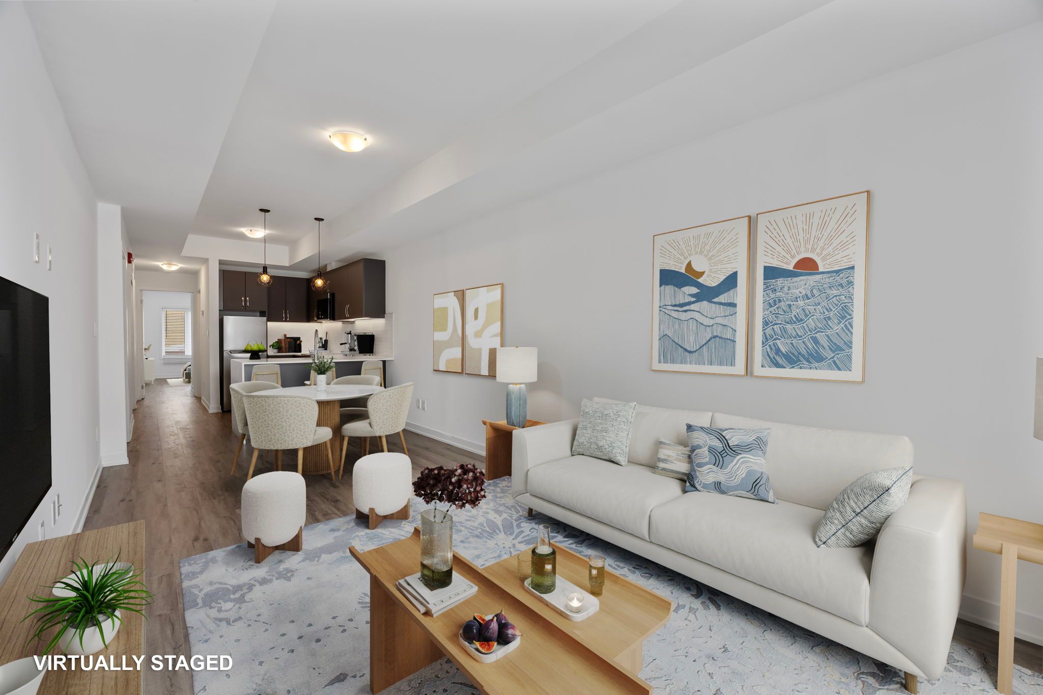 Don't miss this 2 br, 2 full baths condo townhouse in 1 level @ 965 square feet + balcony, with clear and bright south view and lovely north garden view. Trendy and functional, featuring coffered ceilings for a refined upscale finish. Shows immaculate; in a small quiet court and yet 100% walk score: 3 min. Walk to transit and 3min. Drive to 401 access. Only 2 years old, still brand spanking new!
