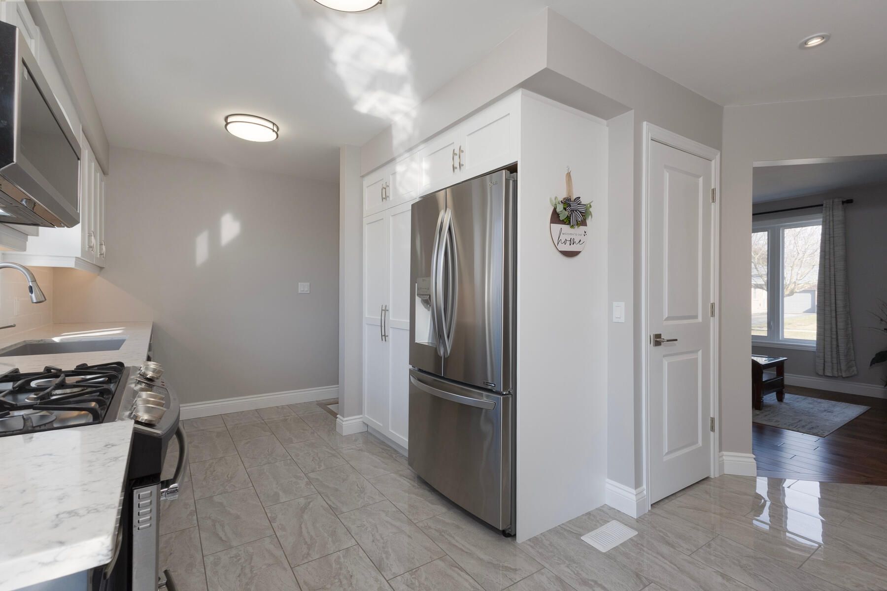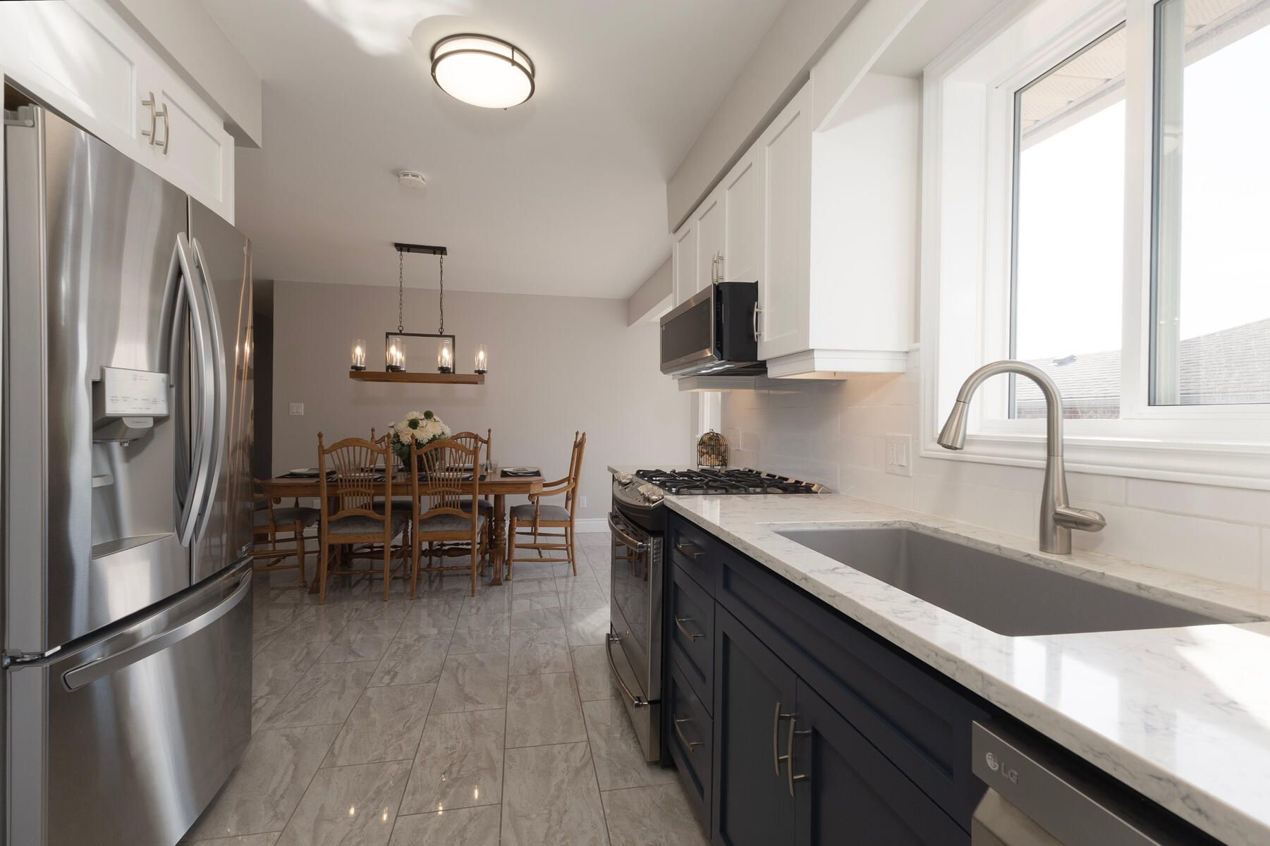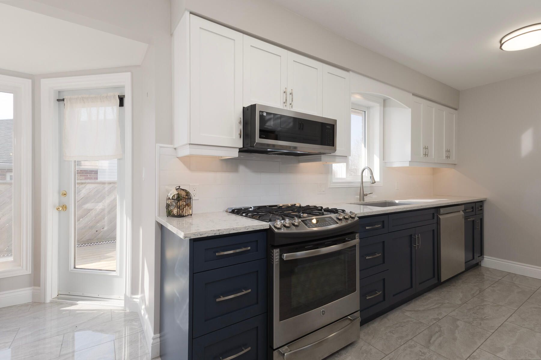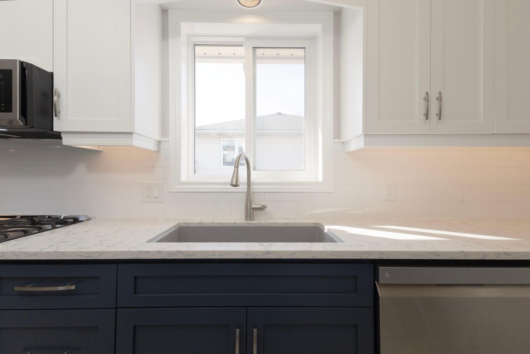 • Modern kitchen features new cabinetry, quartz countertops, and included appliances.