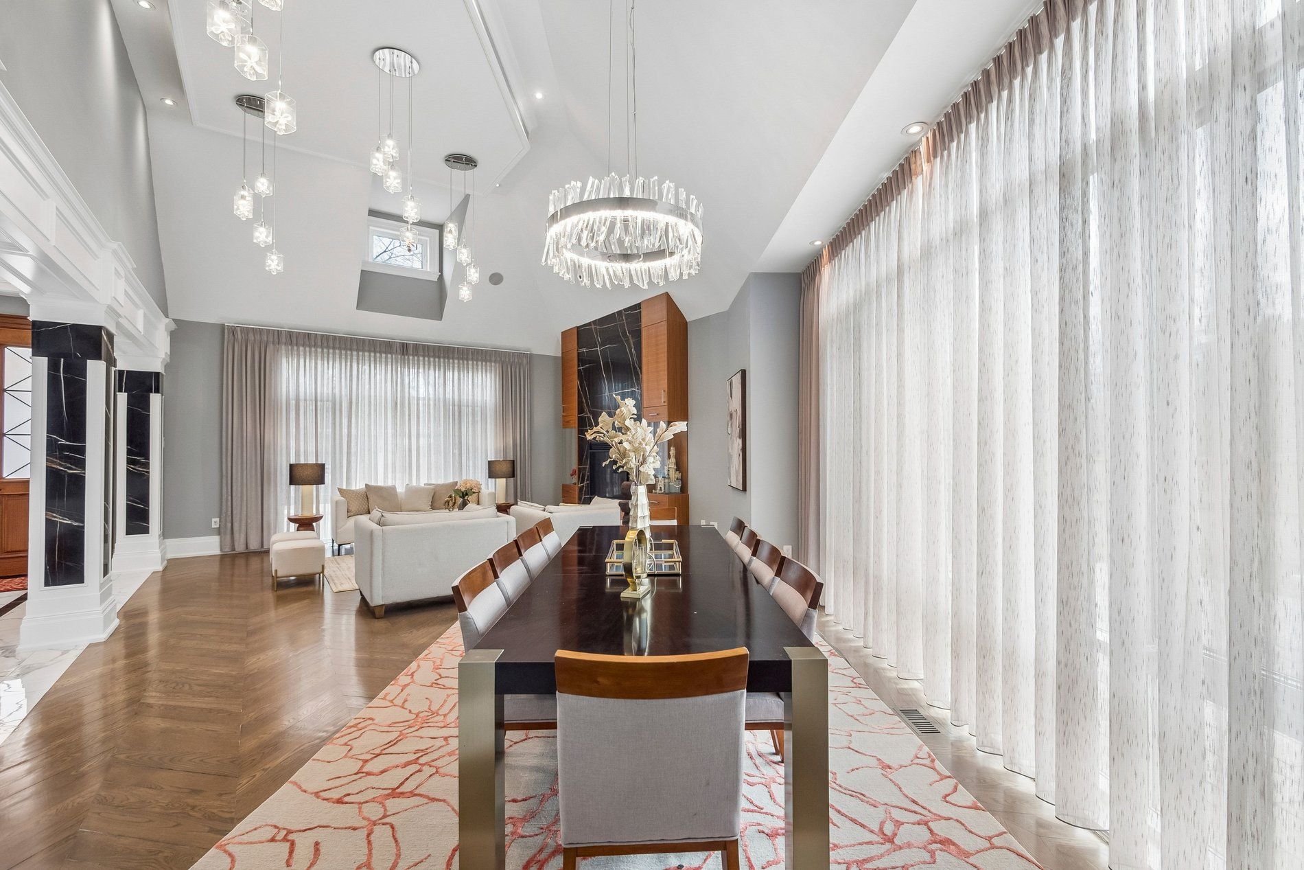 An exceptional luxury residence nestled in the prestigious unionville community, ideally situated on a quiet circle offering privacy and tranquility. This rare home features 4+ bedrooms and 7 bathrooms, with over 5,000 sq ft of refined living space (4,691 sq ft above grade plus a finished basement), perfect for large or multi-generational families. Extensively upgraded with high-quality custom enhancements throughout, the home showcases a stunning chef's kitchen complete with stainless steel appliances, custom backsplash, and premium countertops. Equipped with two furnaces for enhanced comfort and efficiency, the home also features elegant hardwood flooring across the main and second levels, complemented by sophisticated designer ceilings and a skylight that fills the space with natural light. Each bedroom is thoughtfully designed with its own ensuite, while the grand primary suite boasts an oversized custom walk-in closet. The fully finished basement, featuring a separate entrance, offers exceptional versatility with a spacious recreation area and potential for an in-law suite. Conveniently located with easy access to highways 7, 404, and 407, and just minutes from top-rated schools, shopping plazas, and everyday amenities, this remarkable home presents a rare opportunity to experience luxury living in one of unionville's most sought-after neighborhoods.