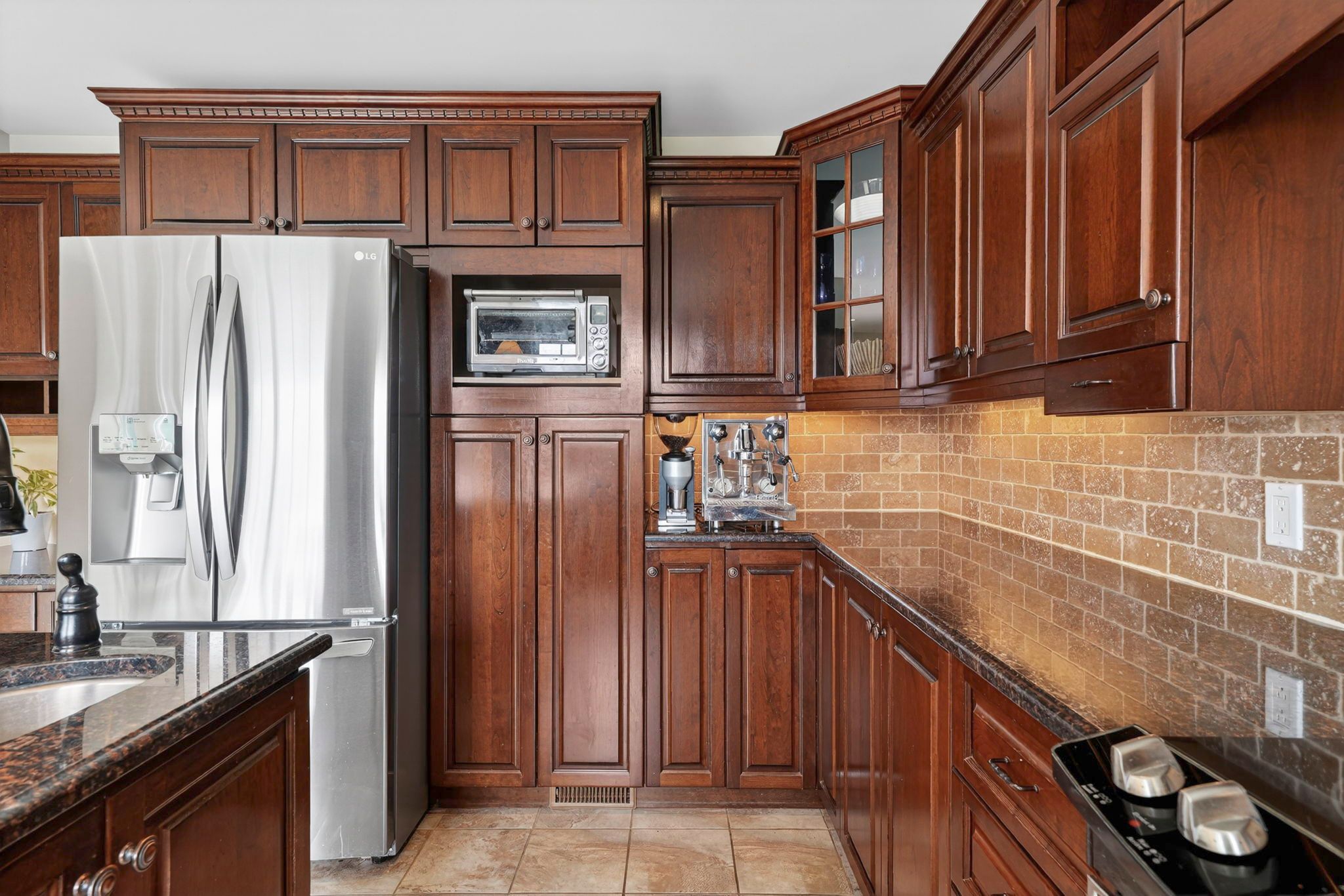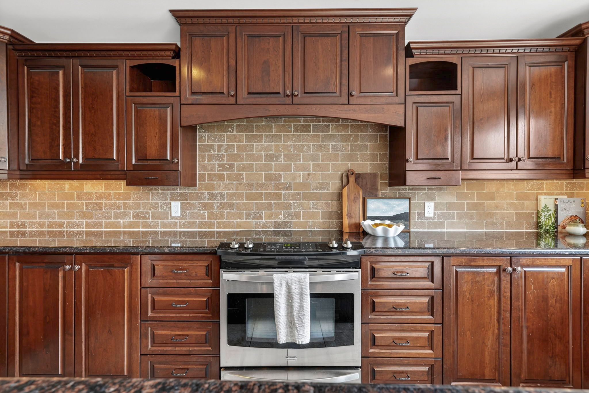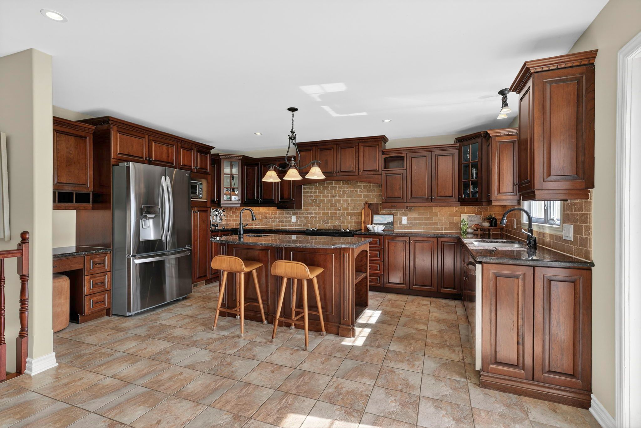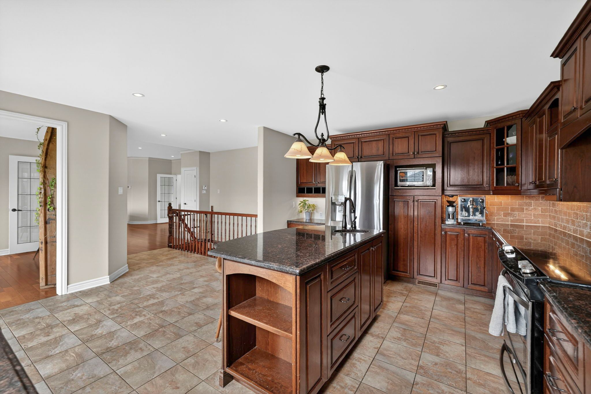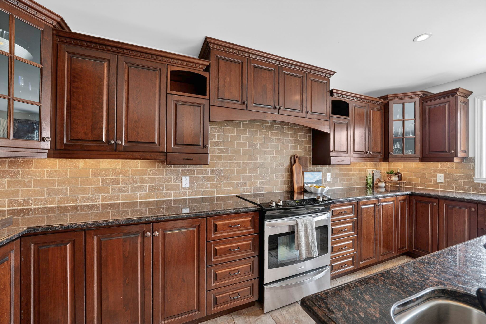 • Gourmet kitchen with granite countertops, hardwood cabinetry, and modern appliances.