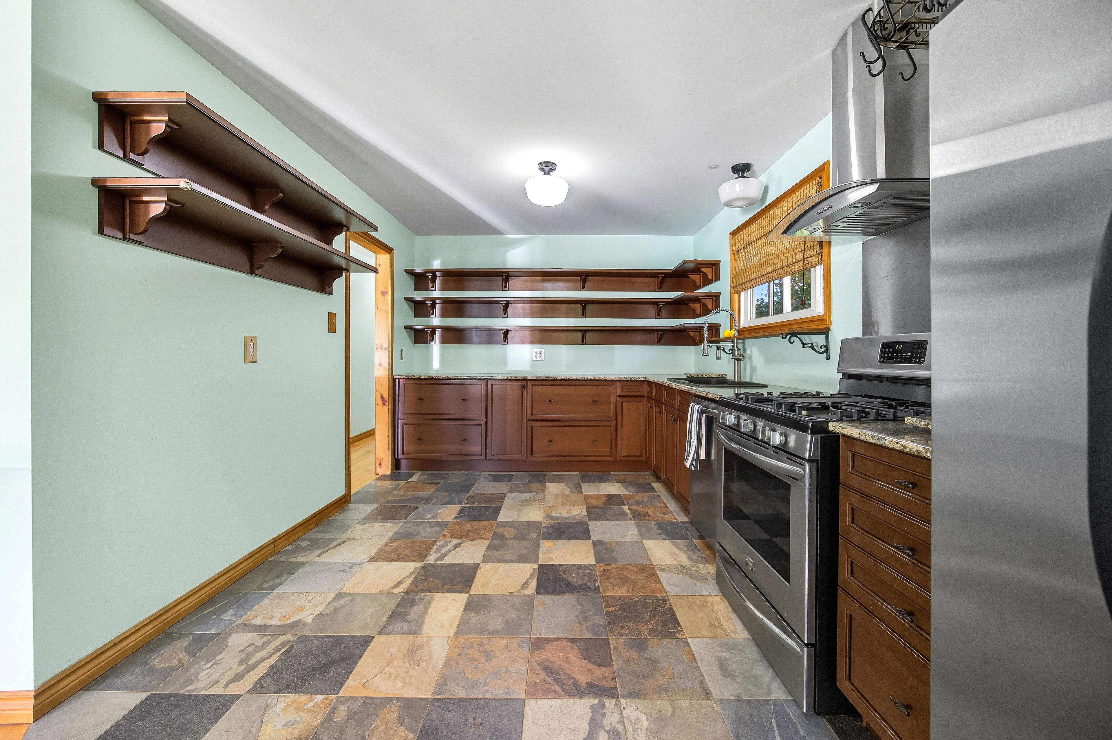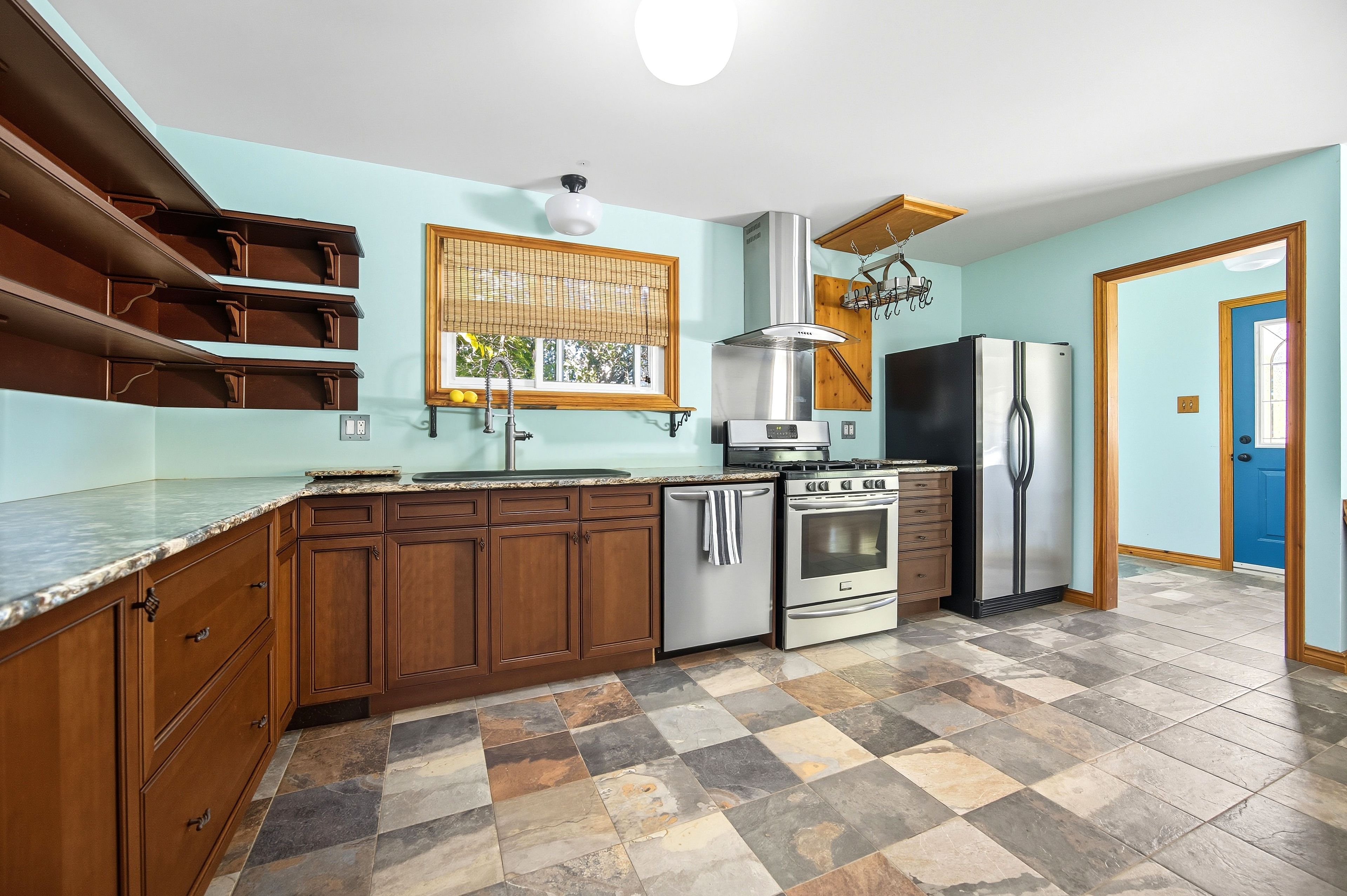 • Custom kitchen with high-end finishes and ample cabinet space.