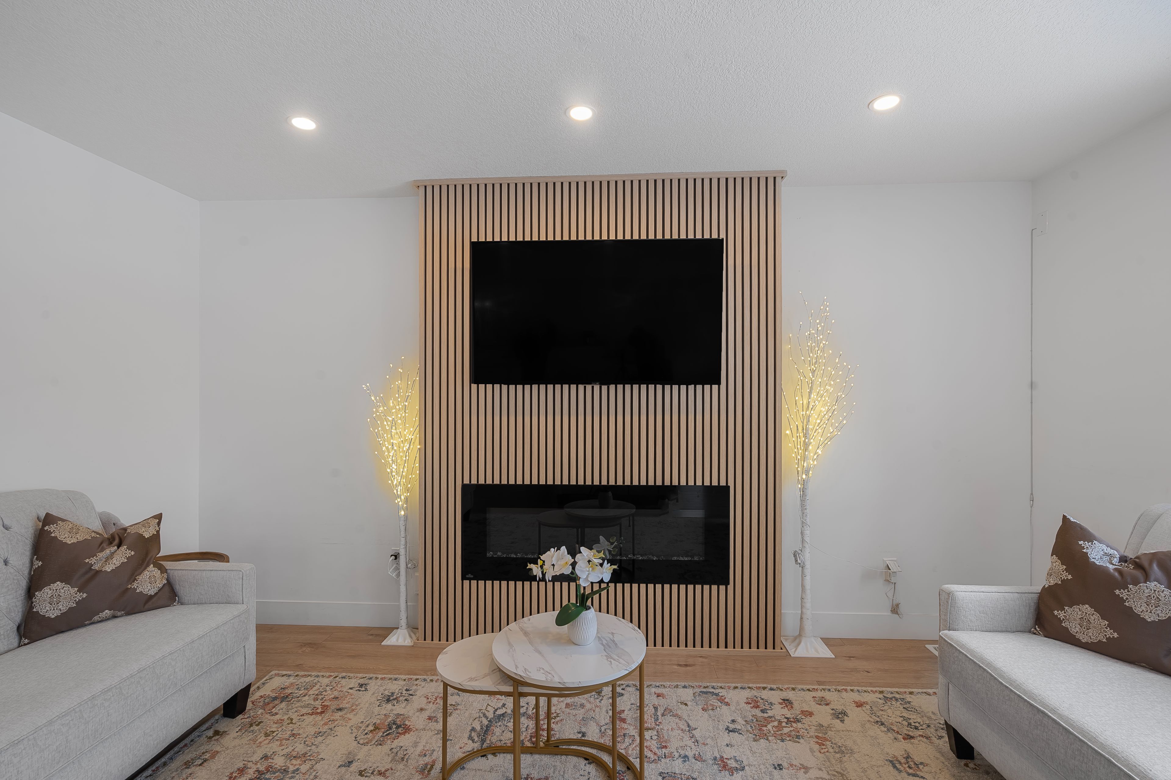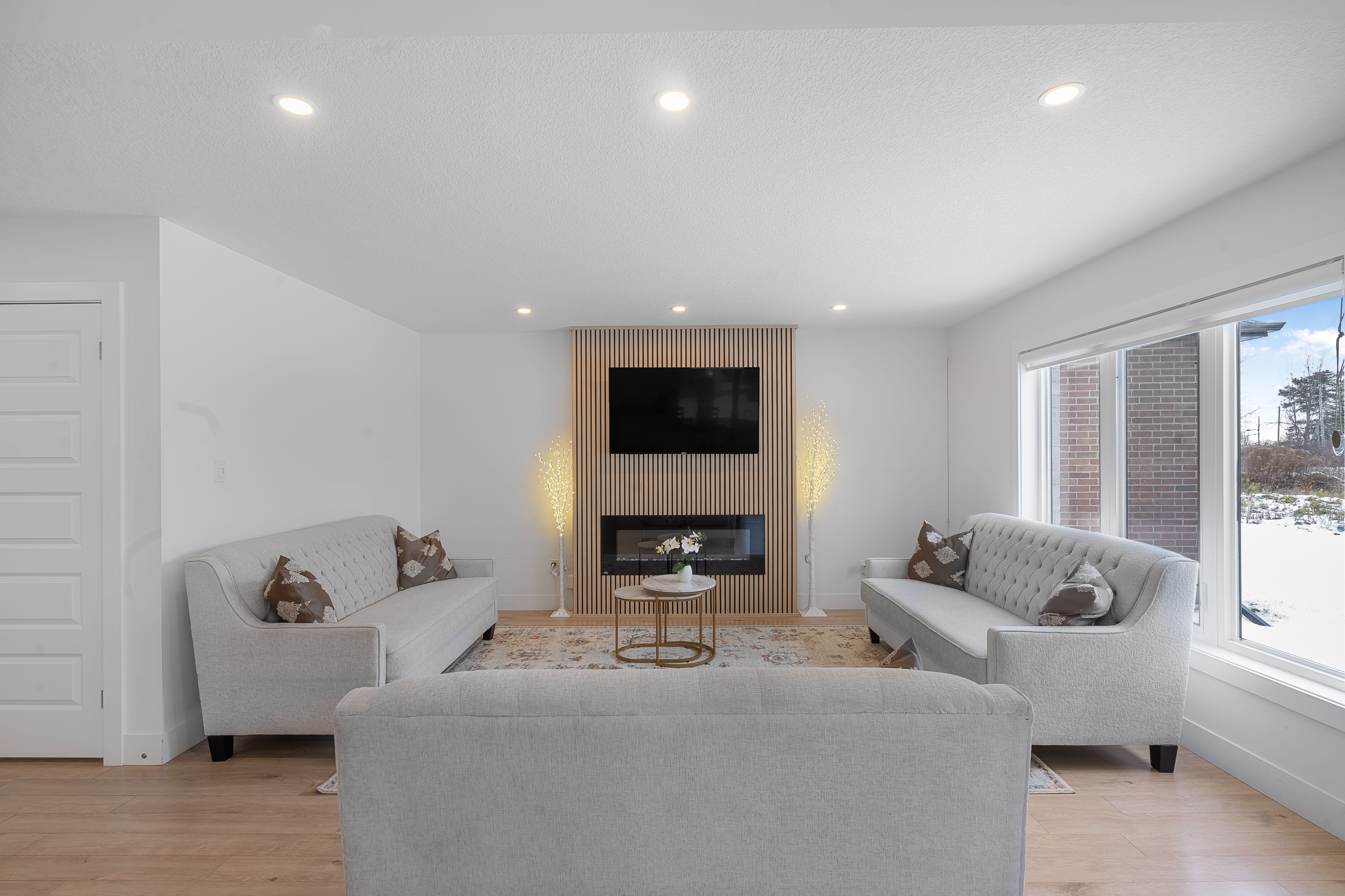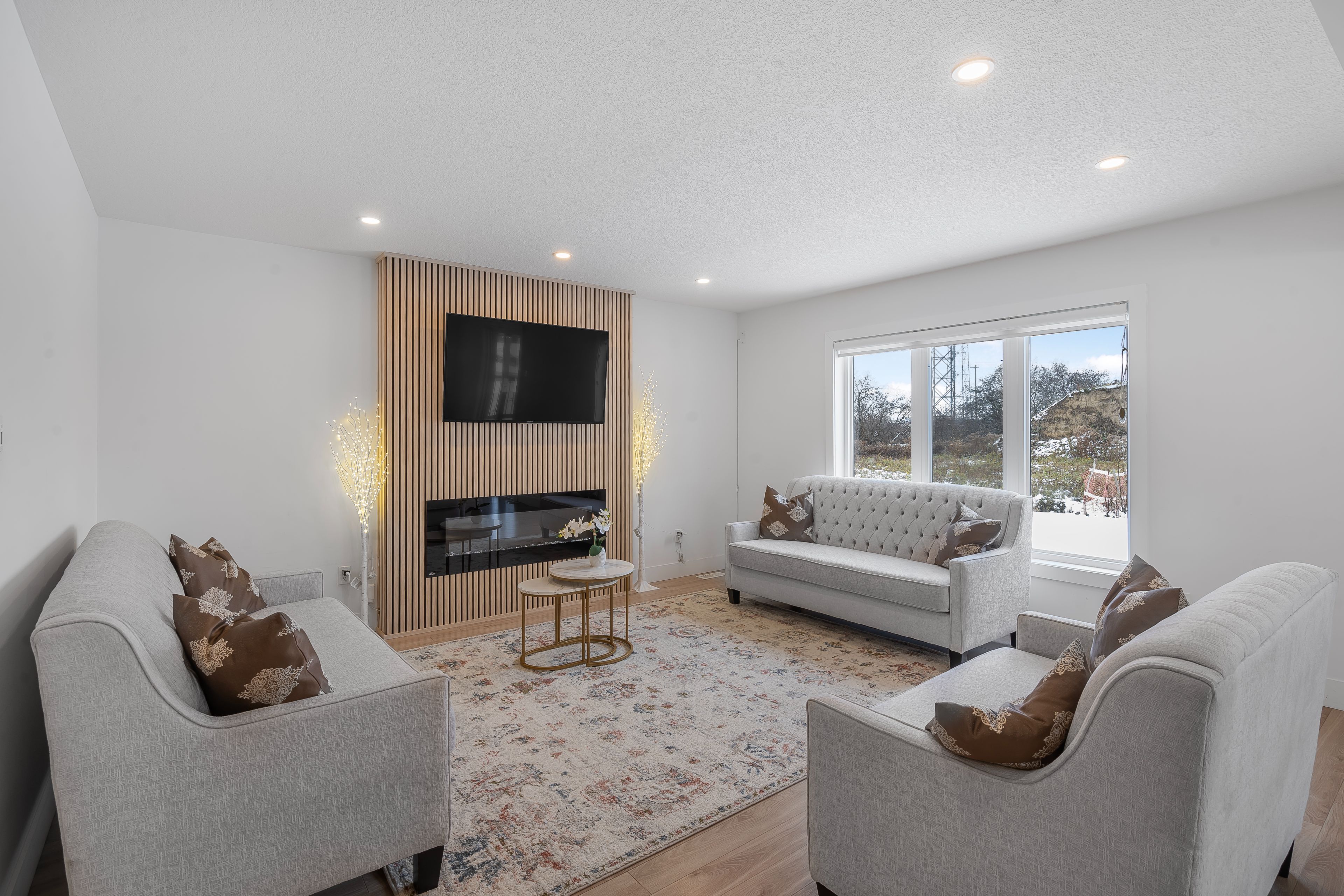 • Bright great room with electric fireplace and stylish accent wall.