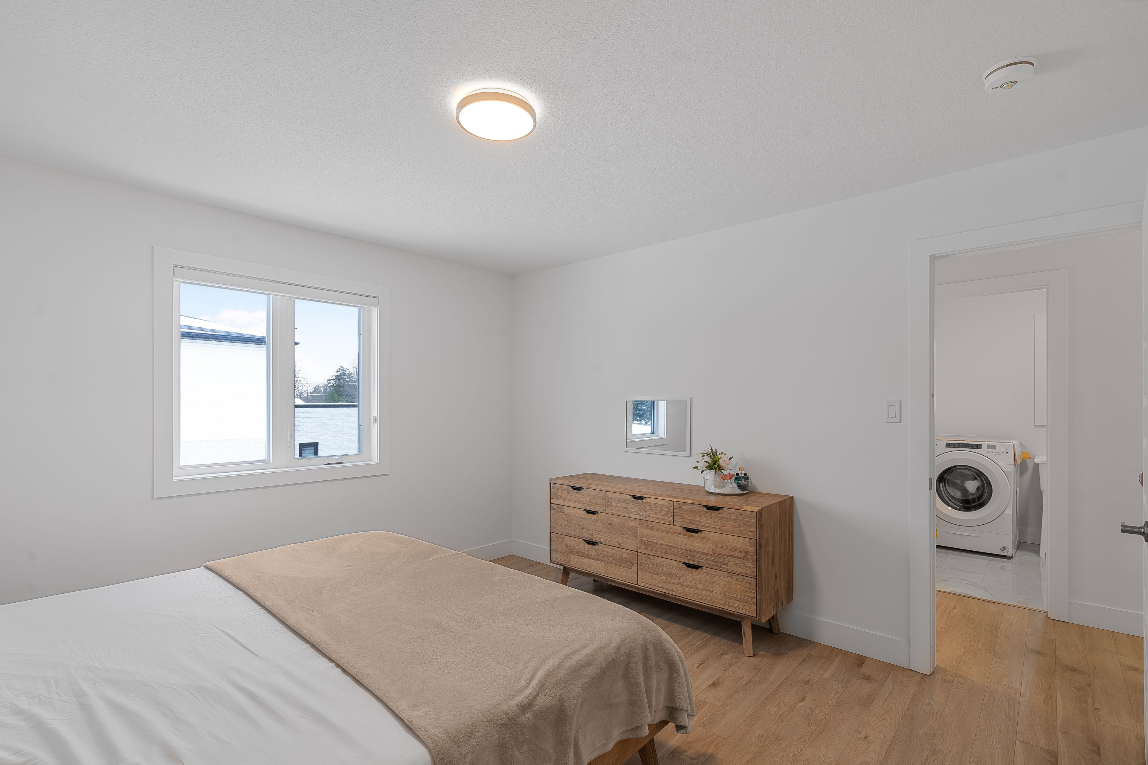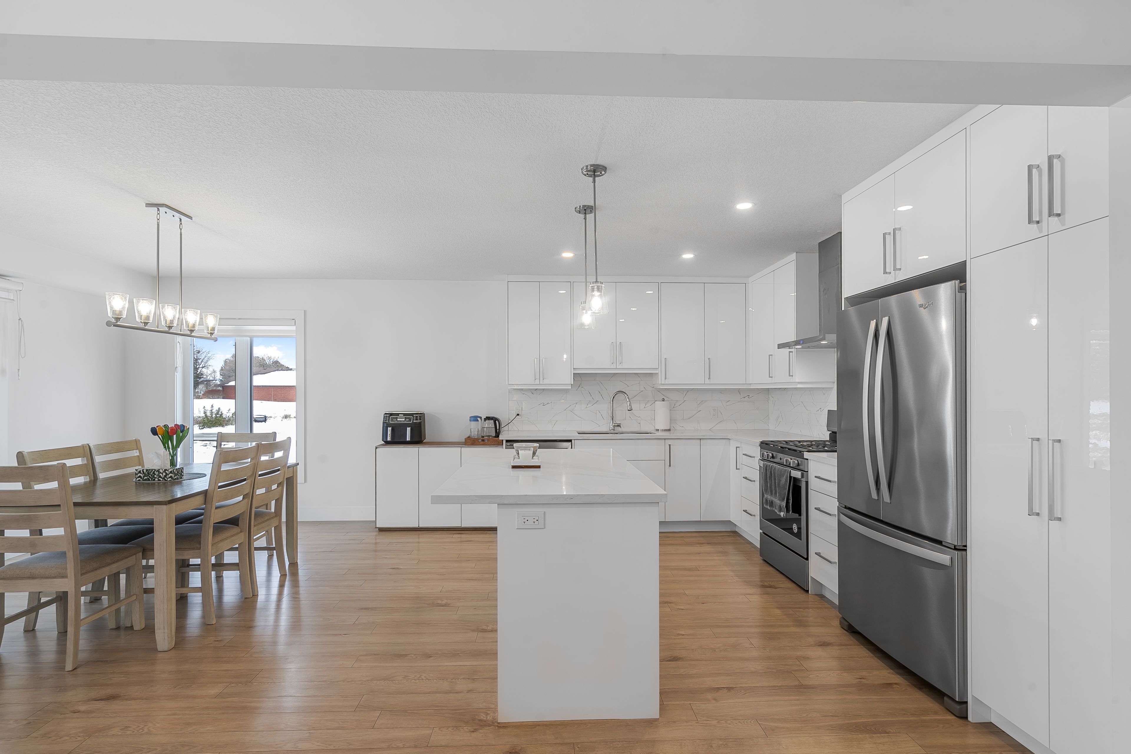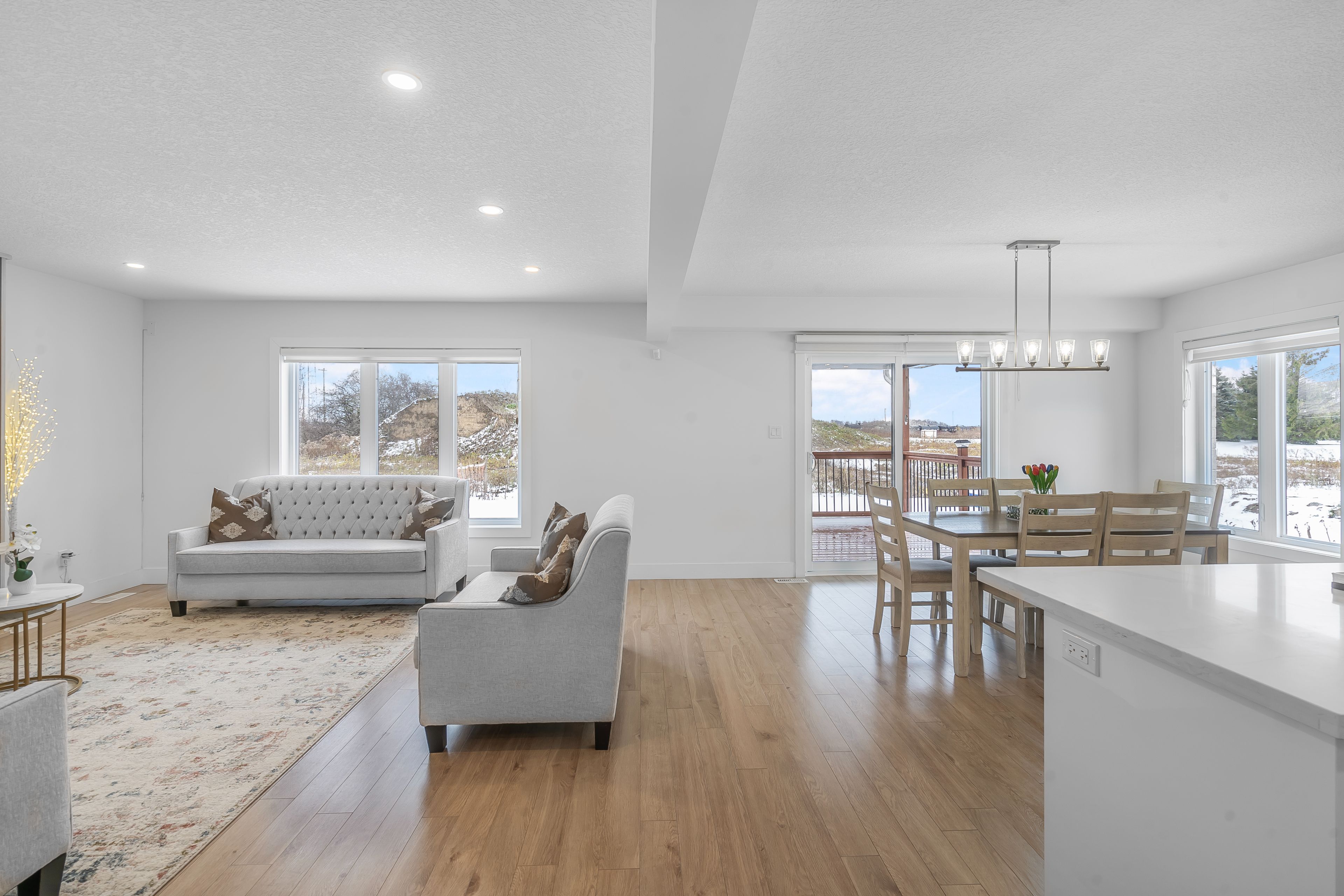 • Bright great room with electric fireplace and stylish accent wall.