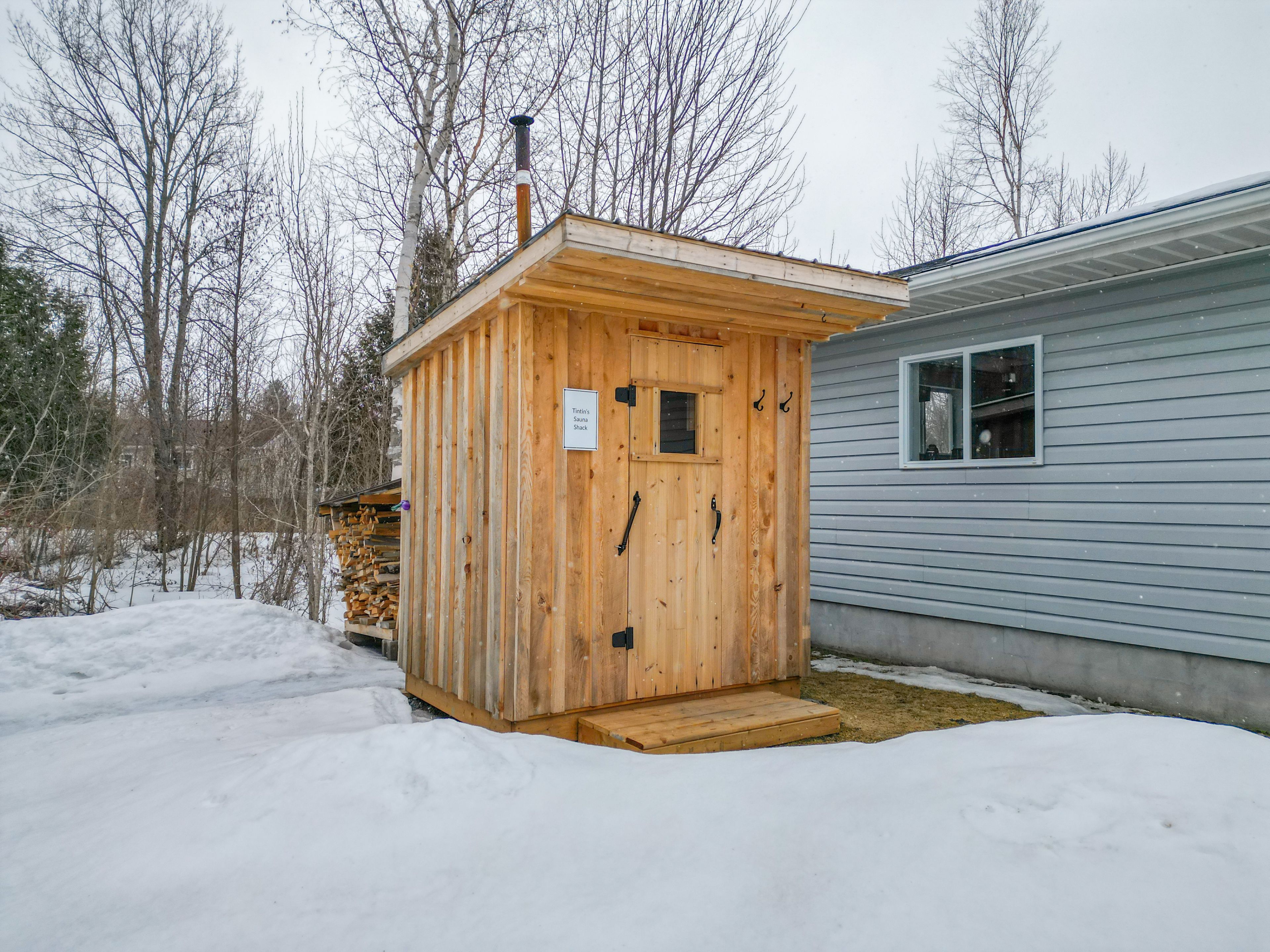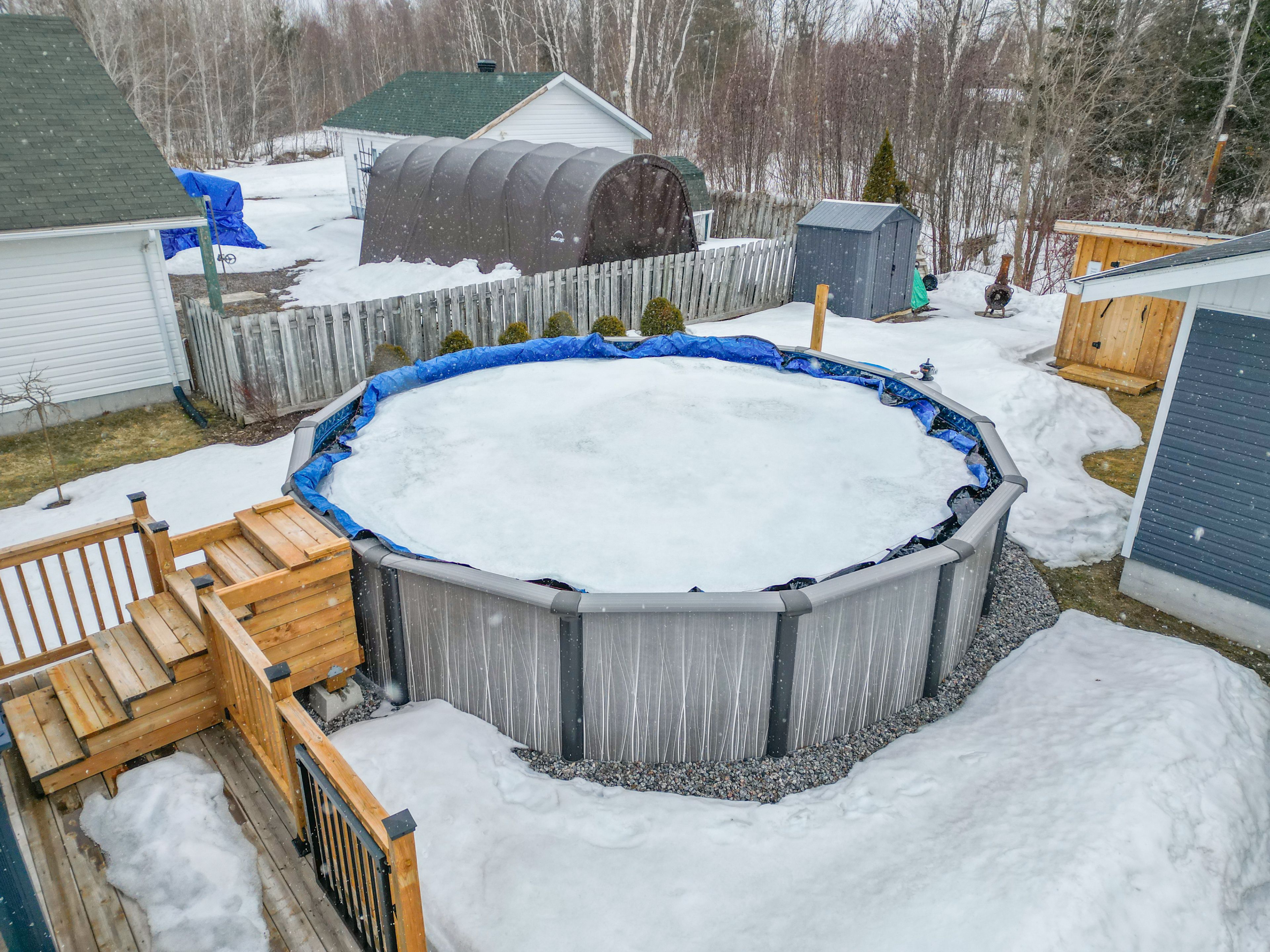 • Private yard featuring a heated above-ground pool and built-in sauna.