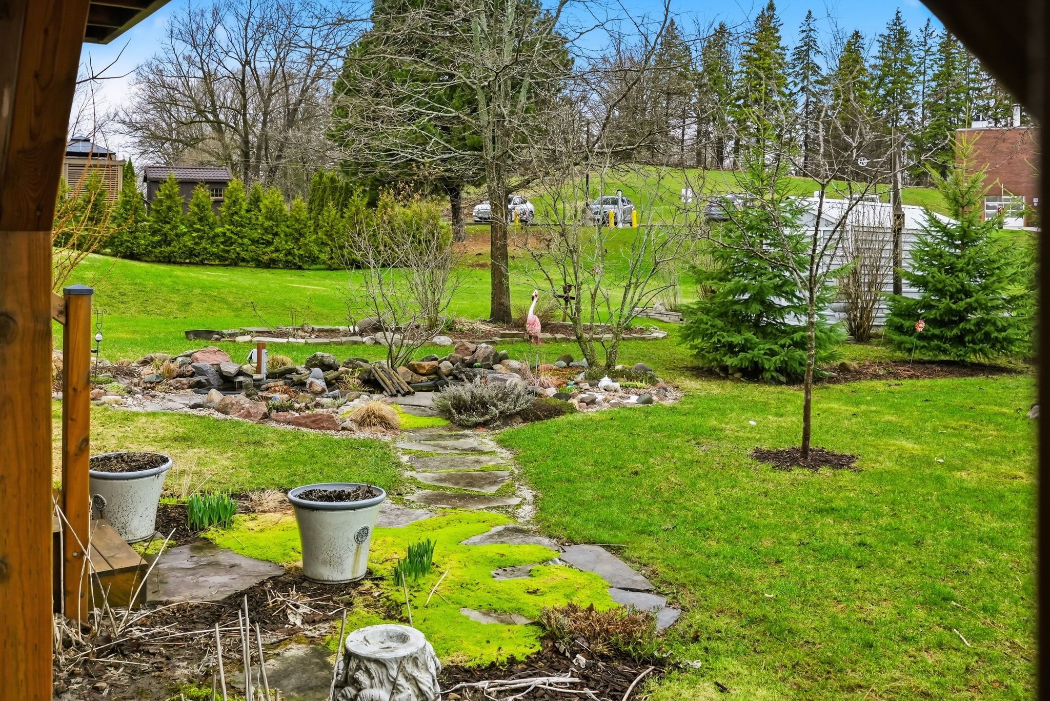 • Private backyard oasis with a deck, pond, and beautiful landscaping.