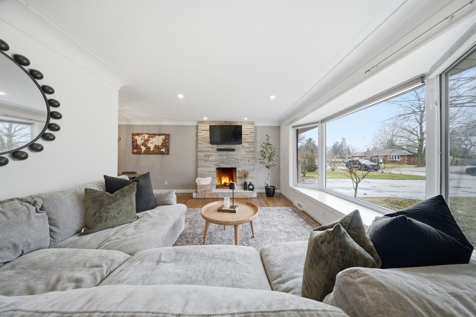 • Bright living room with a beautiful bay window and natural light.