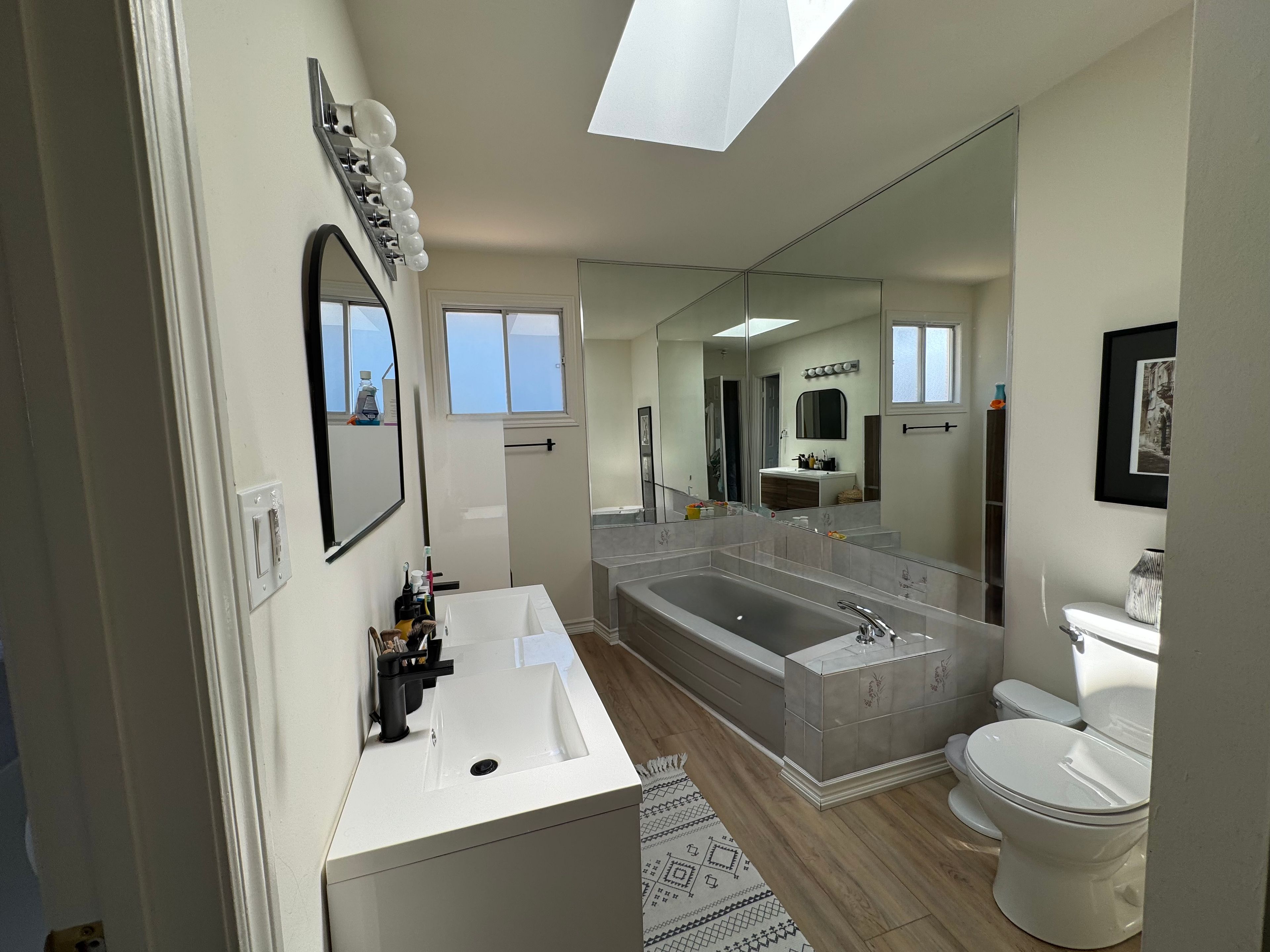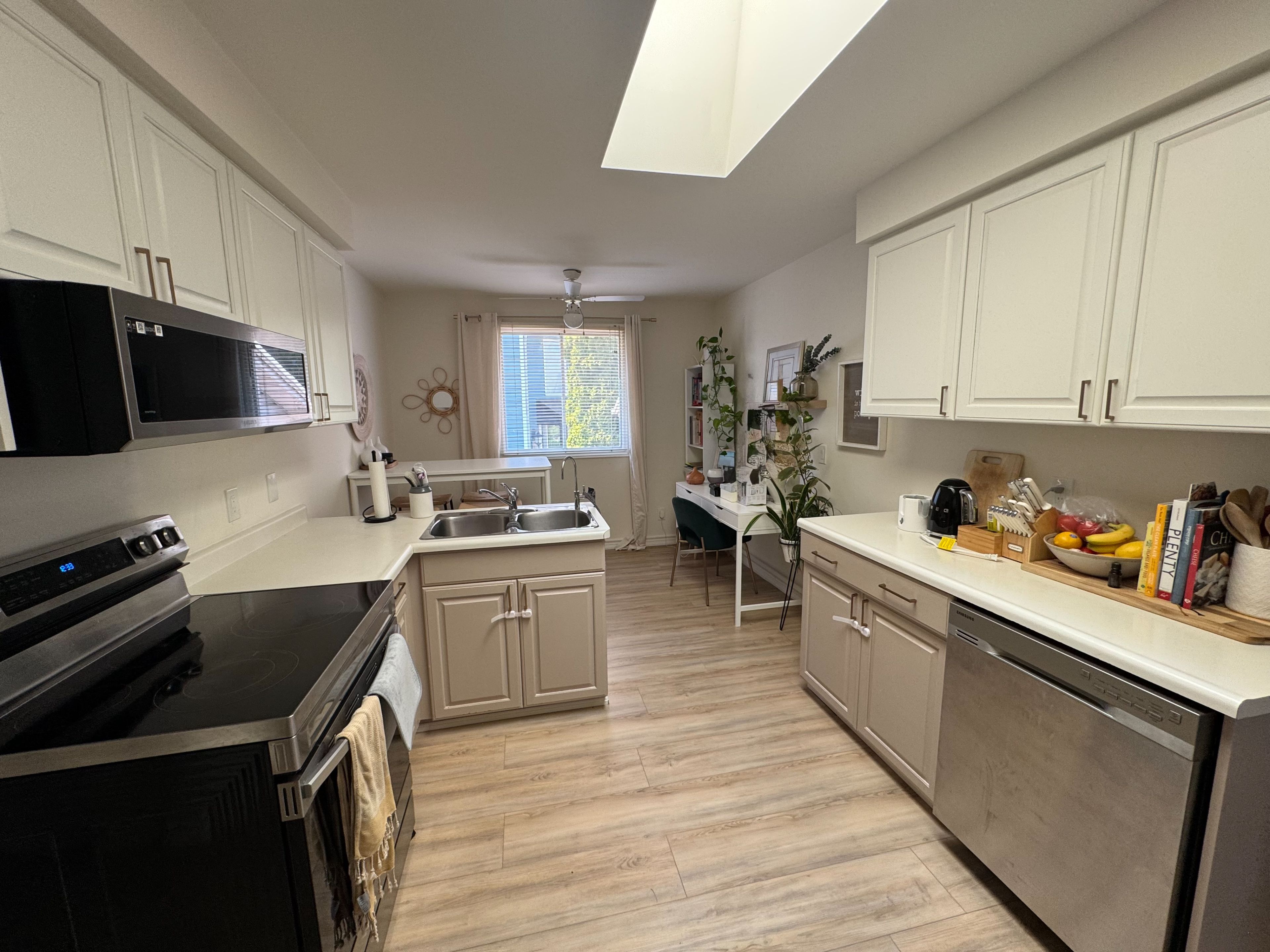 • Spacious open-concept living and dining area with skylights.