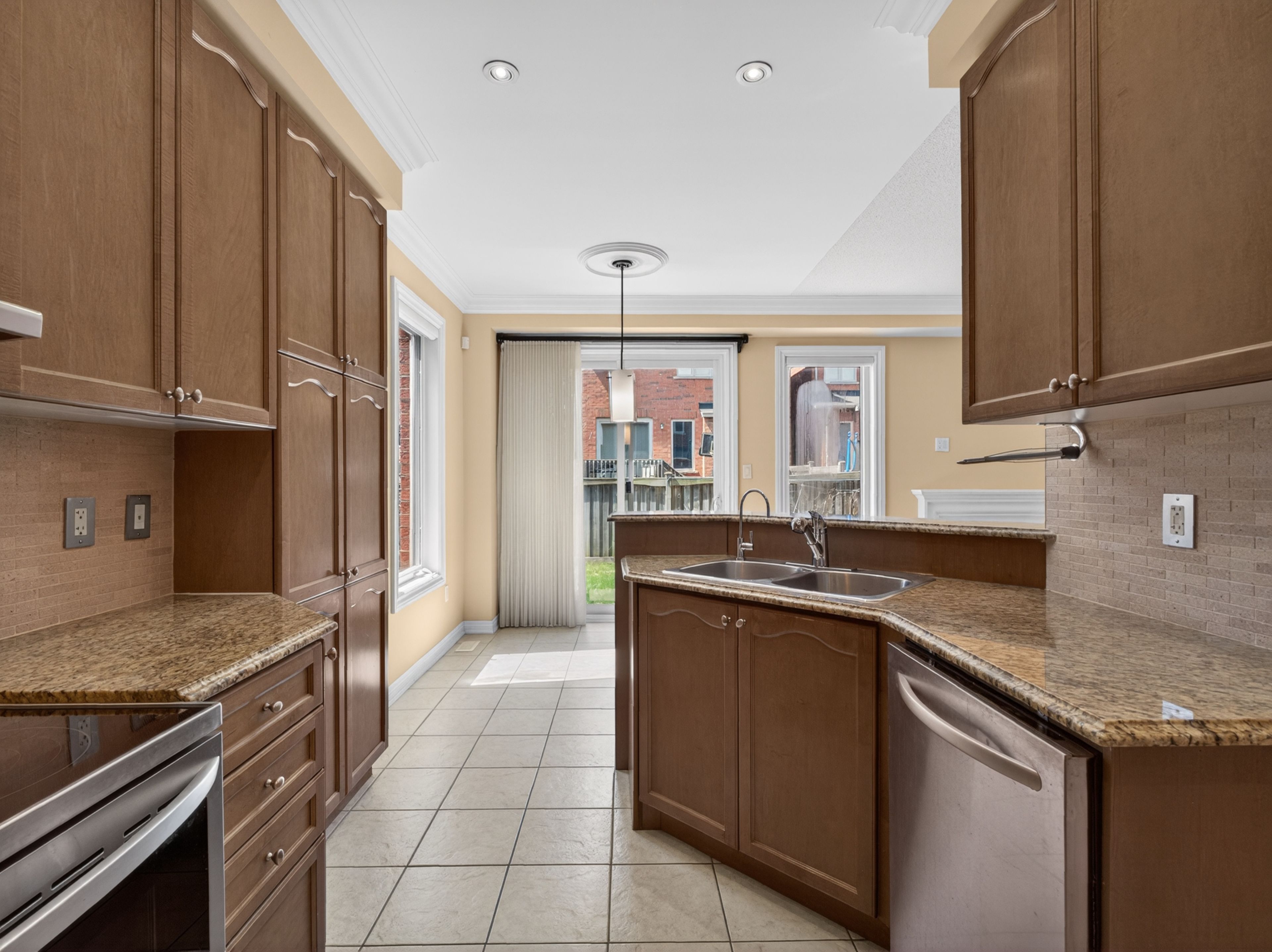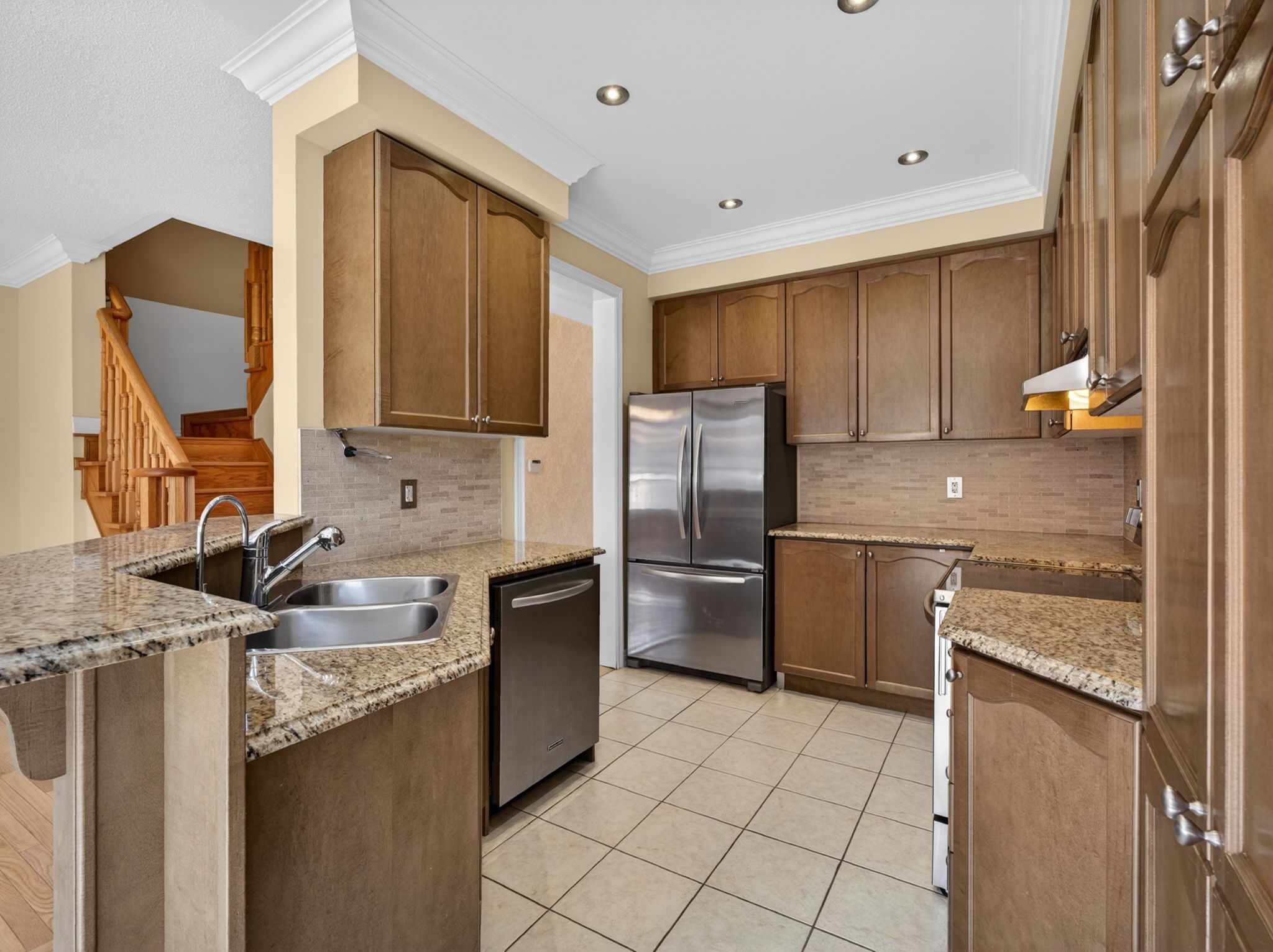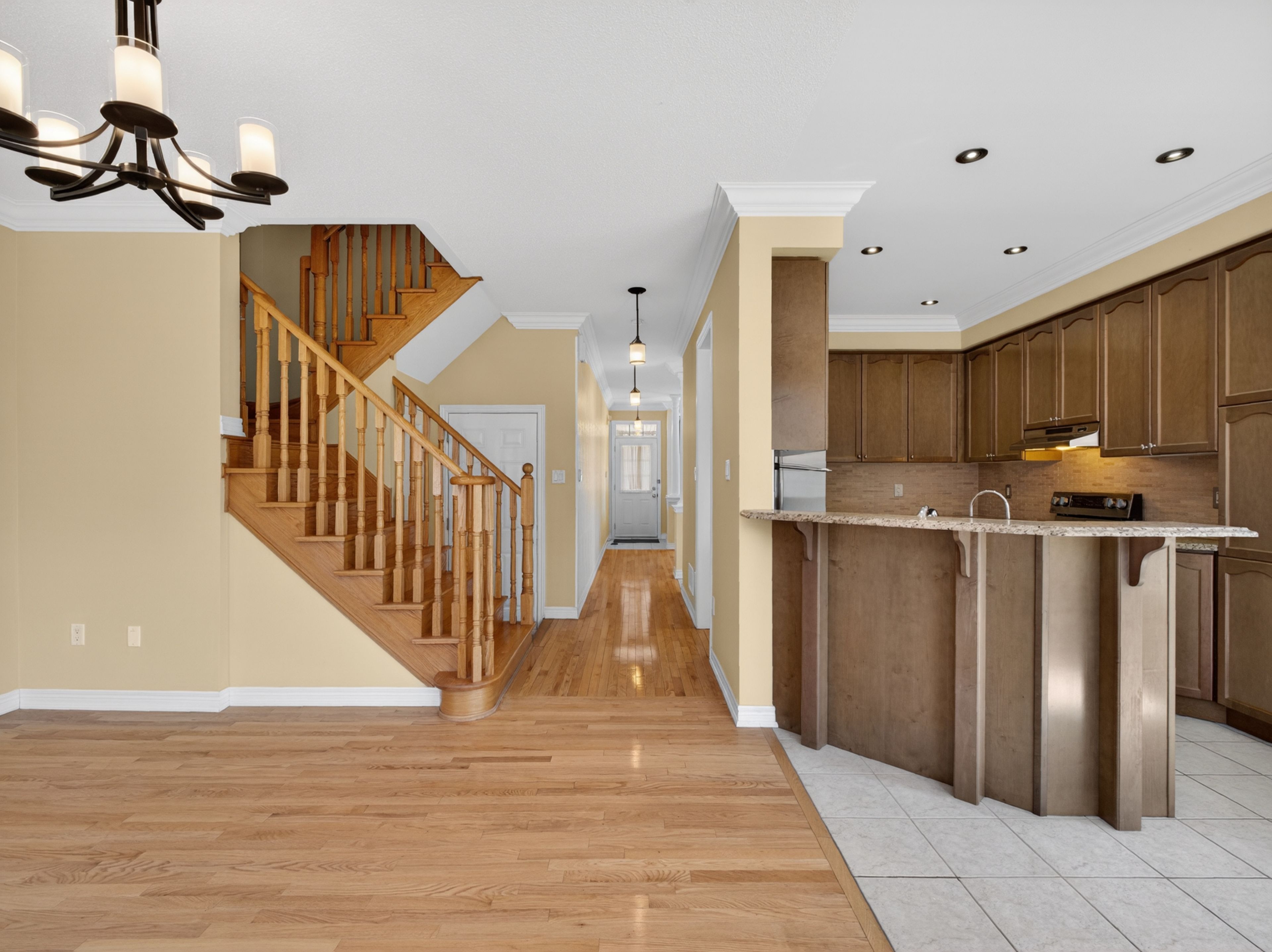 • Stylishly upgraded end-unit townhouse with appealing stone and stucco exterior.