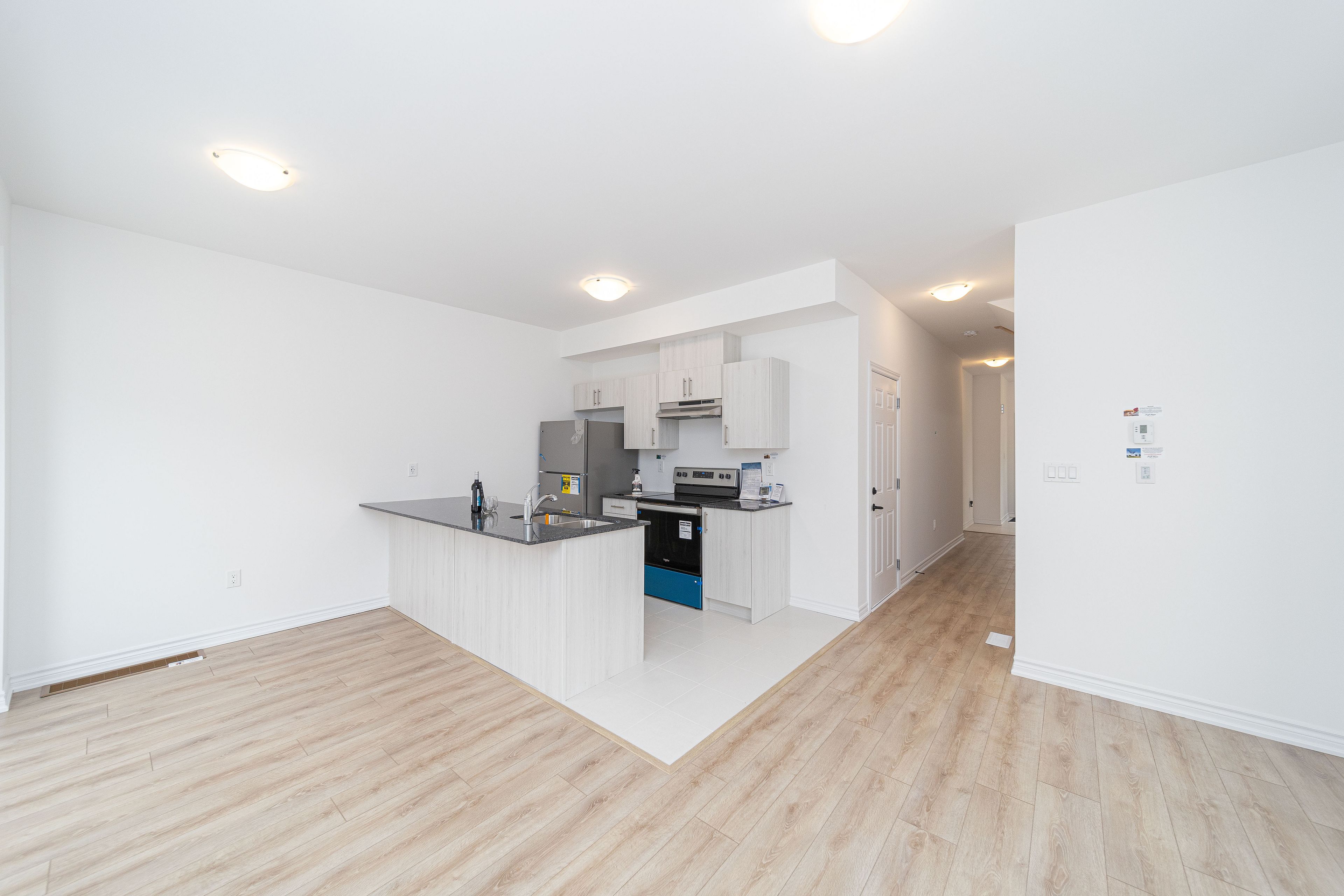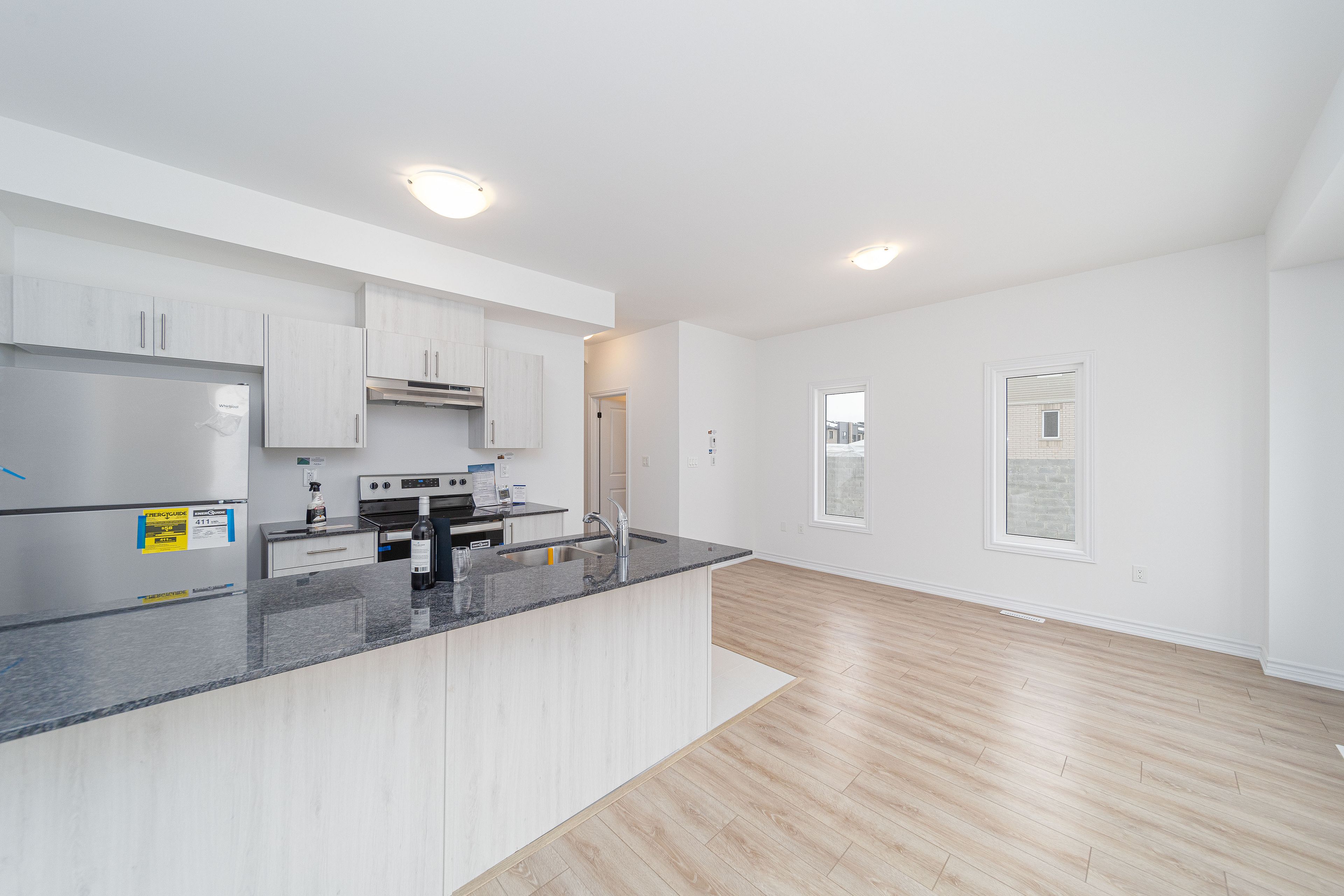• Modern features like hardwood staircase, vinyl flooring, and granite countertops.