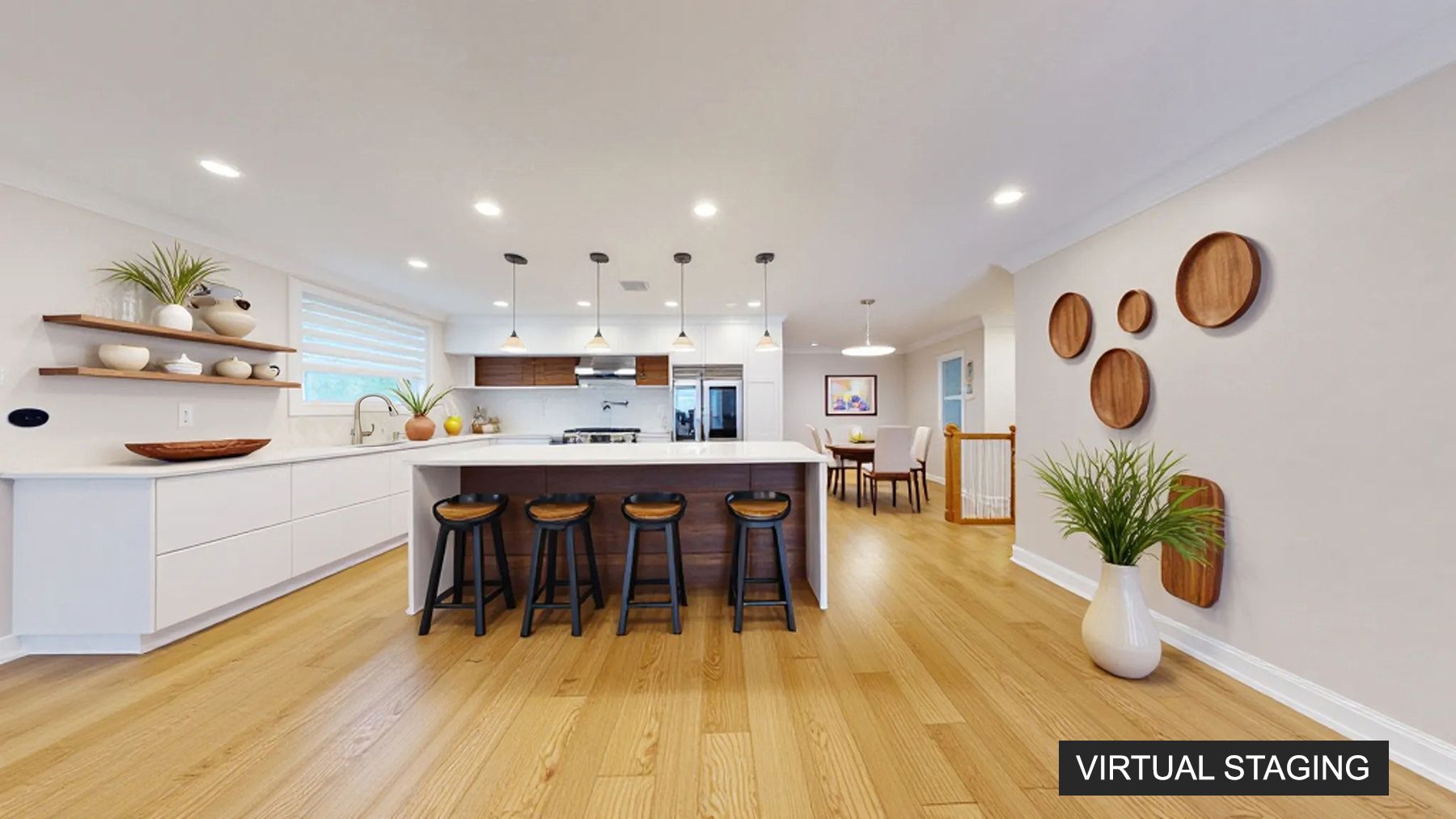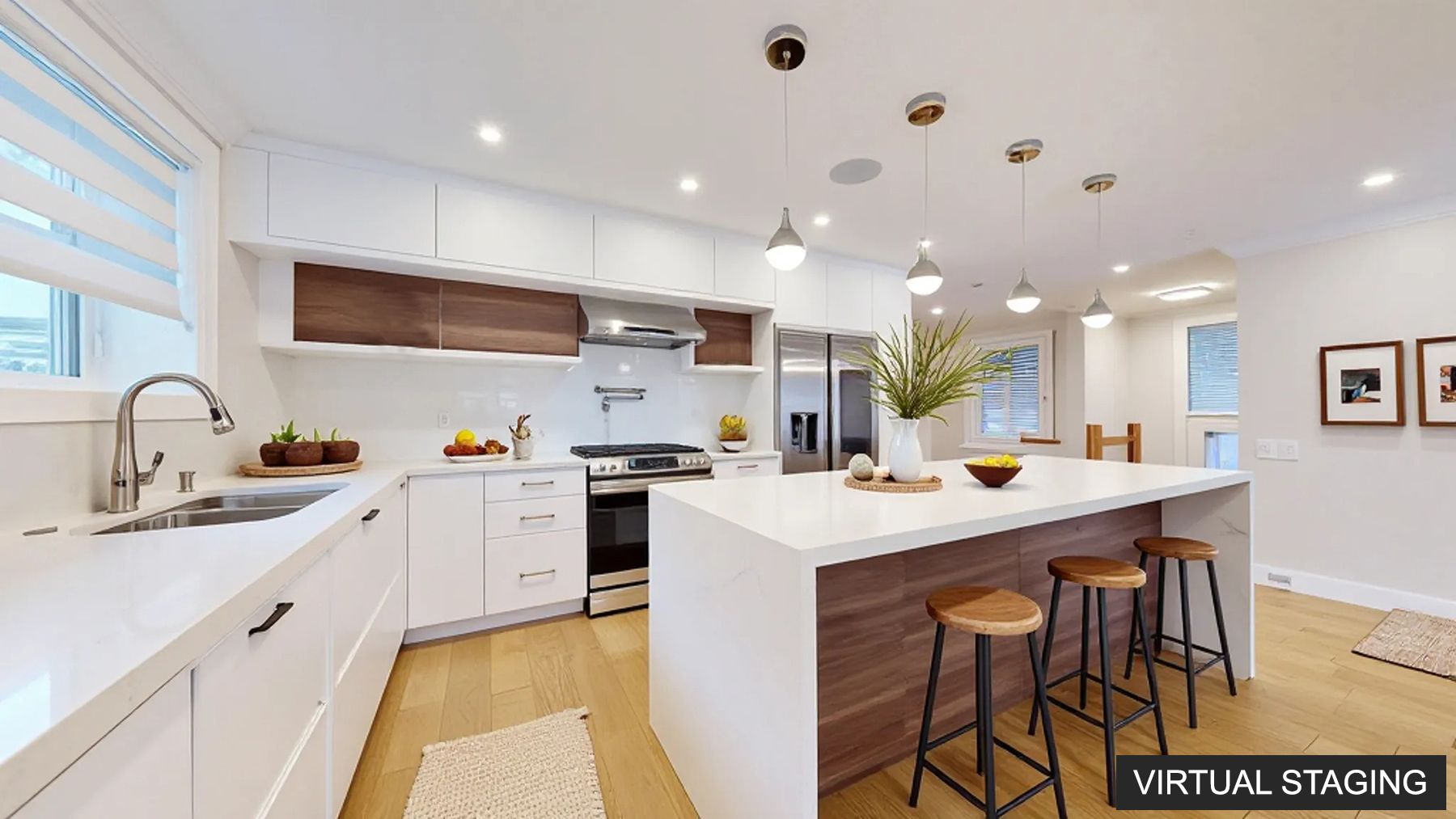 • Beautiful kitchen with a large white quartz island and stainless steel appliances.