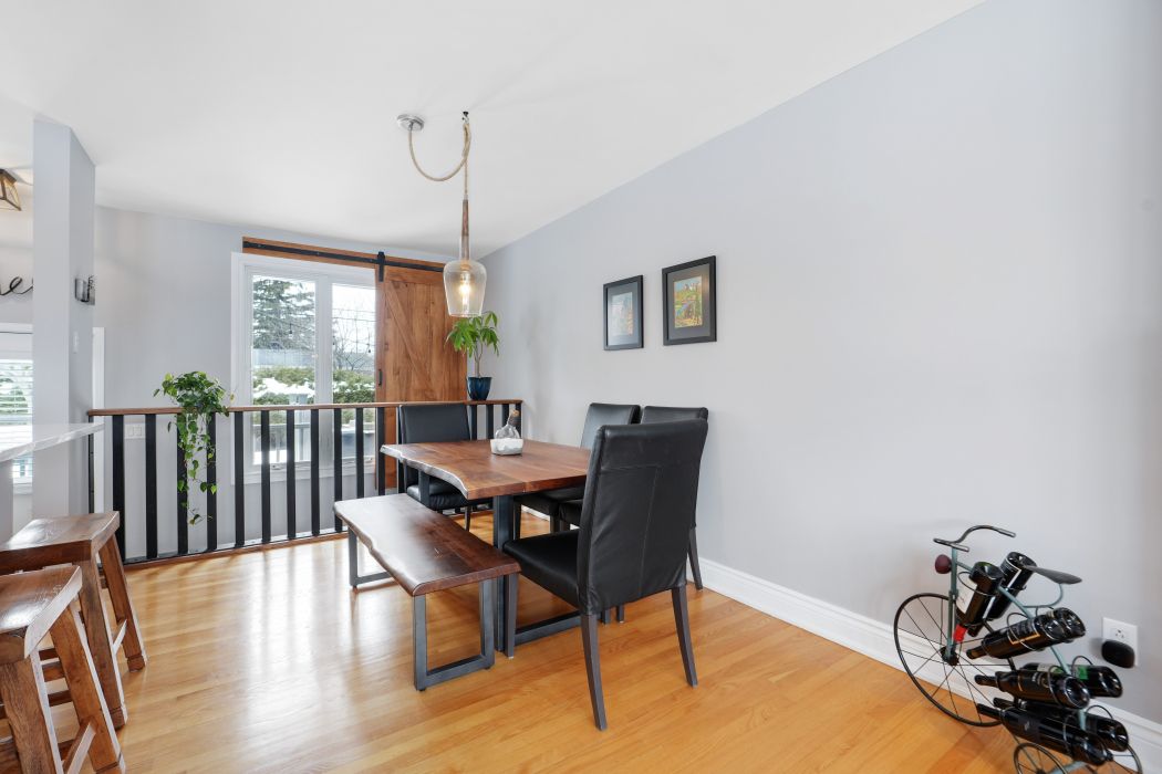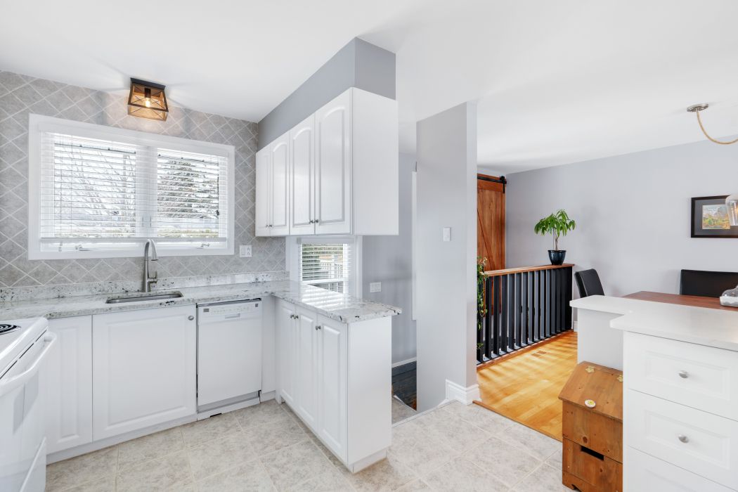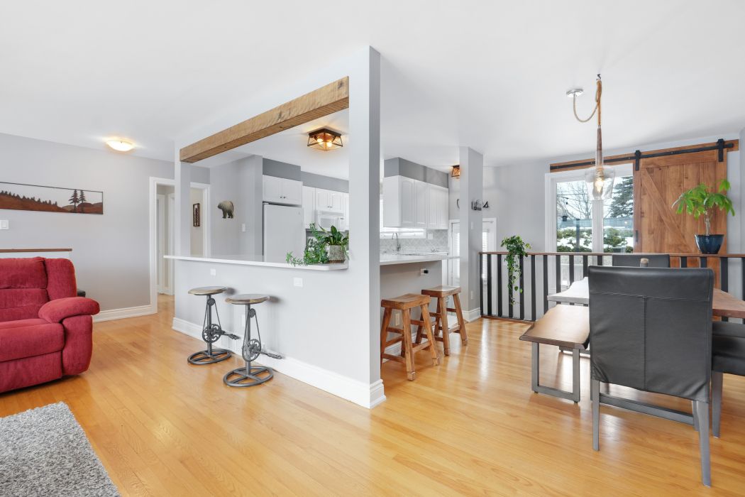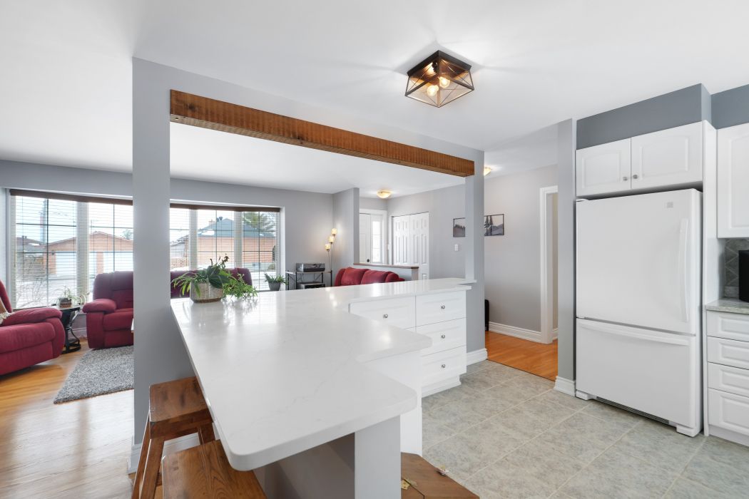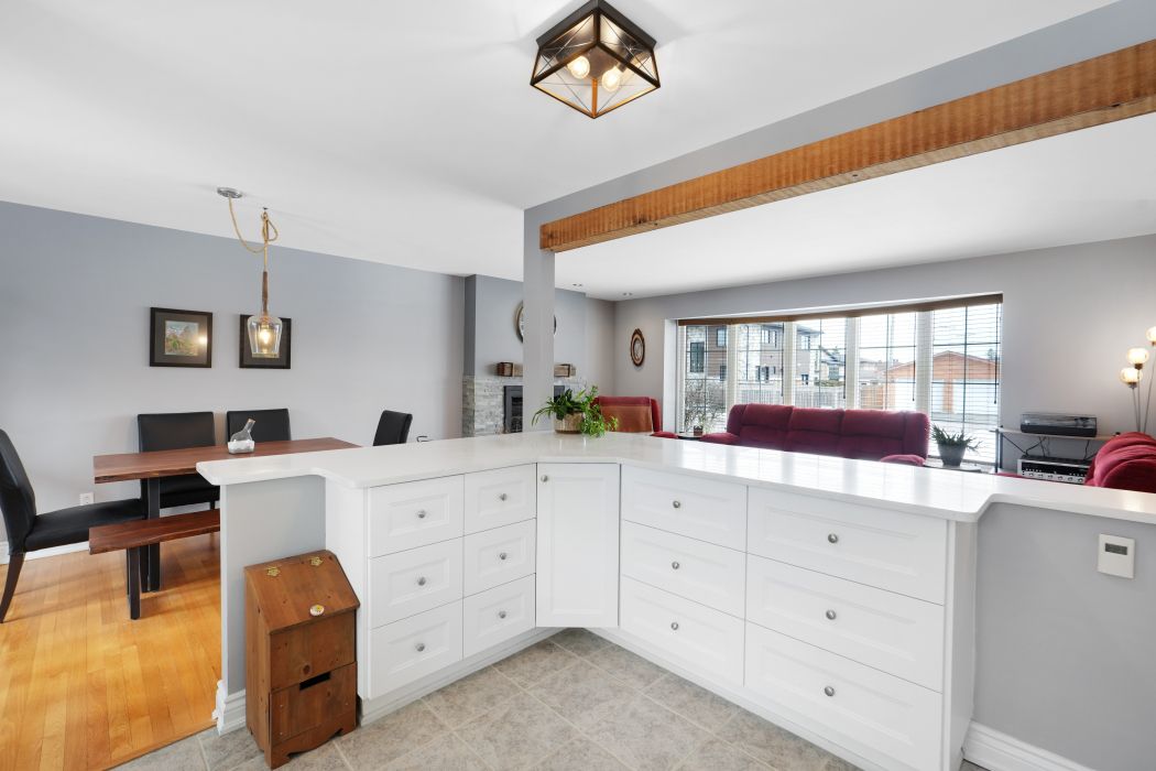 • Stylish kitchen with heated floors and breakfast bar flowing into dining area.