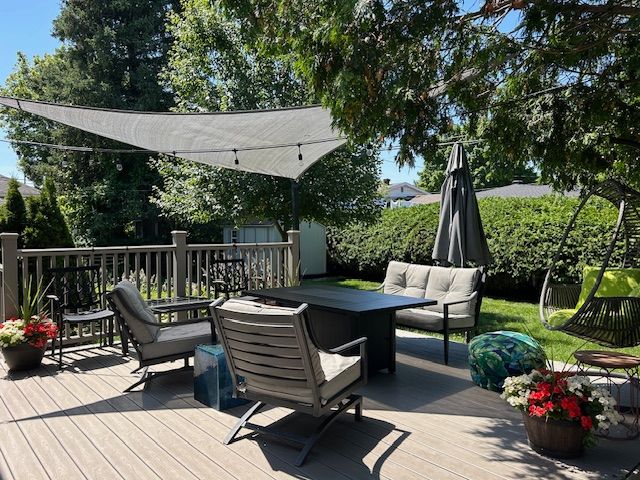 • Private backyard oasis featuring a large deck surrounded by lush gardens.