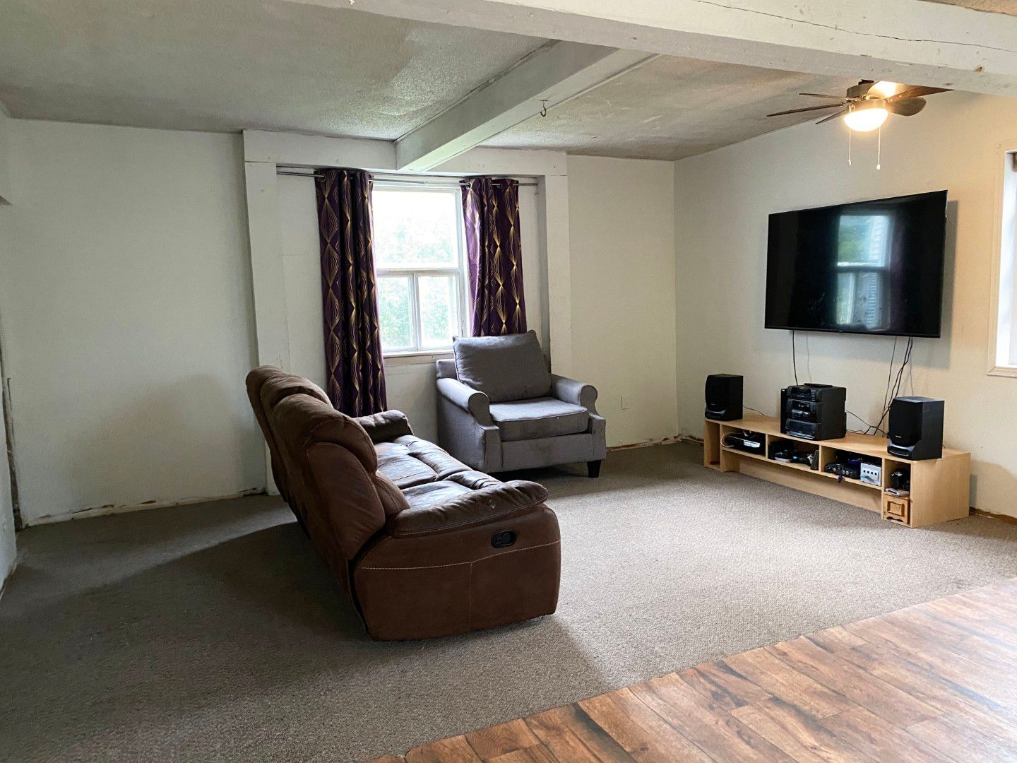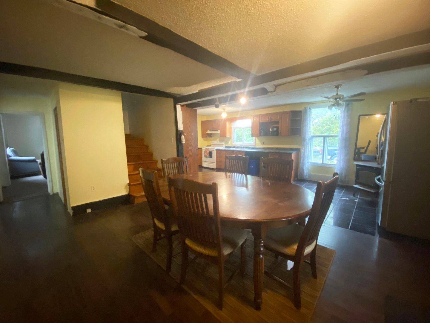 • Spacious rooms with wood beams and a welcoming front porch for relaxation.