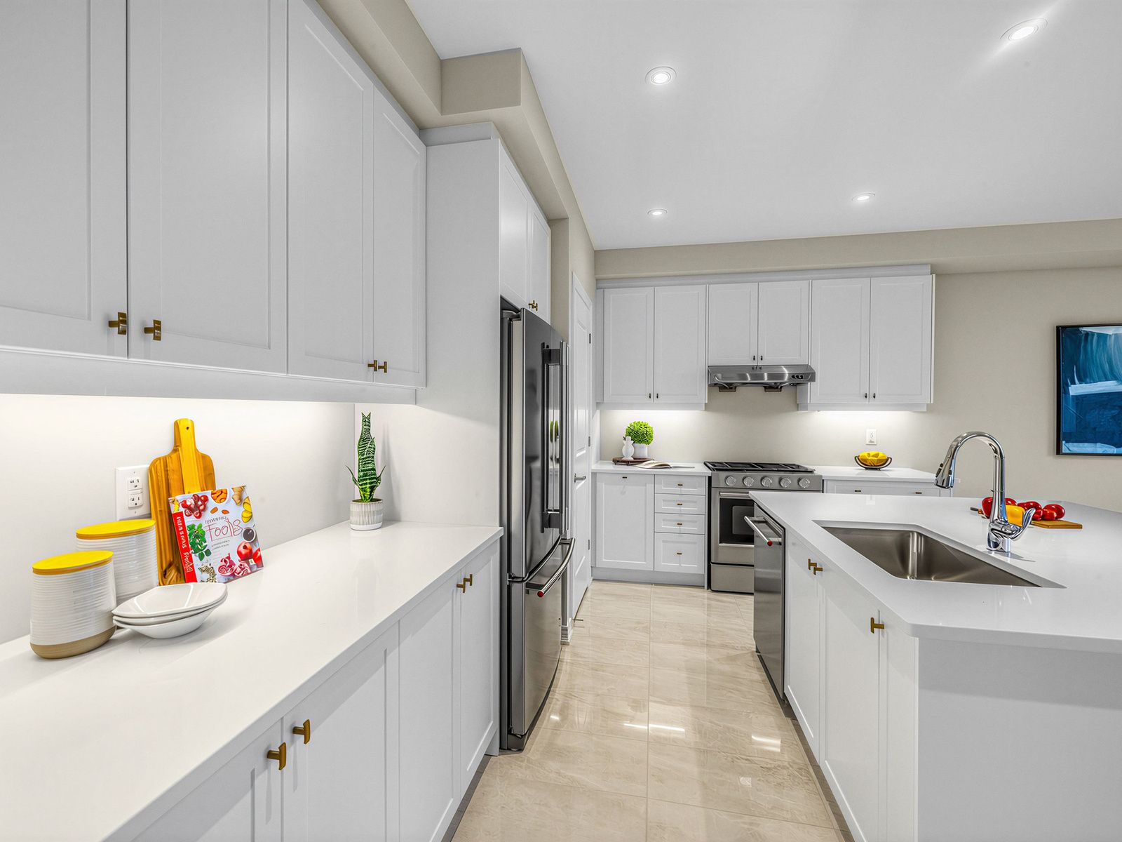 • Modern kitchen with quartz countertops and stainless steel appliances.