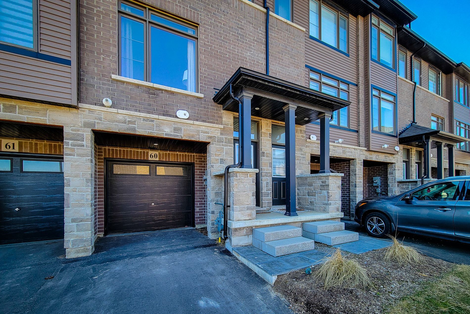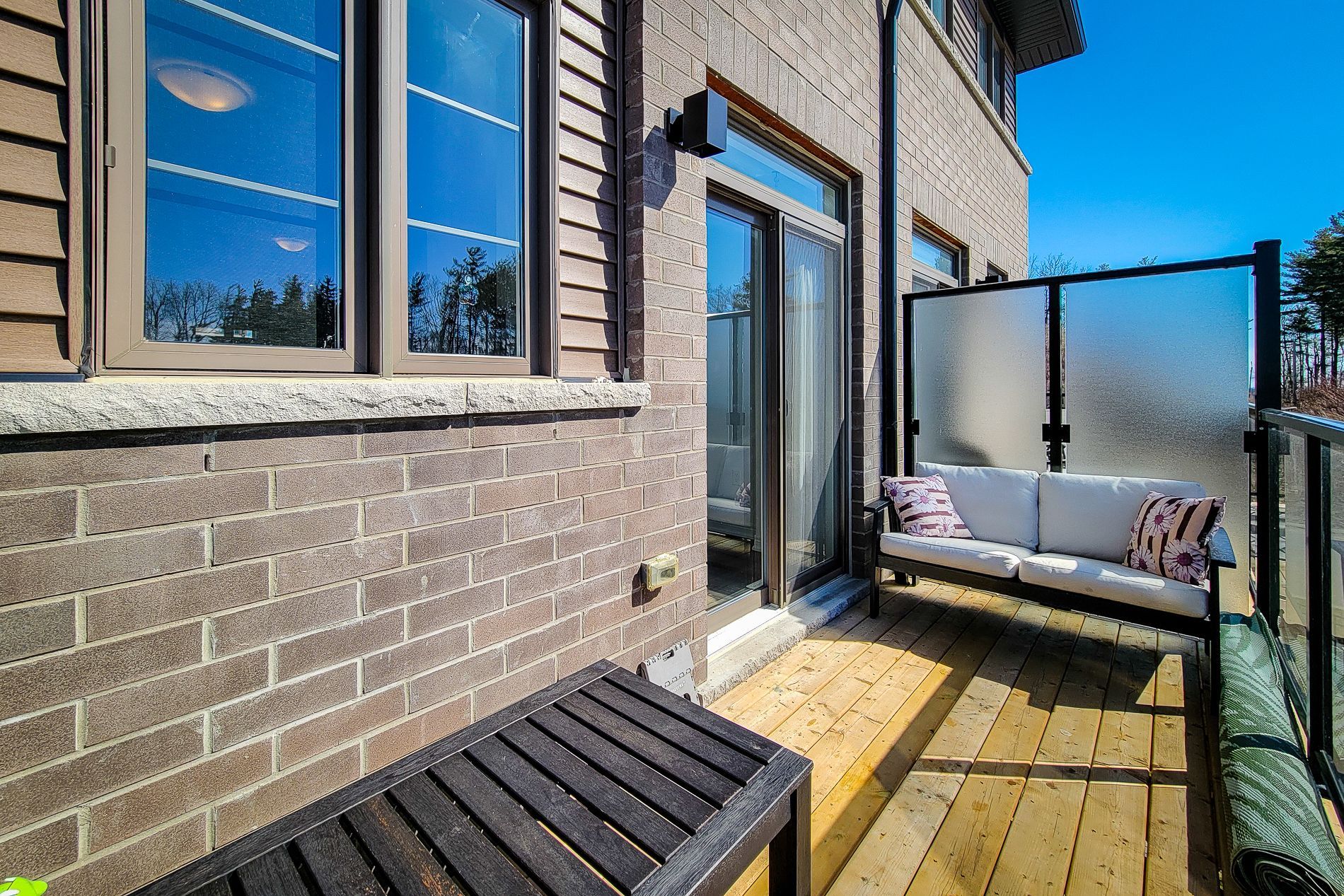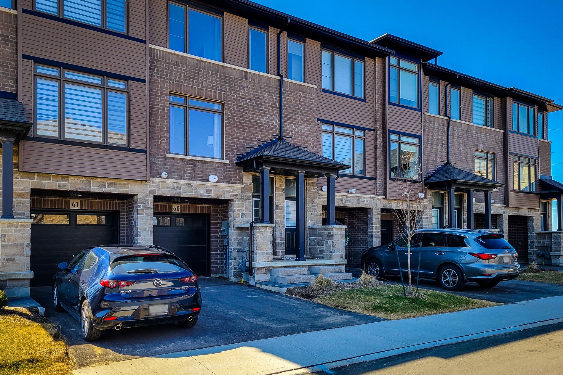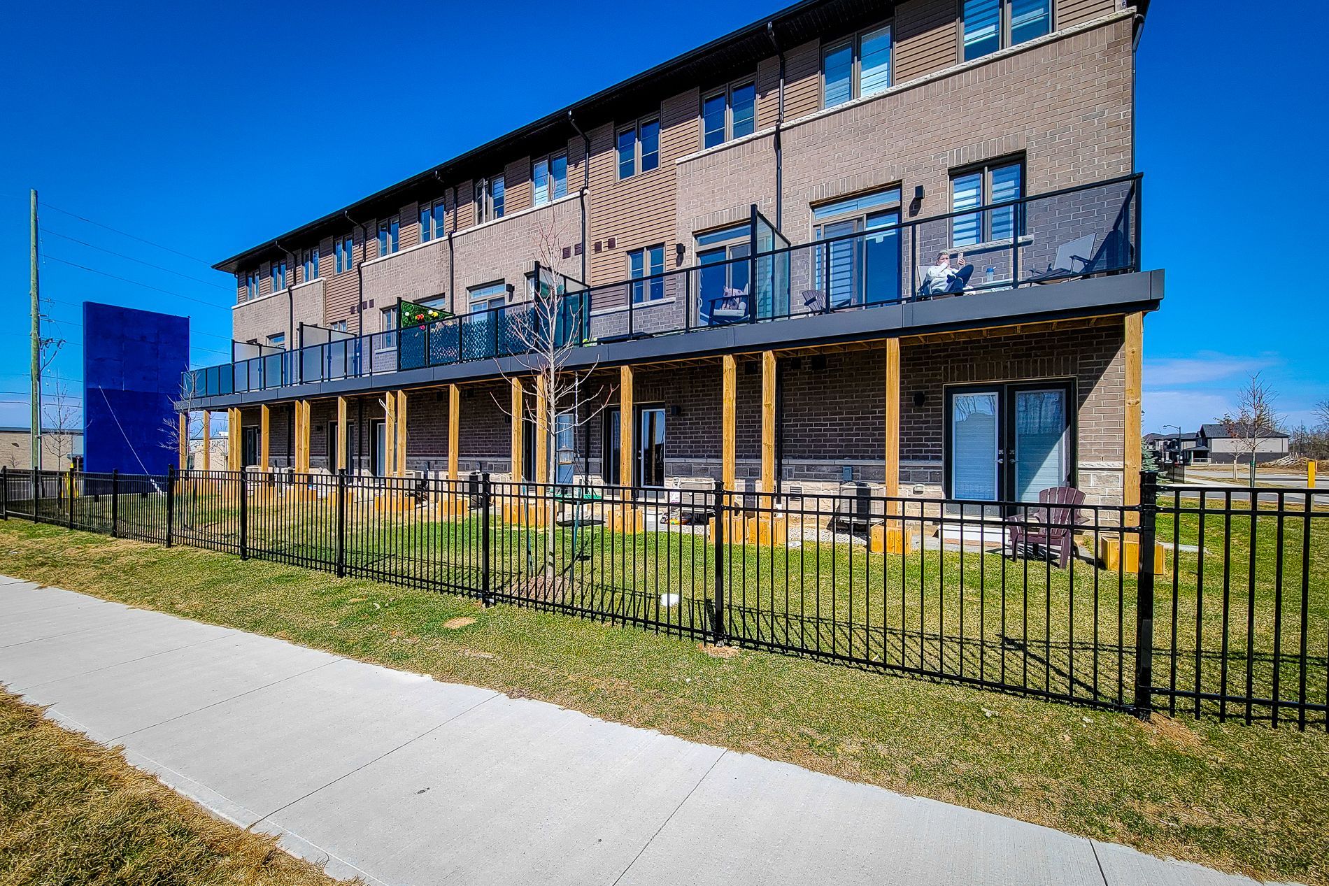 This stunning, newer three level town house, begins with great curb appeal. Built in 2023 with quality materials of classic brick and stone, nestled in a picturesque area. Small town intimacy, rich character with a suburban vibe and a growing community, are just a few of the points on a long list of cultured features. Green spaces abound, lion's park with pool and playgrounds, cycling trails, cross country skiing, riverside walking with direct access to downtown. Schools, cobblestone streets, cafes, boutiques and shopping, encompass a compelling blend of new residential comfort and timeless appeal in a growing community. Close to highways for commuters, this home is in a quiet, family friendly neighbourhood. A stylish interior with a fabulous layout, this spacious open concept modern design is filled with natural light. This home has over 1500 sq ft of living space with upgraded contemporary finishes. The main floor features a chef inspired eat in kitchen with quartz counters, stainless steel appliances, extended cabinetry and a private balcony. The large family room is perfect for quiet relaxation or entertaining. The primary bedroom is generous in size, offering a walk-in closet and spa-like 3 piece ensuite. Two additional bedrooms share a modern 4 piece bath. Extras, like main floor powder and laundry rooms, a tankless hot water heater and water softener, add to the convenience of everyday living. The finished basement includes a multi-purpose room, suitable for an office, recreation room, play area or 4th bedroom. This leads to a walkout, with a fenced backyard and patio, facing the forest. This home is perfect for first time buyers, those looking to downsize or savvy investors.
