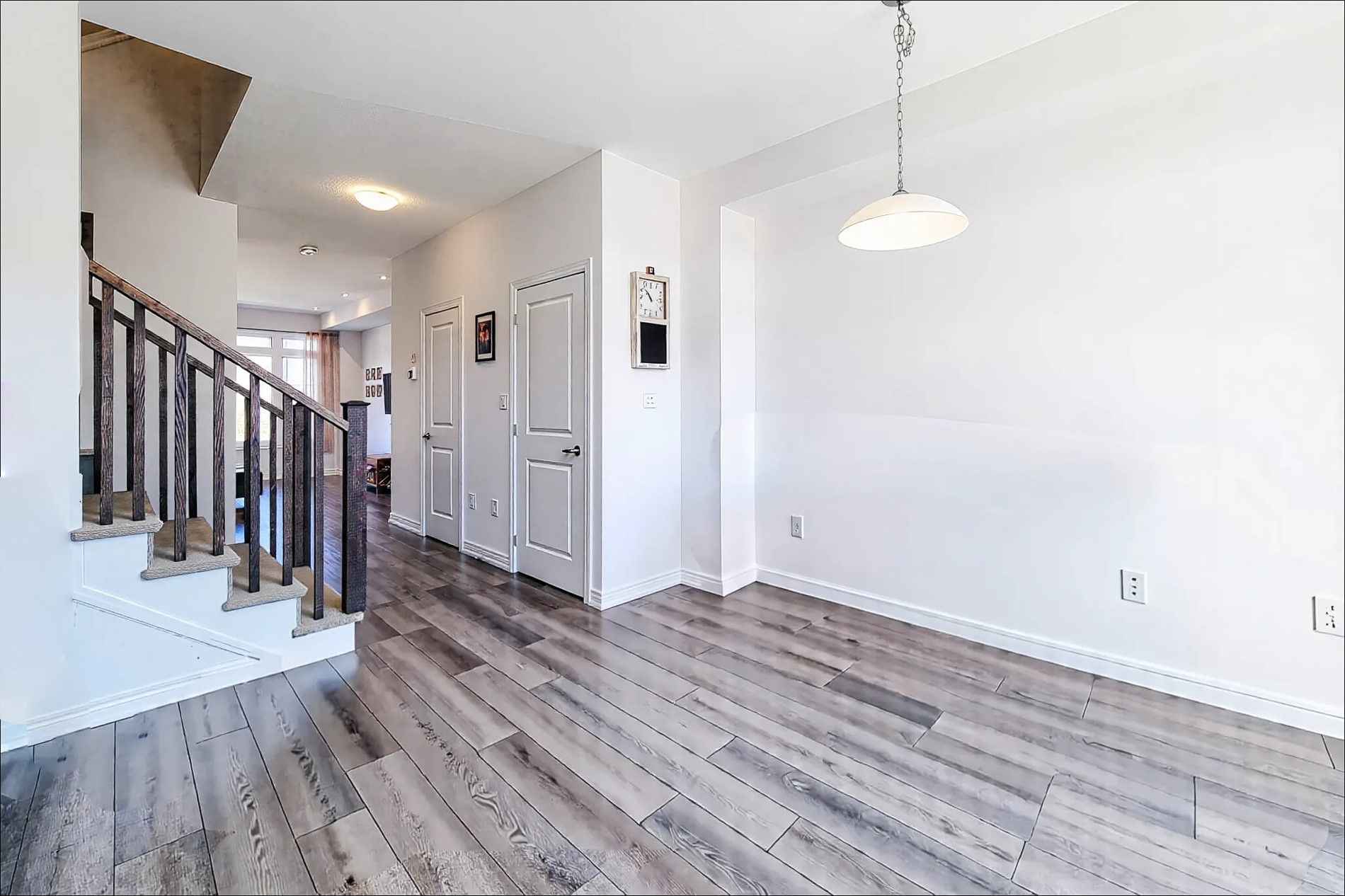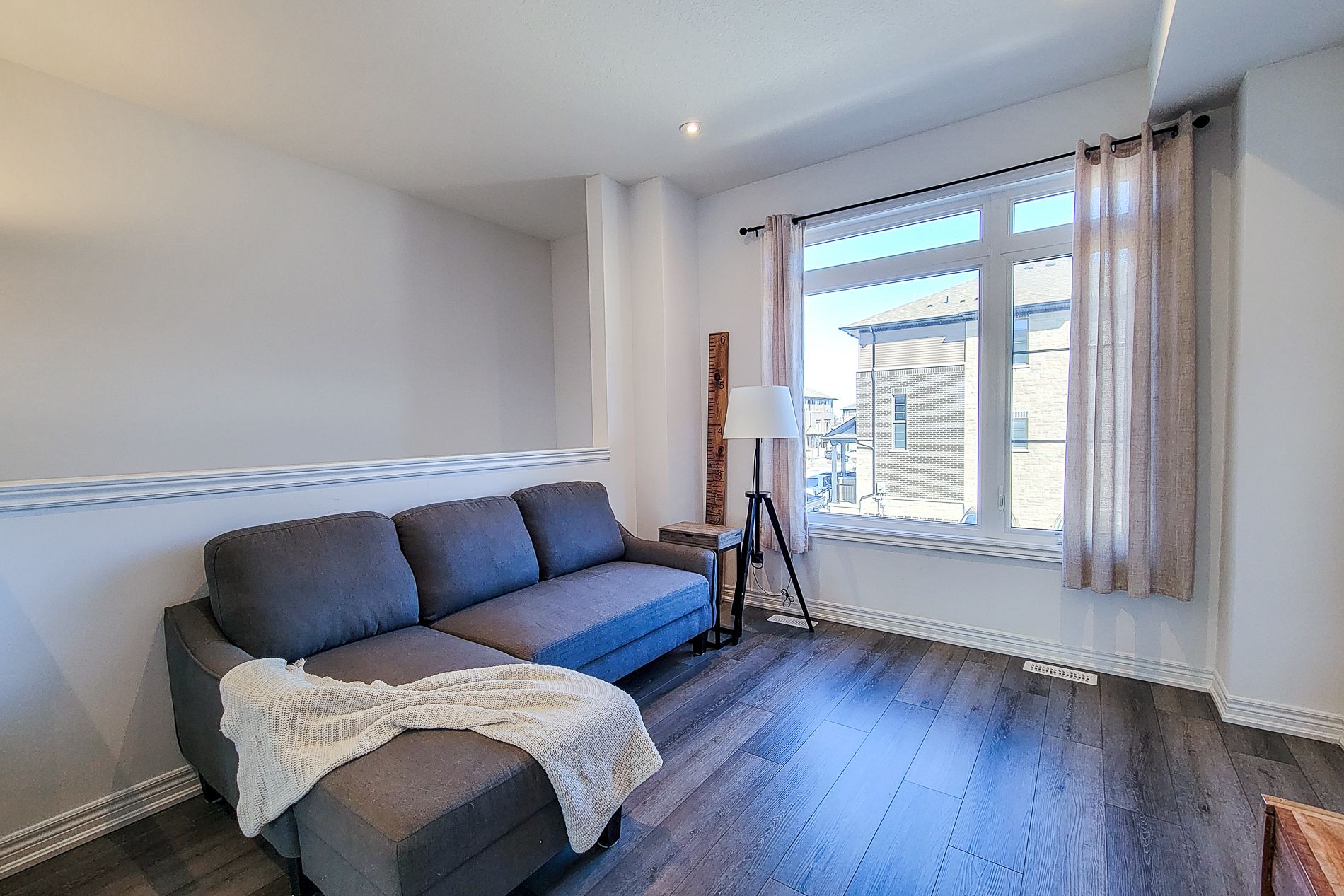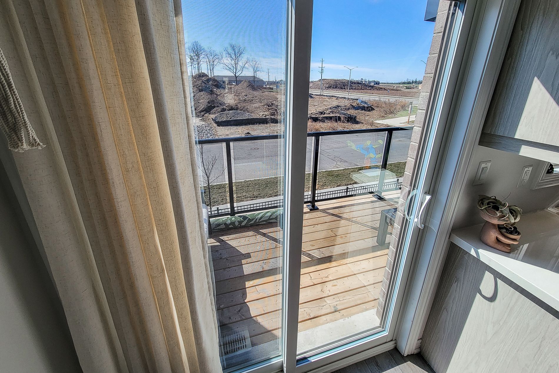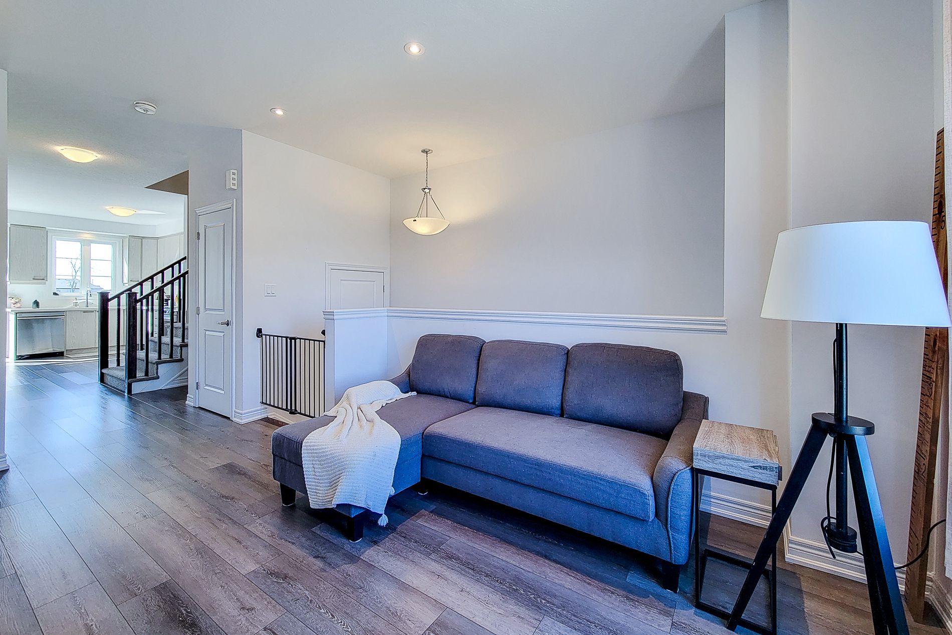 This stunning, newer three level town house, begins with great curb appeal. Built in 2023 with quality materials of classic brick and stone, nestled in a picturesque area. Small town intimacy, rich character with a suburban vibe and a growing community, are just a few of the points on a long list of cultured features. Green spaces abound, lion's park with pool and playgrounds, cycling trails, cross country skiing, riverside walking with direct access to downtown. Schools, cobblestone streets, cafes, boutiques and shopping, encompass a compelling blend of new residential comfort and timeless appeal in a growing community. Close to highways for commuters, this home is in a quiet, family friendly neighbourhood. A stylish interior with a fabulous layout, this spacious open concept modern design is filled with natural light. This home has over 1500 sq ft of living space with upgraded contemporary finishes. The main floor features a chef inspired eat in kitchen with quartz counters, stainless steel appliances, extended cabinetry and a private balcony. The large family room is perfect for quiet relaxation or entertaining. The primary bedroom is generous in size, offering a walk-in closet and spa-like 3 piece ensuite. Two additional bedrooms share a modern 4 piece bath. Extras, like main floor powder and laundry rooms, a tankless hot water heater and water softener, add to the convenience of everyday living. The finished basement includes a multi-purpose room, suitable for an office, recreation room, play area or 4th bedroom. This leads to a walkout, with a fenced backyard and patio, facing the forest. This home is perfect for first time buyers, those looking to downsize or savvy investors.
