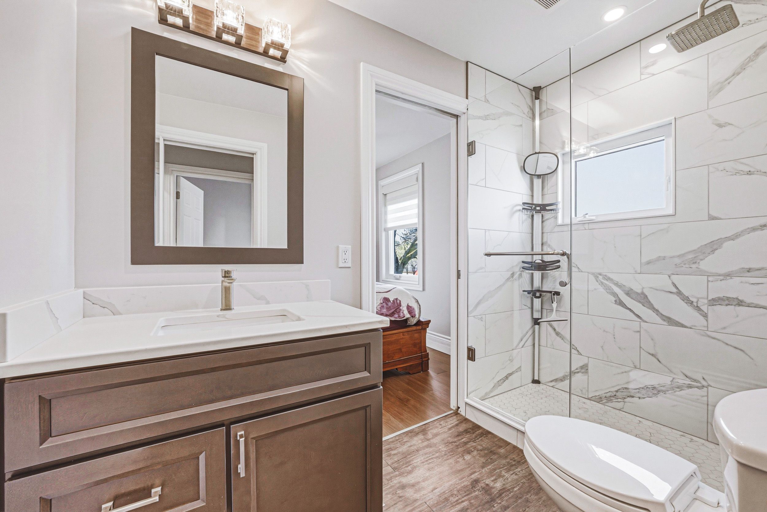 • Custom walk-in closet and updated bathroom with modern fixtures for convenience.