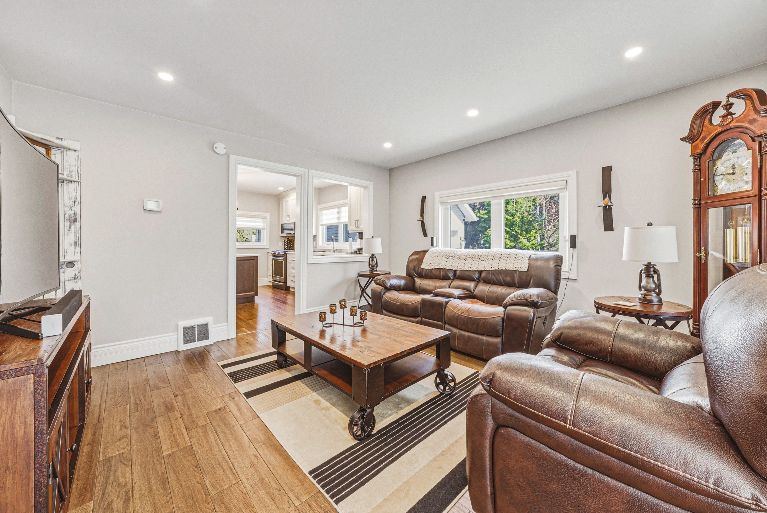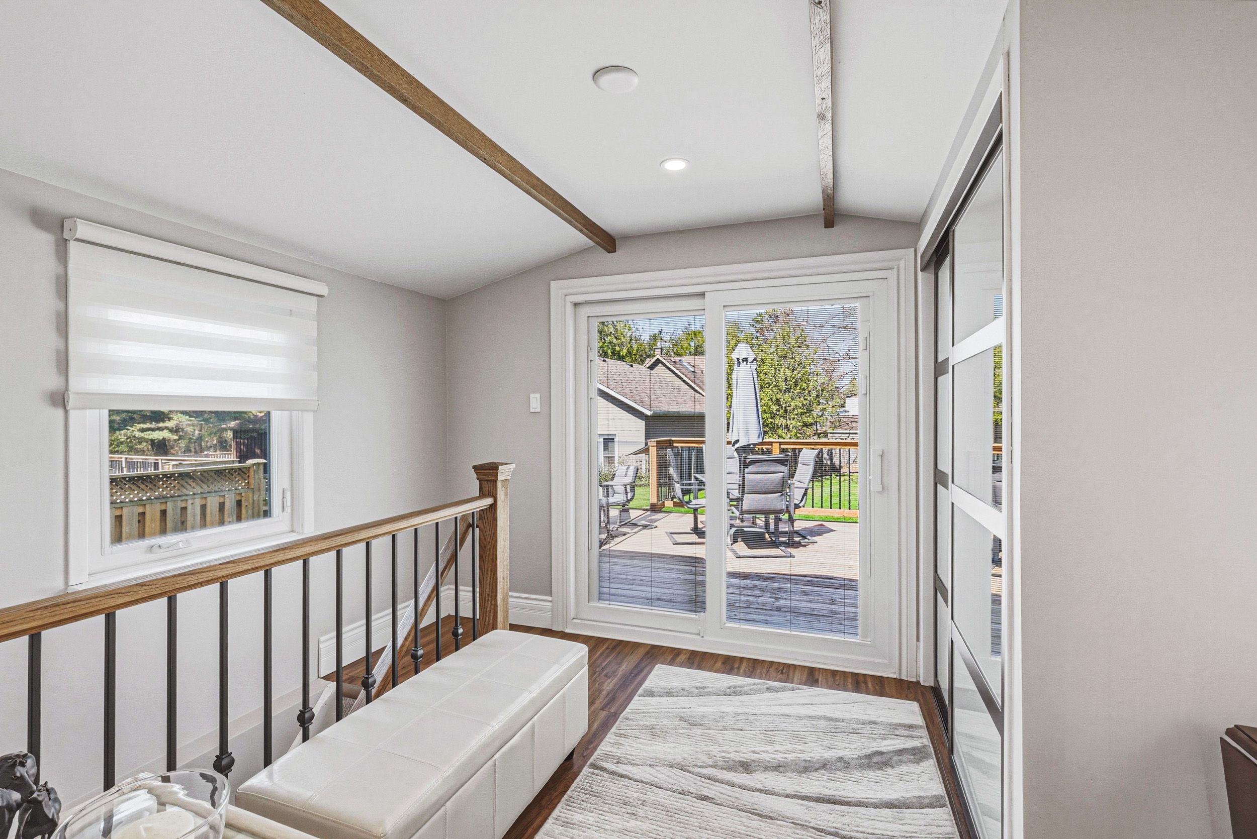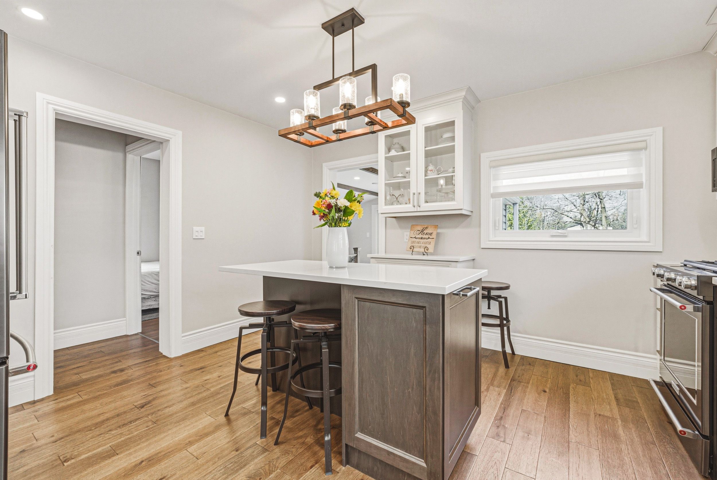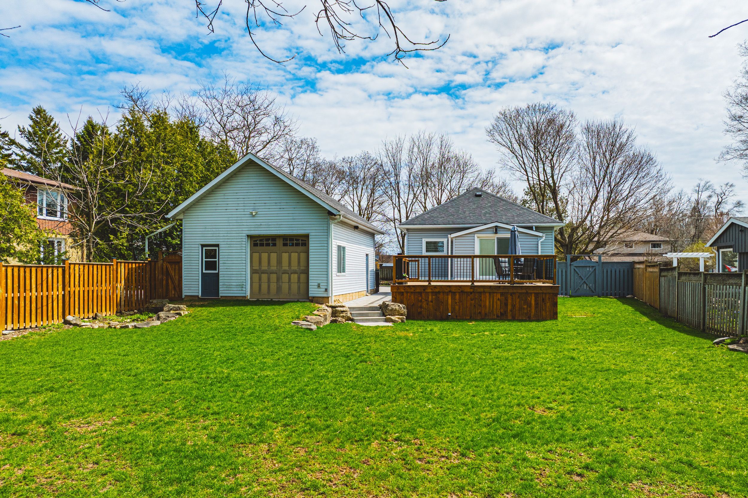 This stunning raised bungalow on an oversized lot in rockwood offers a fully renovated interior , paired with efficient modern living. In 2021, the main floor and kitchen underwent a complete transformation. The kitchen features kitchen aide appliances (gas stove, dishwasher, fridge, )and a built in microwave, quartz counters, an island with stools and a wine rack, and new hardwood flooring throughout main level. The updated bathroom has a glass shower, new vanity, and pocket doors leading into the primary suite, which has a custom walk-in closet by closets by design. Custom blinds with privacy pull downs. The back room's stair railing features black spindles and solid wood, and a closet for storage, there is w/o to new deck w/upgraded spindles(2023). The home is heated by a cost-efficient geothermal system. In 2022, both the back sliding door and basement windows were replaced, adding to the home's modern appeal. The oversized drive-through garage/workshop includes a loft and in-floor heating, also present in the basement. The home offers a new front door, a paved driveway, and updated stone walkways and gardens. In 2020 the fence was also replaced in backyard, it has a gas line for bbq, and is fully fenced. In 2024, new gutter rails were installed. This move-in-ready home is close to schools, shopping, and highways, offering comfort and convenience with stylish updates throughout