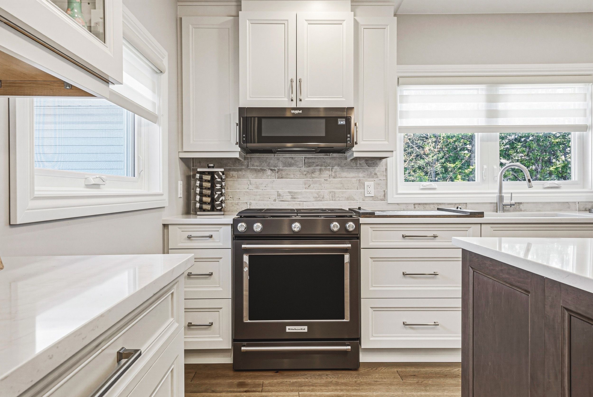 • Gourmet kitchen features high-end appliances, quartz counters, and a breakfast island.