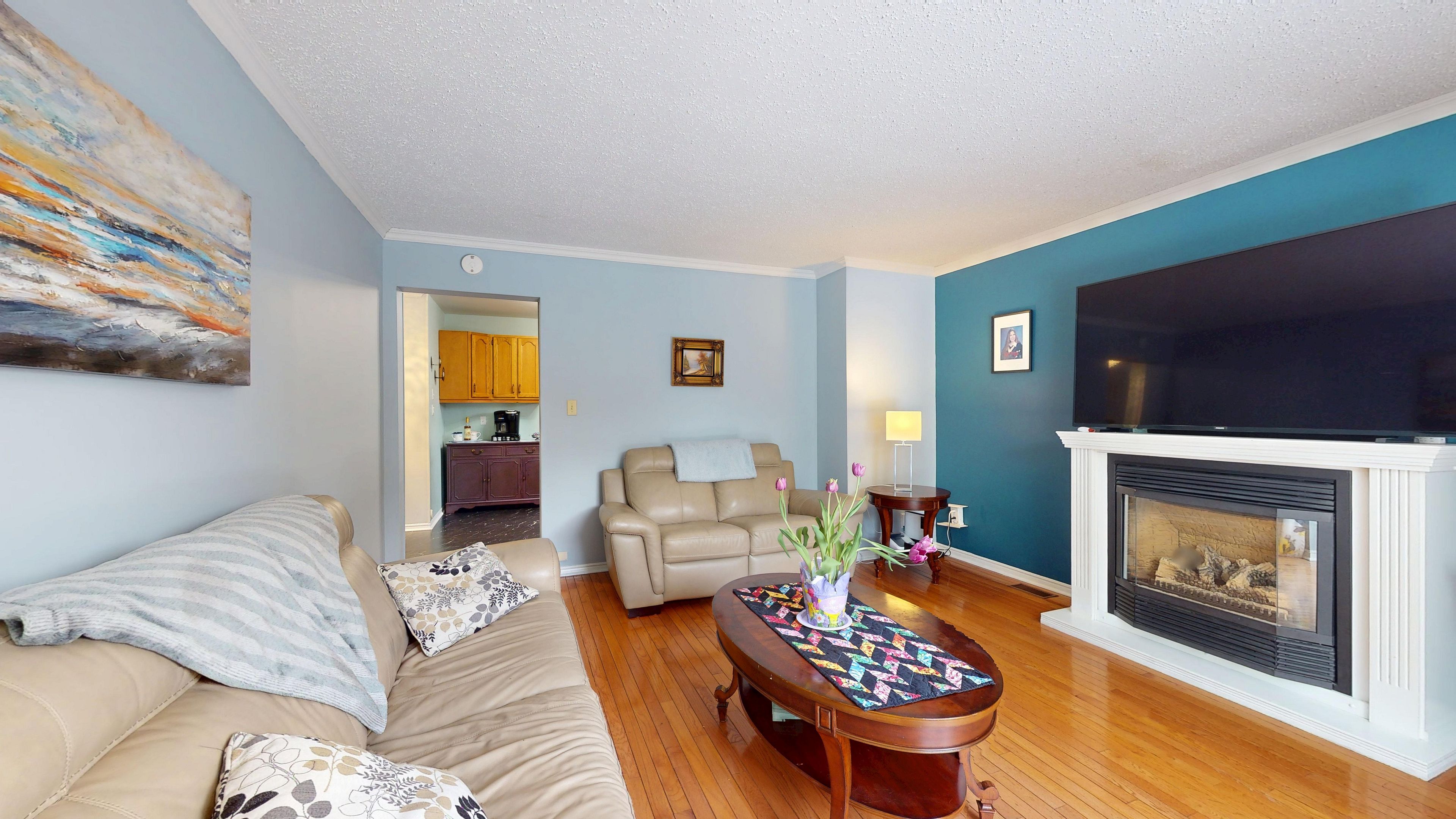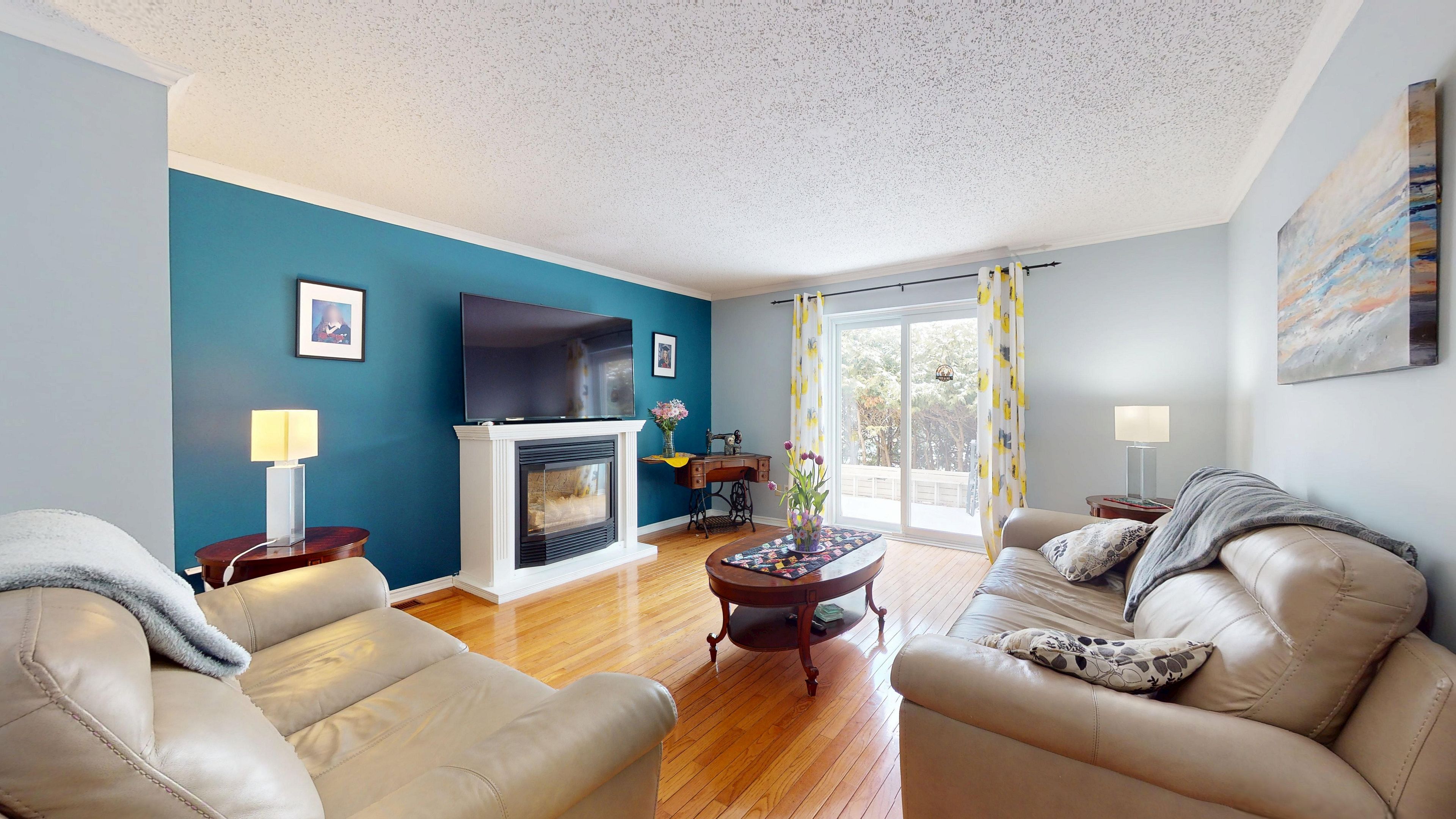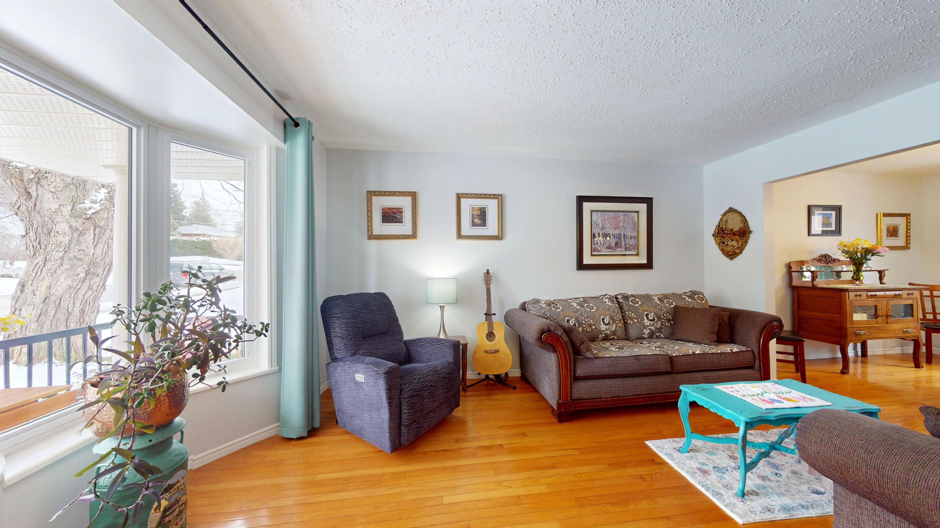 • Sunny living room with bay window, perfect for gatherings.