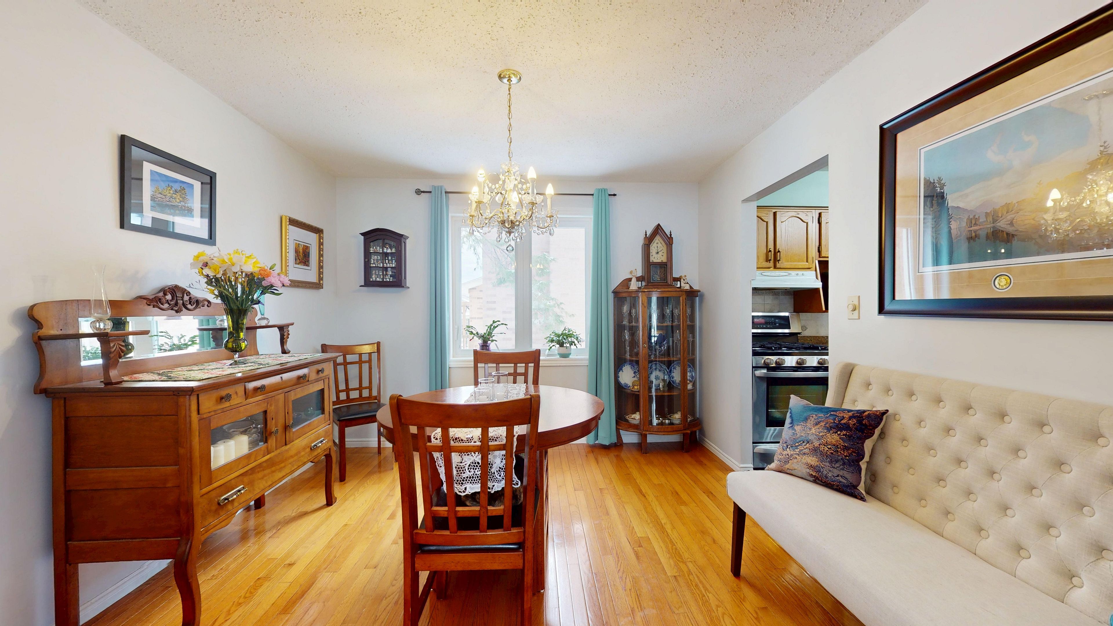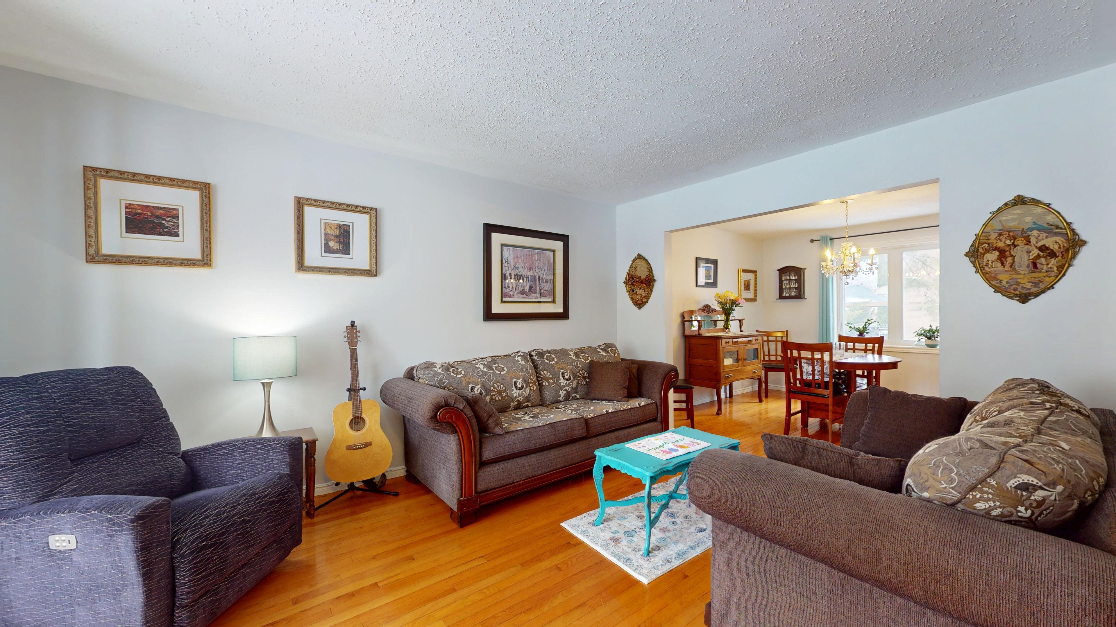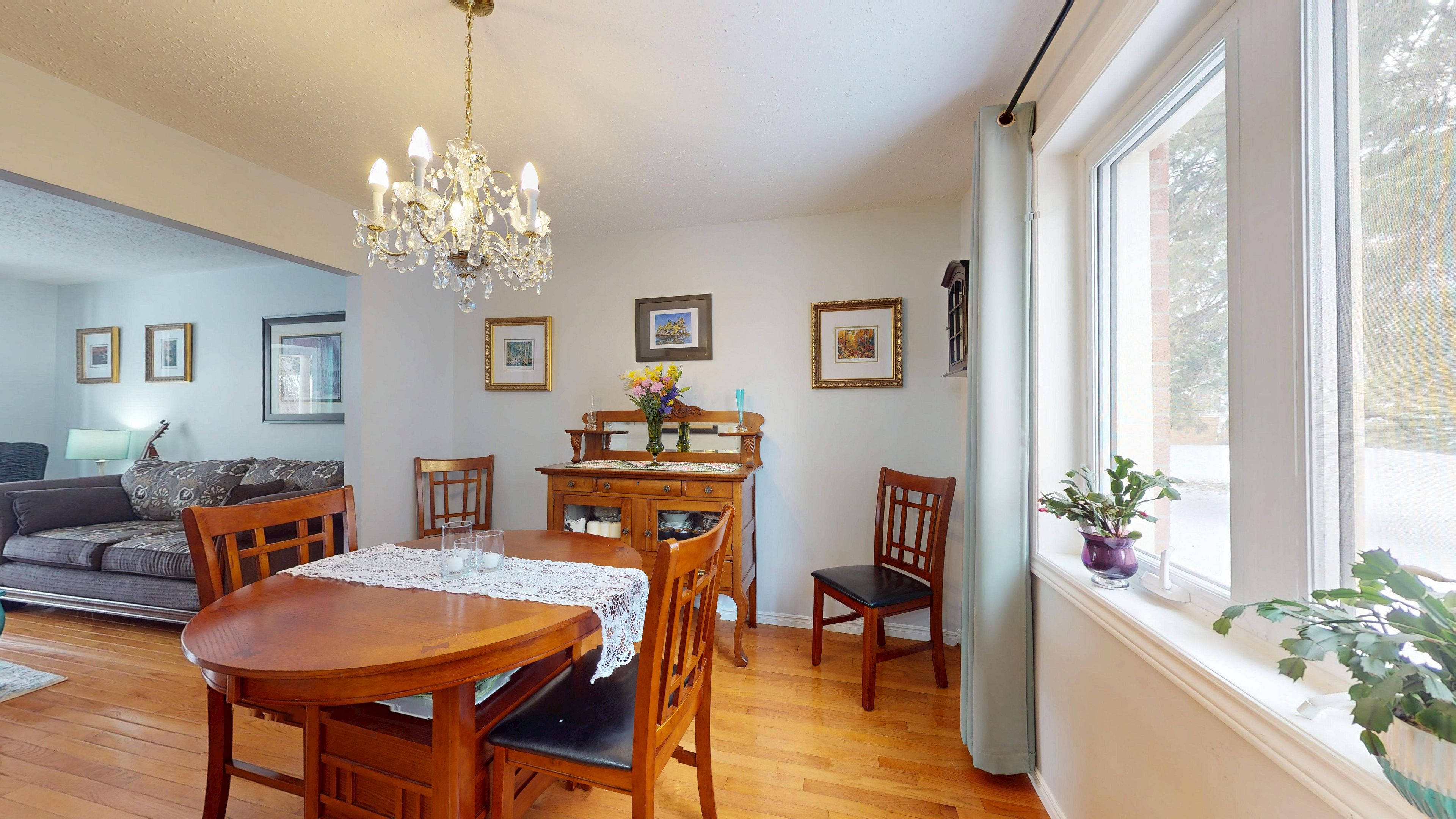 • Sunny living room with bay window, perfect for gatherings.