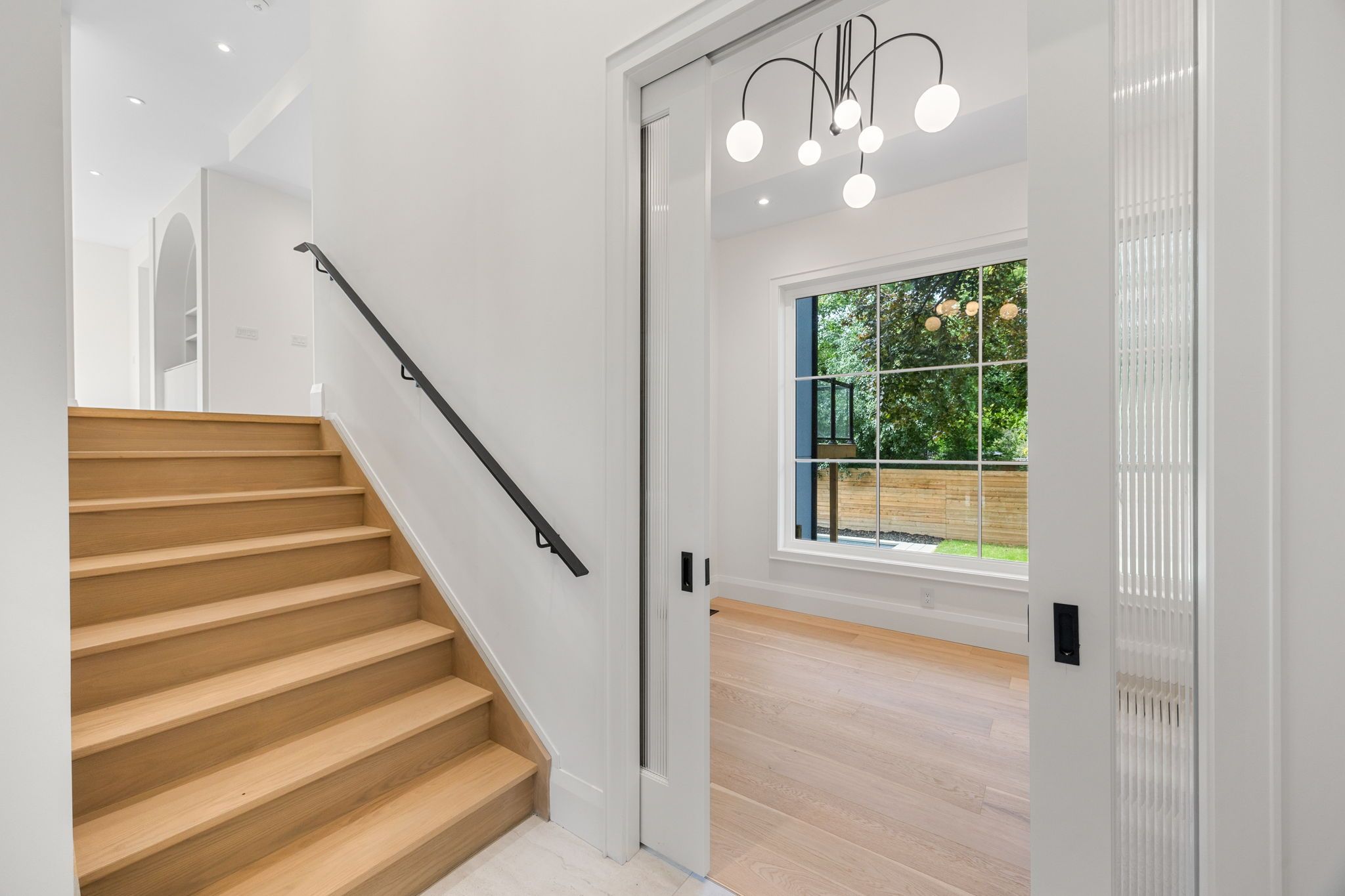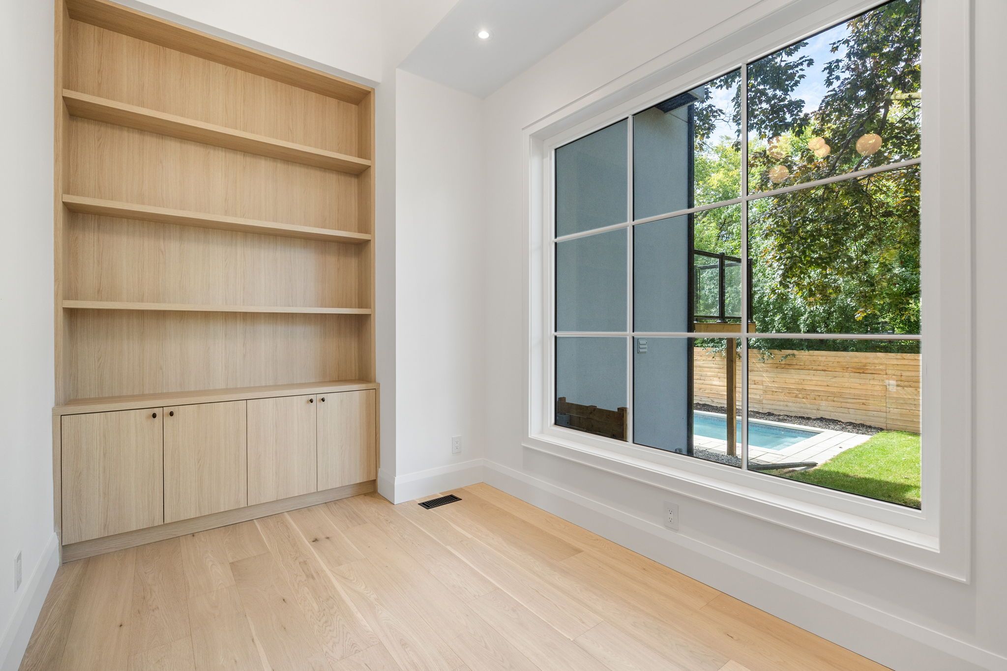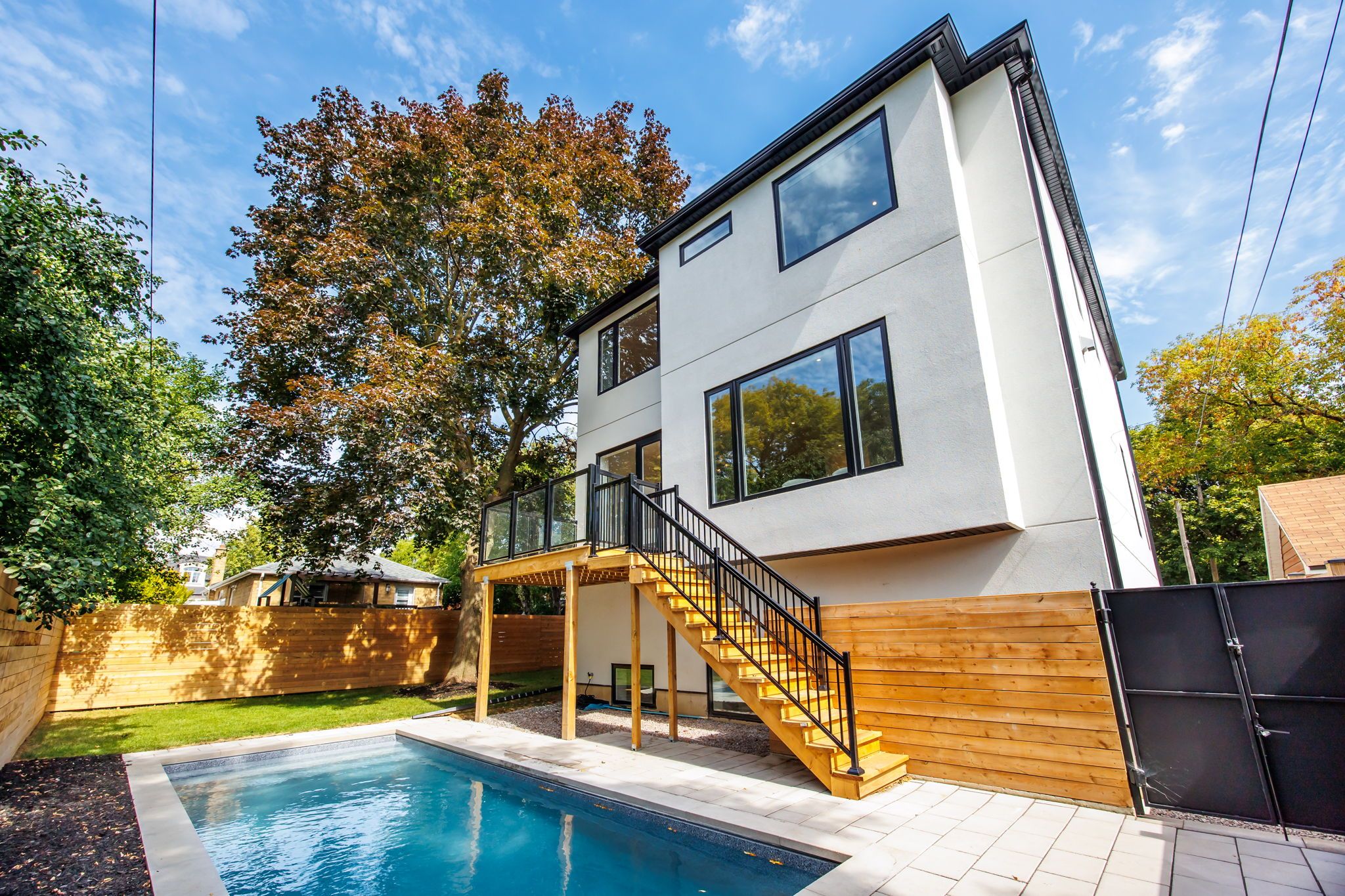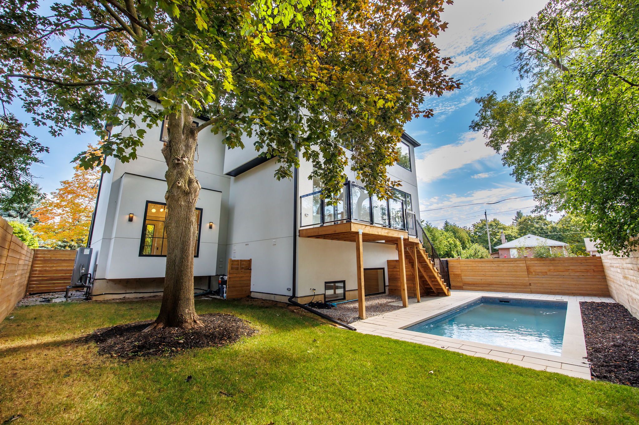 This expertly designed, fully turn-key custom home offers four spacious bedrooms and luxury finishes throughout. Located on an ultra-quiet, family-friendly street, the home features 10-ft main floor ceilings, and a walk-out basement with separate side entrance ideal for future rental or in-law suite. The chef's kitchen includes a 42" kitchenaid fridge, fisher & paykel induction cooktop, custom stone backsplash, custom designed rounded hood, and generous storage. The open-concept living and dining space is perfect for entertaining, featuring a custom arched bar with stone countertops. A custom home office with floor-to-ceiling library millwork sits just off the foyer, enclosed by reeded glass pocket doors and overlooking the serene, landscaped backyard. Upstairs, the oversized primary suite offers a fully customized walk-in closet and a spa-like ensuite with marble accents, soaker tub, heated floors, double vanity, and a glass shower with floating bench. Outside, enjoy a private backyard retreat complete with a beautifully designed saltwater pool, extensive landscaping, and a mature norway maple tree for natural shade. The large front yard provides a rare opportunity for additional recreational space or a future sport court. This home also includes over $10,000 in custom window coverings, an electric vehicle charger, heated floors in both the front foyer and the primary ensuite, a double car garage, and an oversized driveway with multiple car parking. Set back generously with a large sugar maple in the front yard and full separation between the basement and main living areas, this home is designed for both comfort and versatile living.