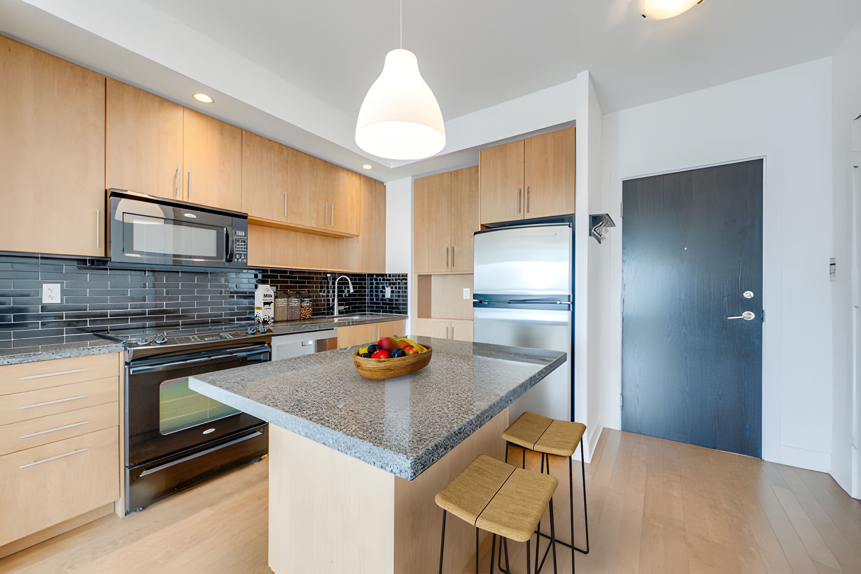 • Modern kitchen features granite countertops, glass tile backsplash, and a center island.