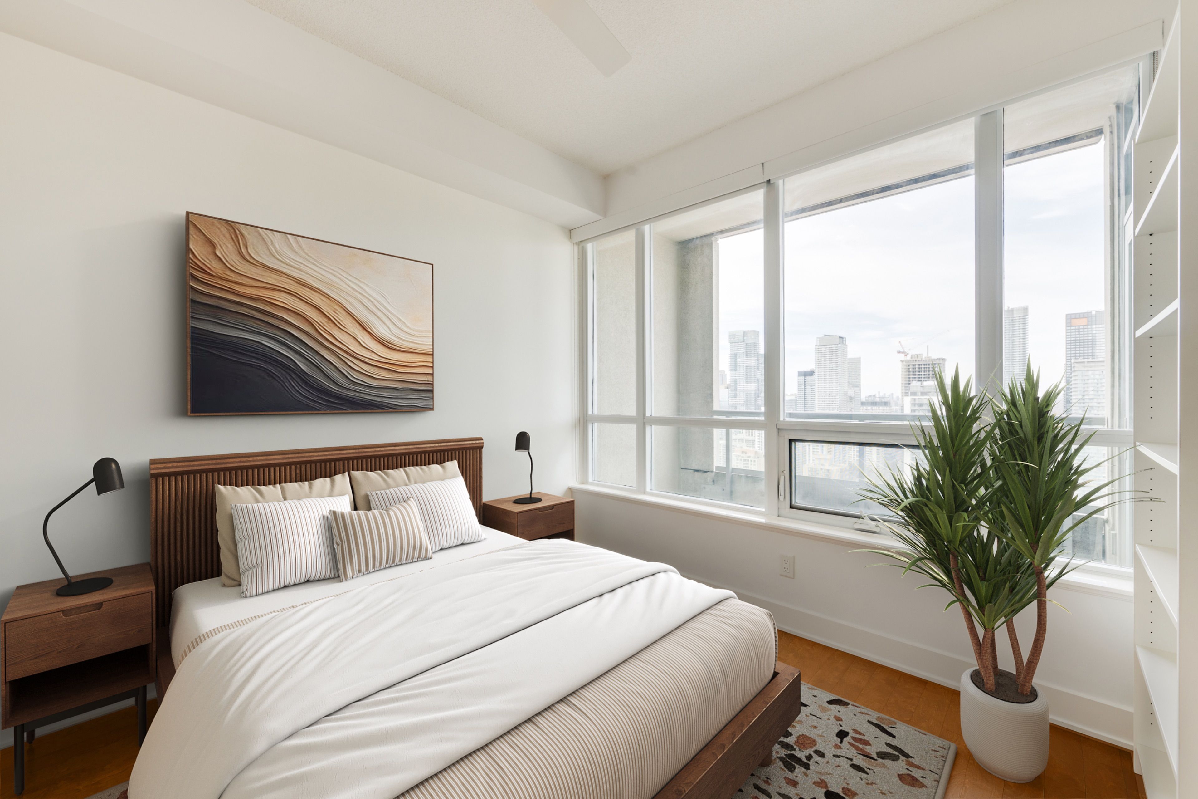 • Open-concept living area with stunning city views from floor-to-ceiling windows.