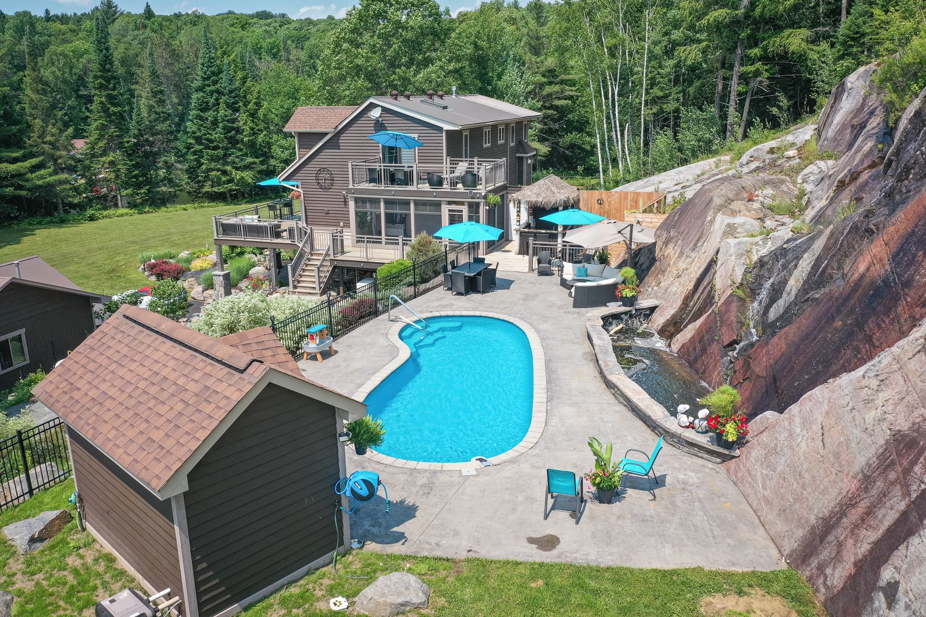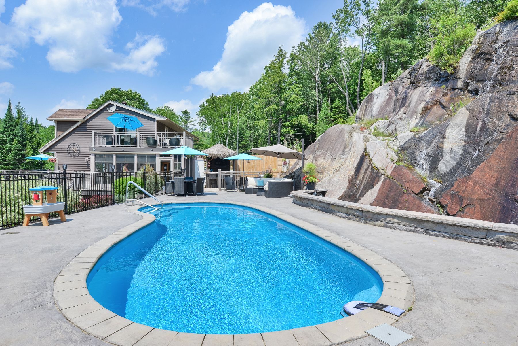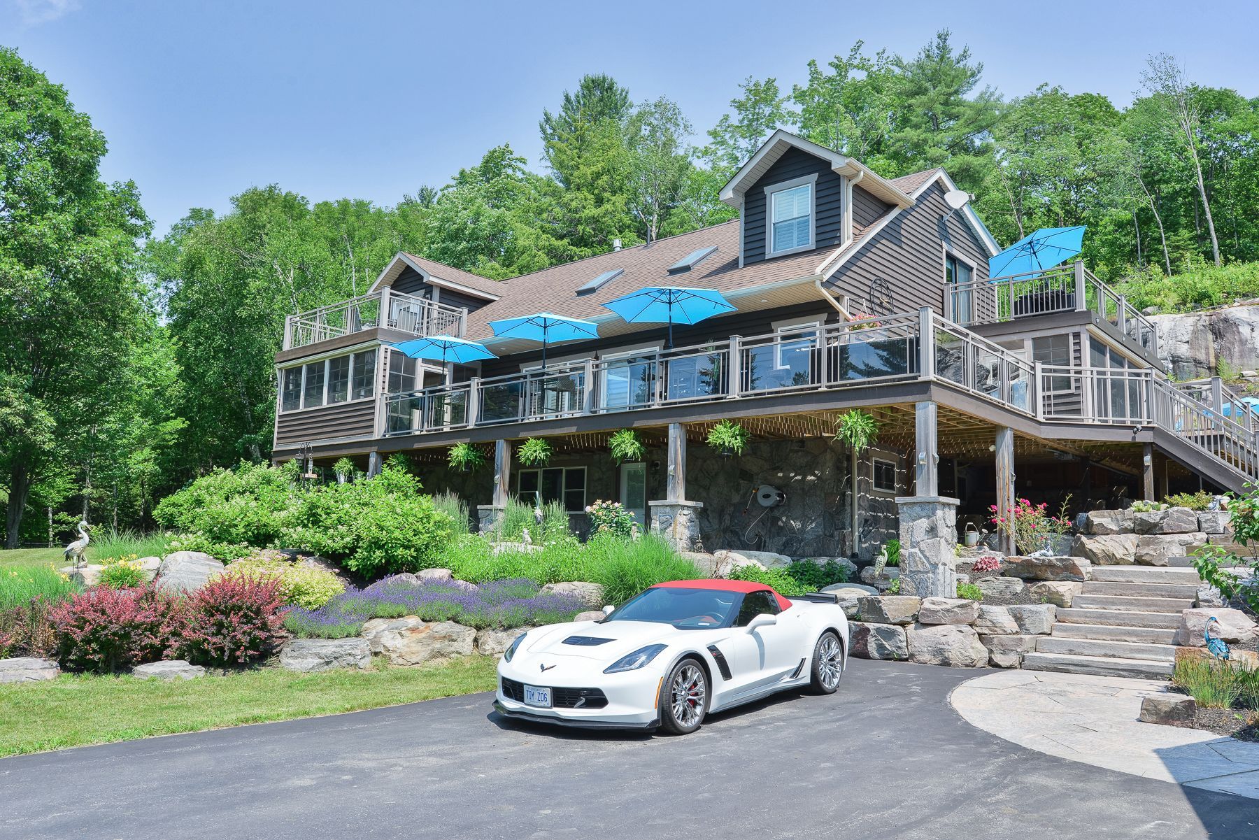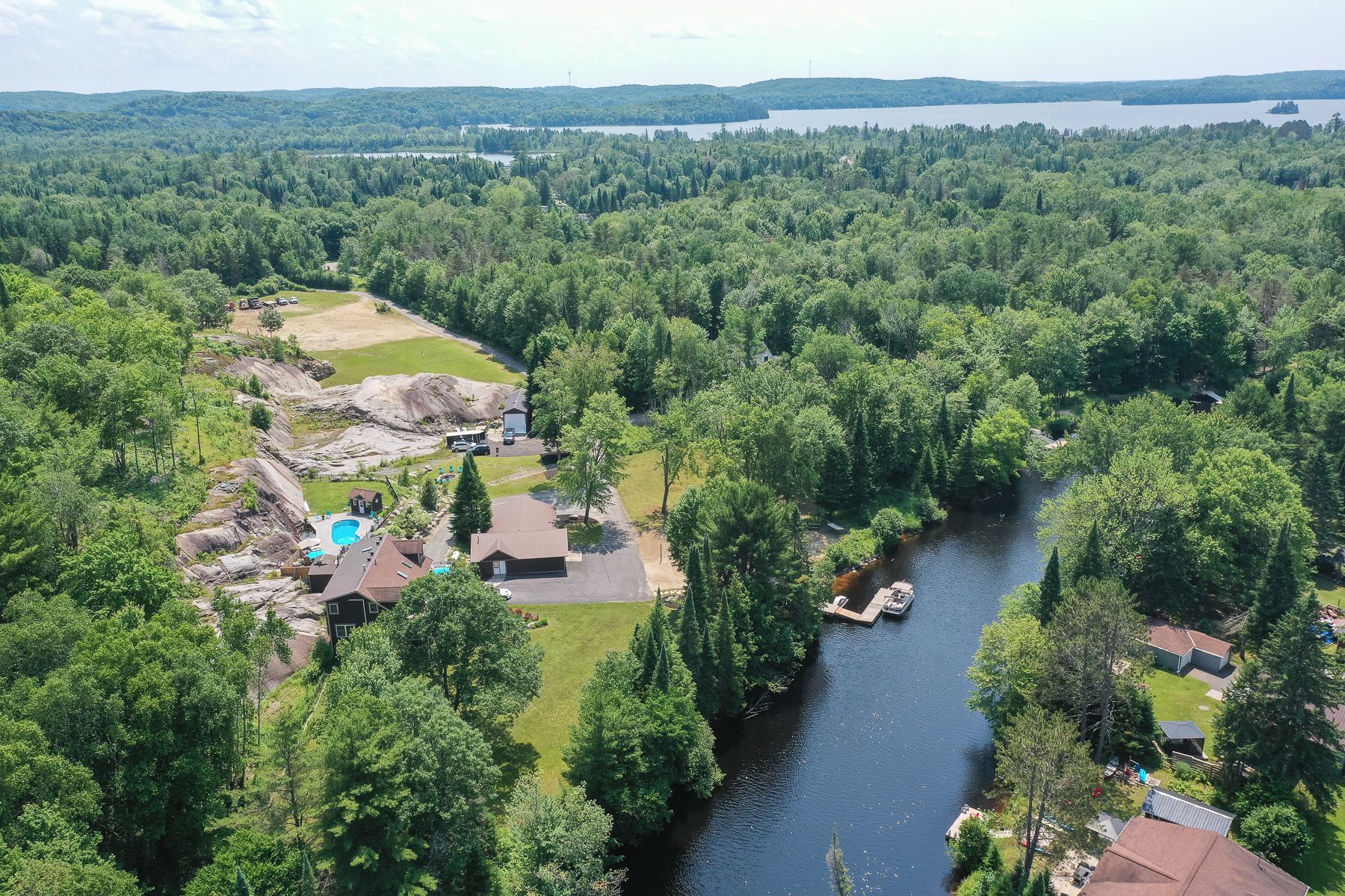 Spectacular, unique, unforgettable. These are just a few words to describe this magical, one of a kind property. Formerly featured in a muskoka magazine, the home and property offer plenty of space for entertaining, a growing family or simply reconnecting with nature and wildlife. Design elements, including local muskoka granite picked and split by the owners hand and built into the feature wall and kitchen island, all help to create a space that welcomes you from its front gates to its front door and beyond. Soaring vaulted ceilings and architectural beams in the main living area and primary bedroom, as well as a thoughtfully redesigned interior created during the building of a significant addition completed in 2016, provided the owner and designer an opportunity to create a spacious, interesting yet functional space. Breathtaking views from numerous balconies, windows and patios overlook the grounds, gardens, 30ft waterfall and approx. 500 ft of mother natures perfect river front. The in-ground salt water pool, tiki bar, infrared sauna, built in hot tub, large gym, theatre room, ball court, sandy beach with gentle water entry for swimming, dock for boating, waters edge bunkie (sleeping 4 comfortably), the huge 5 car garage, large rv shed with oil pit and even the bonfire lookout on top of the hill of your 11 acre property will afford you the last ray of sunshine with the setting sun to complete your daily living experience. Should you ever wish to leave your property, you are just a few short minutes to the heart of huntsville by car and a short boat ride along the river to lake vernon and further access to fairy, mary and peninsula lakes. Pictures may speak a thousand words but this property has thousands more to share with you in person. Private showings only.