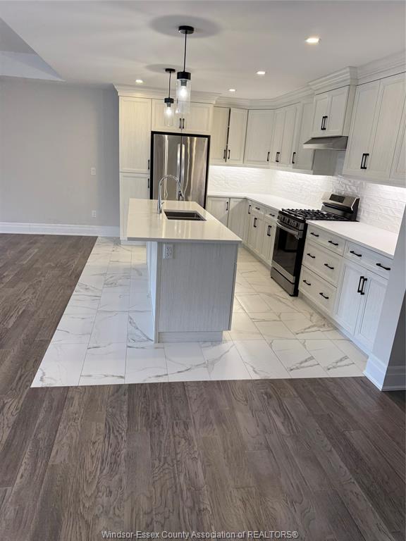 • Modern kitchen features stainless steel appliances and ample counter space.