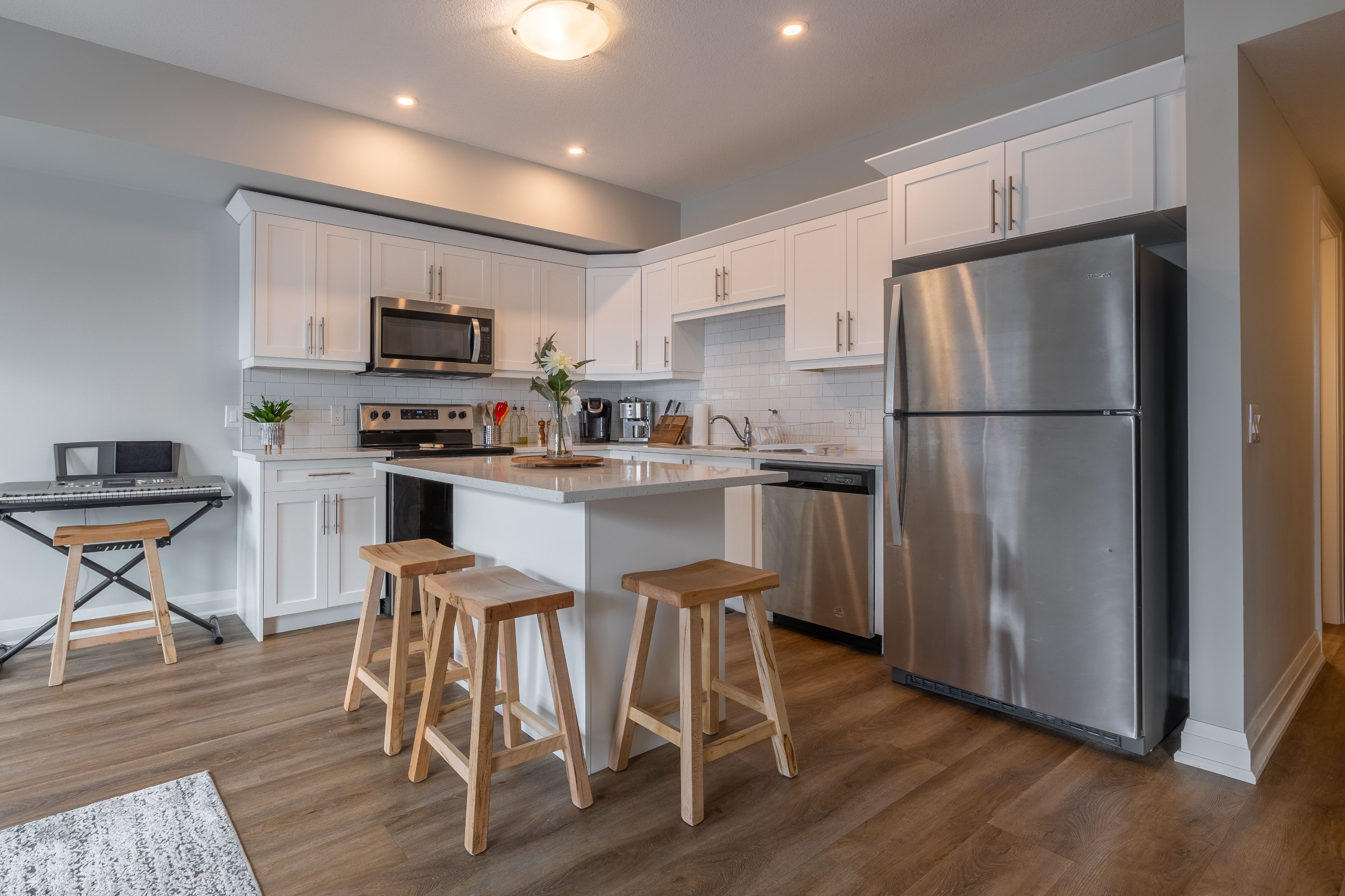 • Upgraded kitchen with quartz countertops and soft-close cabinetry.