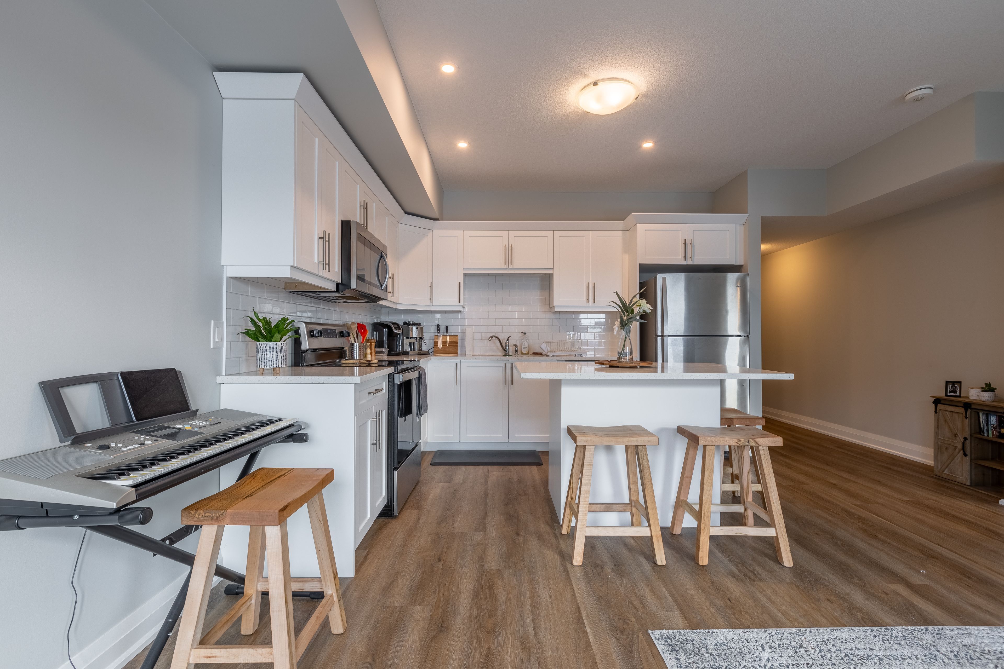 Welcome to this luxurious, modern condo in the heart of fonthill. This third-floor 1-bedroom, 1-bathroom unit, built in 2022, features a spacious 770 sq. Ft. Floor plan. Ft. And large south-facing windows with built-in blinds, filling the home with natural light. Two juliette balconies. Includes one parking space and a private locker. Thoughtfully upgraded with luxury vinyl tiles and carpet in the bedroom. Quartz countertops throughout. The modern kitchen features soft-close cabinetry and a center island, open-concept living and dining, in-suite laundry. All whirlpool appliances included (fridge, stove, dishwasher and microwave). Located in a vibrant, walkable community steps from the meridian community centre, shops, cafés, trails, with easy access to hwy 406, wineries, and the gta.