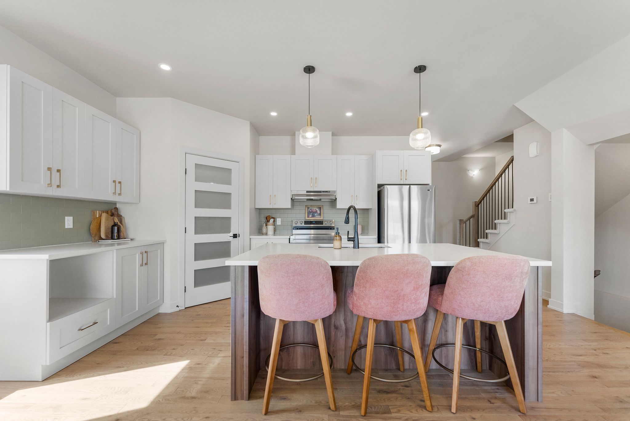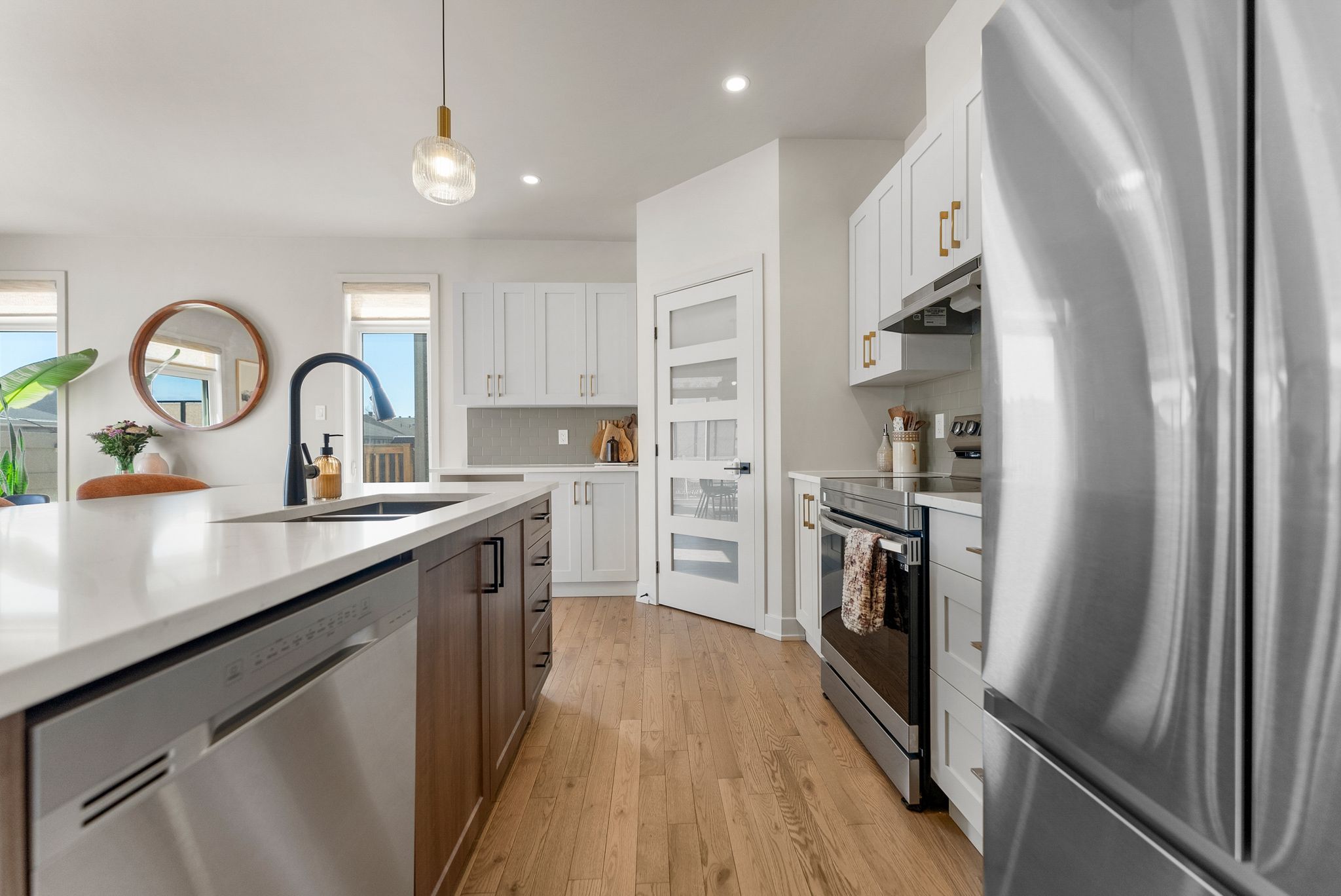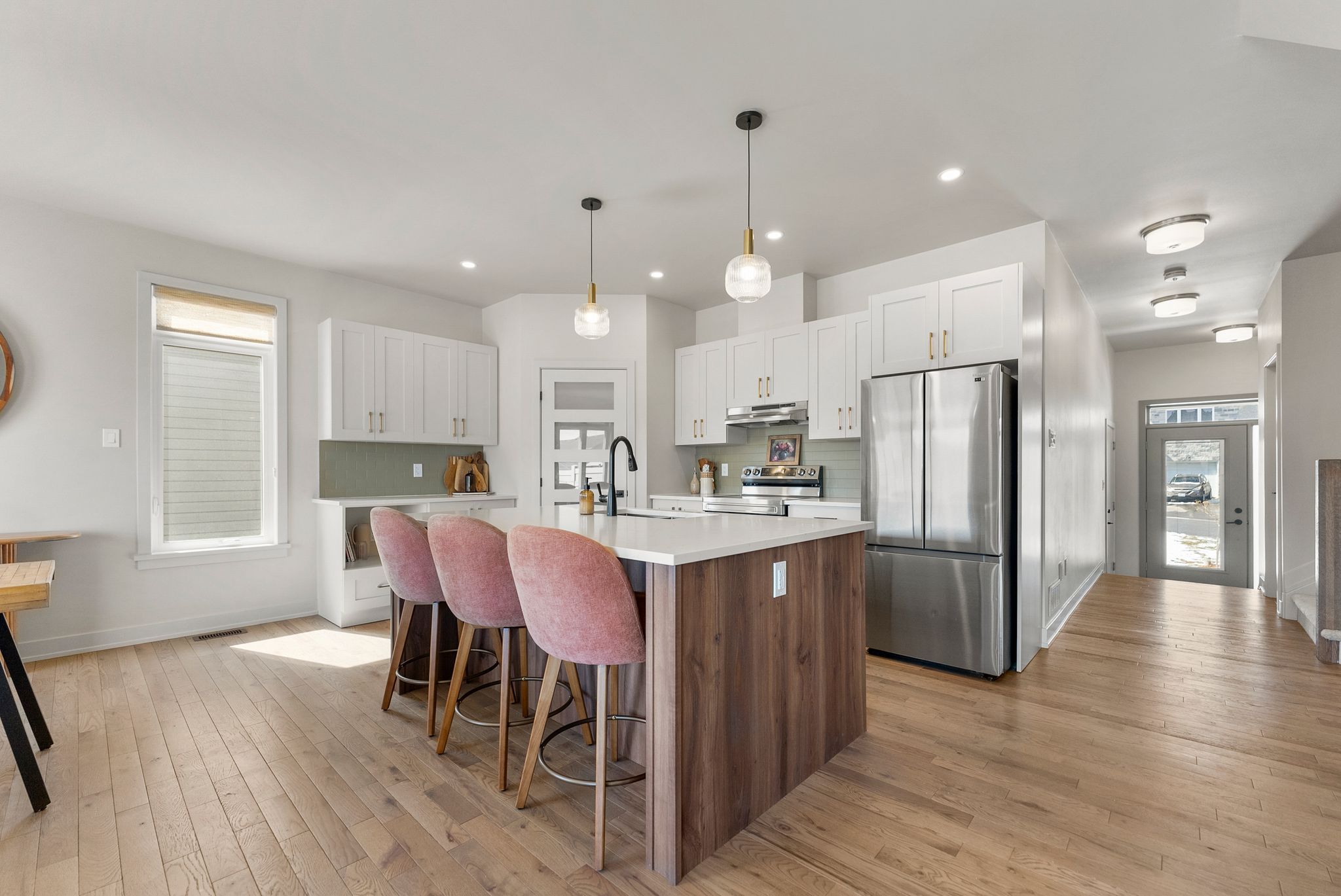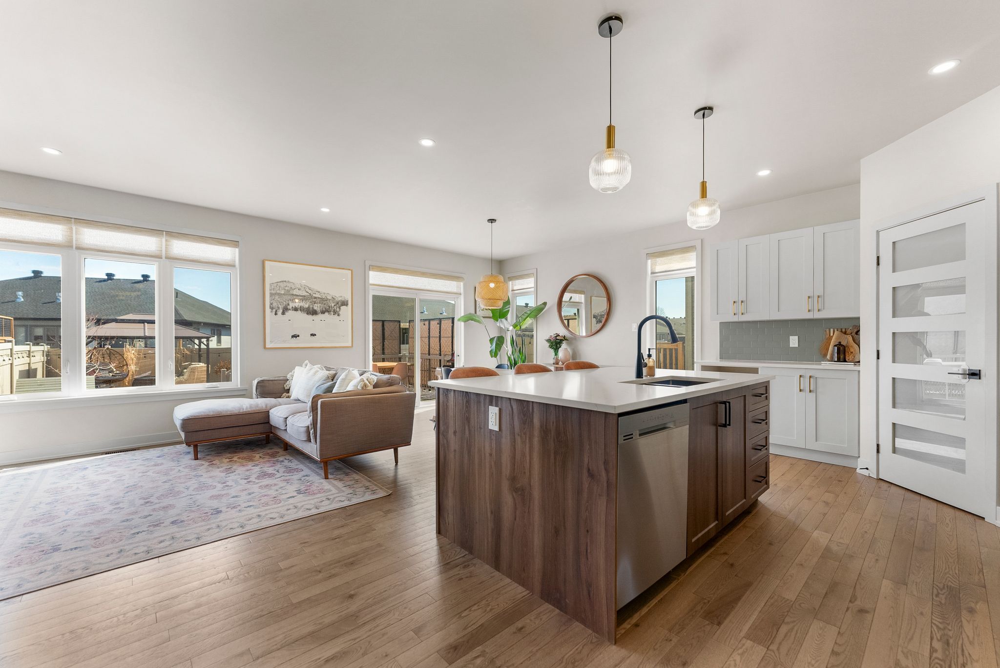• Spacious kitchen with quartz countertops and outdoor access for hosting.