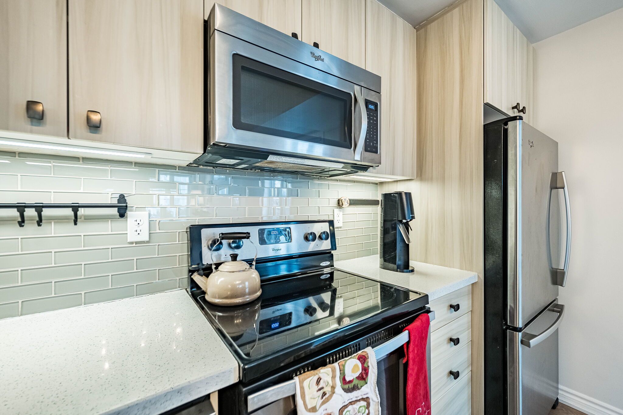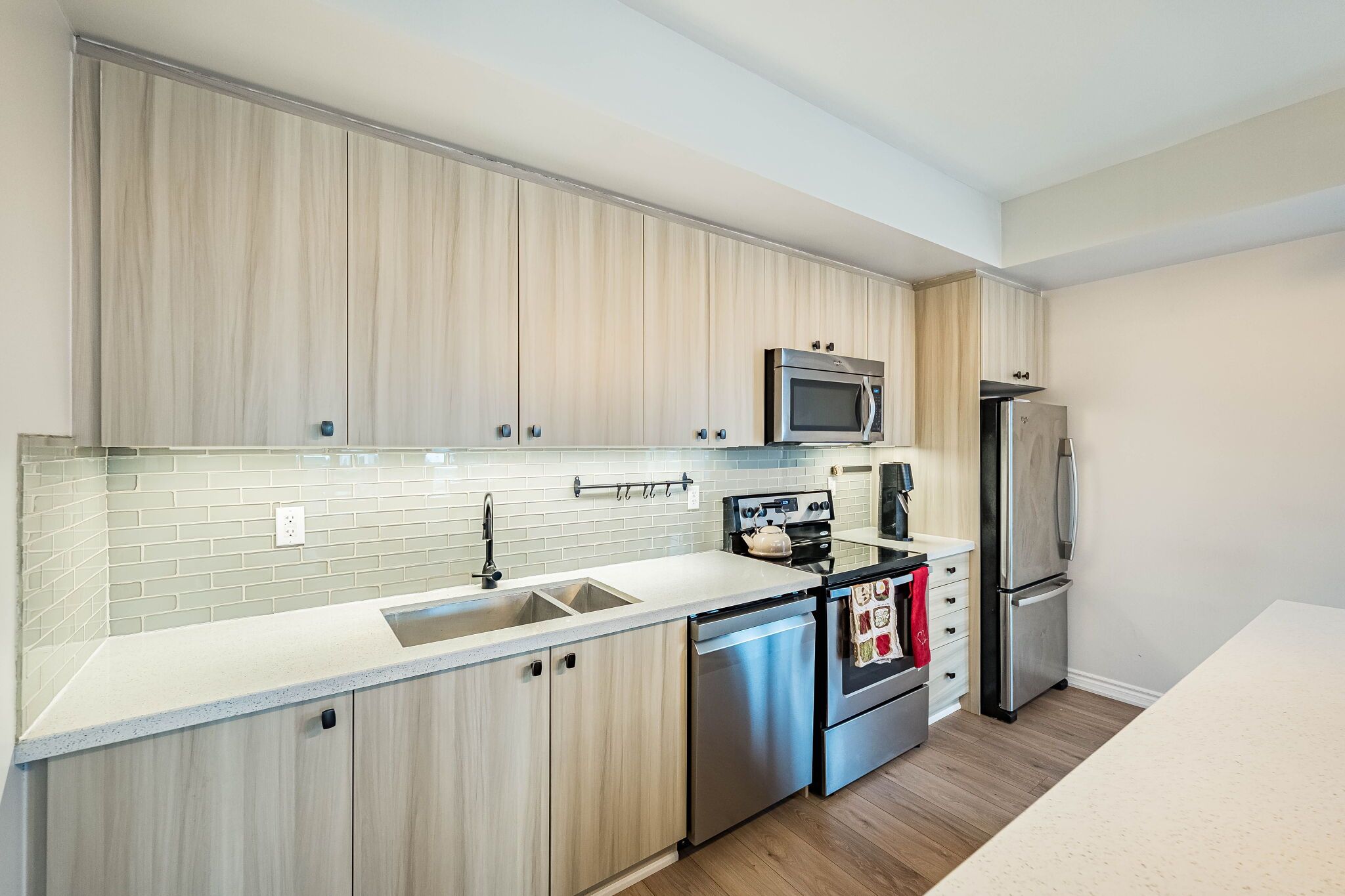 Stunning, bright, and spotless 3 bedroom upper corner town at minto southshore * entertain or relax in this beautiful, modern & spacious open concept design. The suite features a chef-inspired kitchen complete with stainless steel appliances, subway tile backsplash, custom center island, and a built-in wine rack overlooking the living and dining areas.*9 ft ceiling*. Tastefully decorated and ready to move in. You will love the hardwood floors, custom window coverings, and designer light fixtures. This sought-after unit has 2 walk-outs to balconies from the living room and primary bedroom, just perfect for your morning coffee. Great location close to lake, ttc, go stations, parks, recreation centers schools: humber & george brown, shops, restaurants, trails.