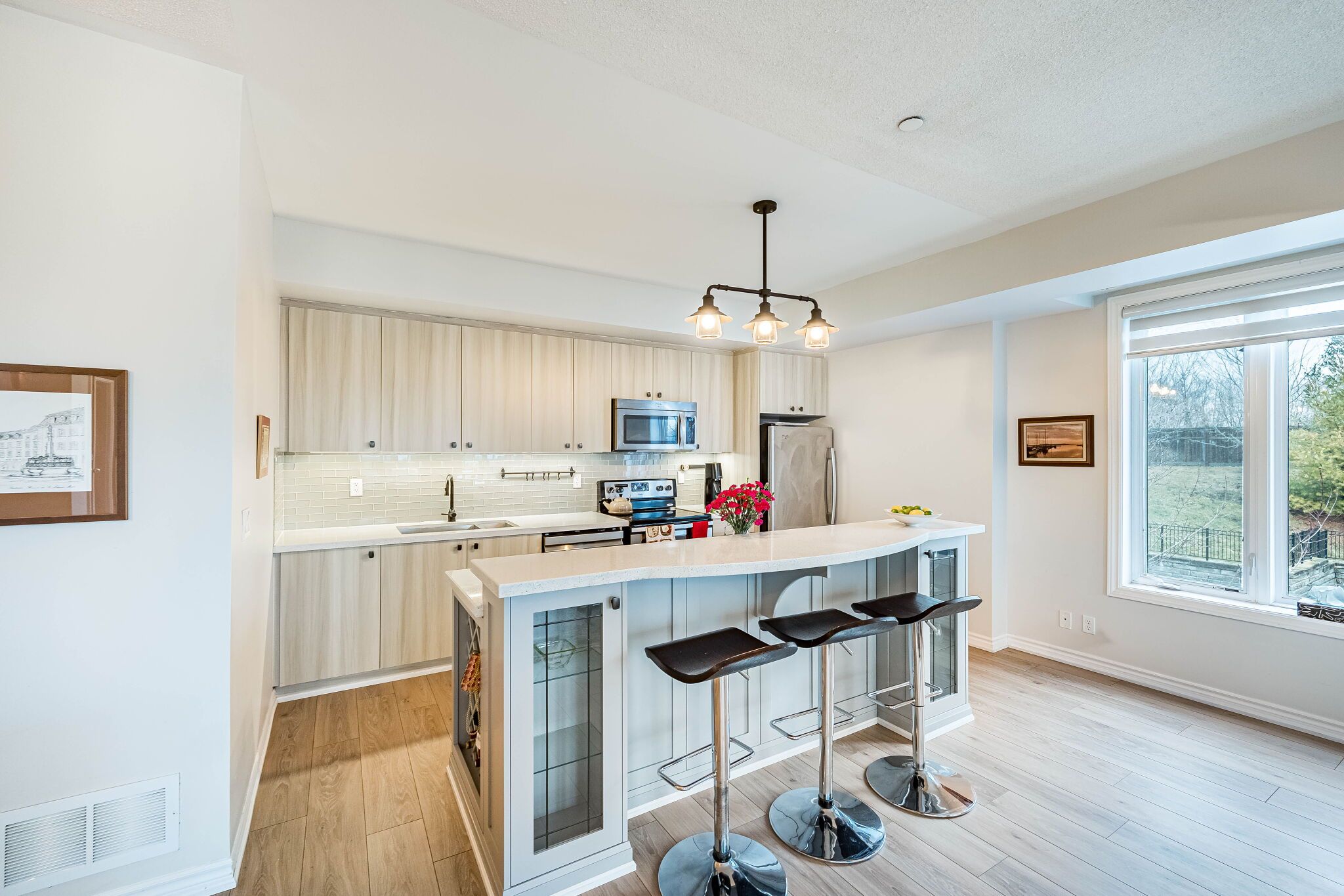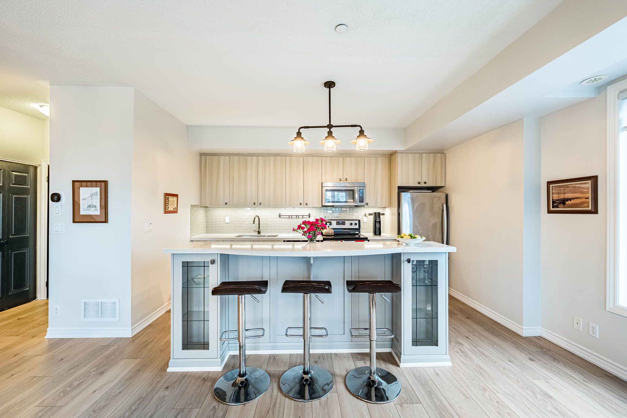 • Chef-inspired kitchen with stainless steel appliances and custom island.