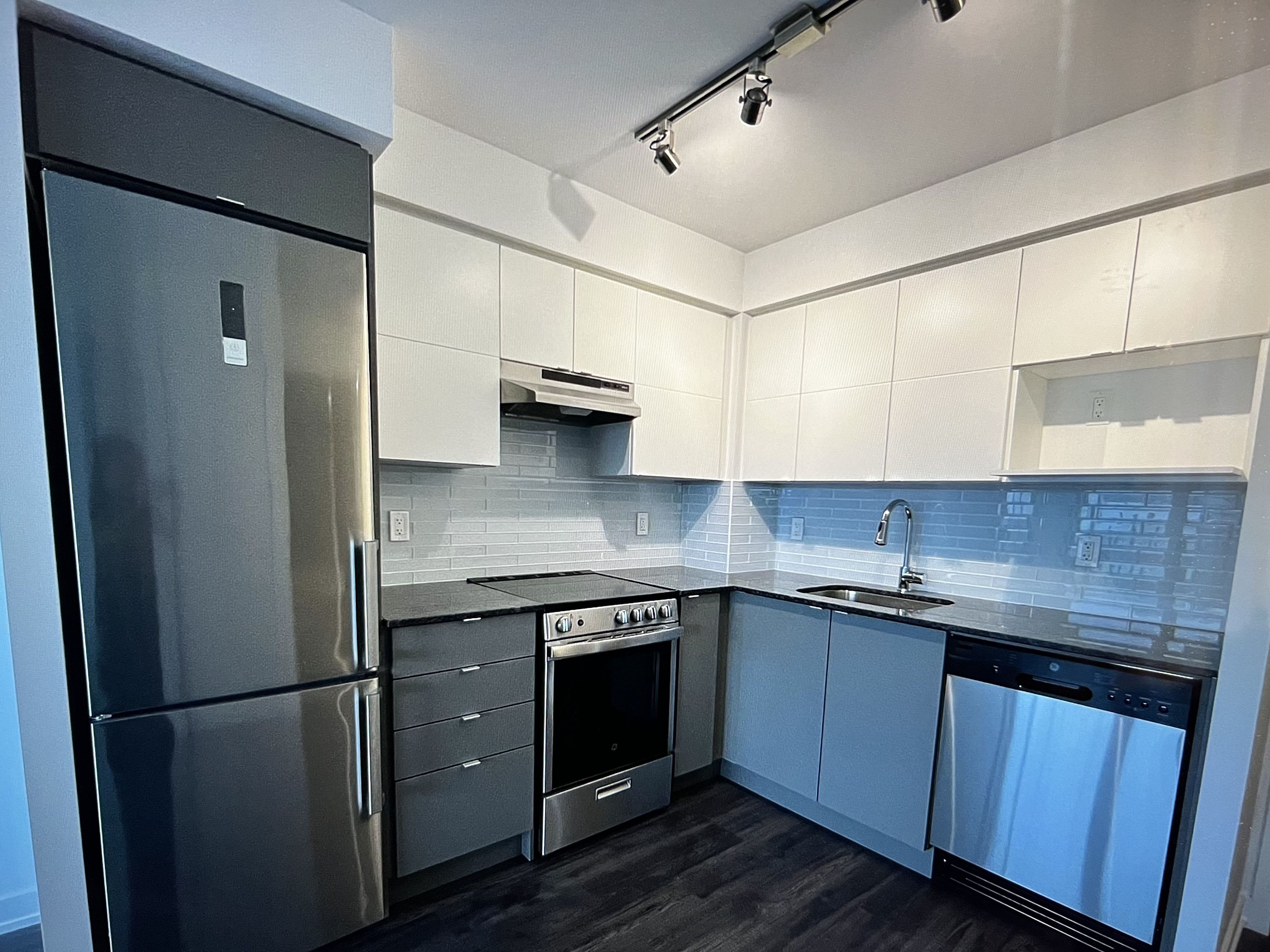 • Modern kitchen featuring stainless steel appliances.