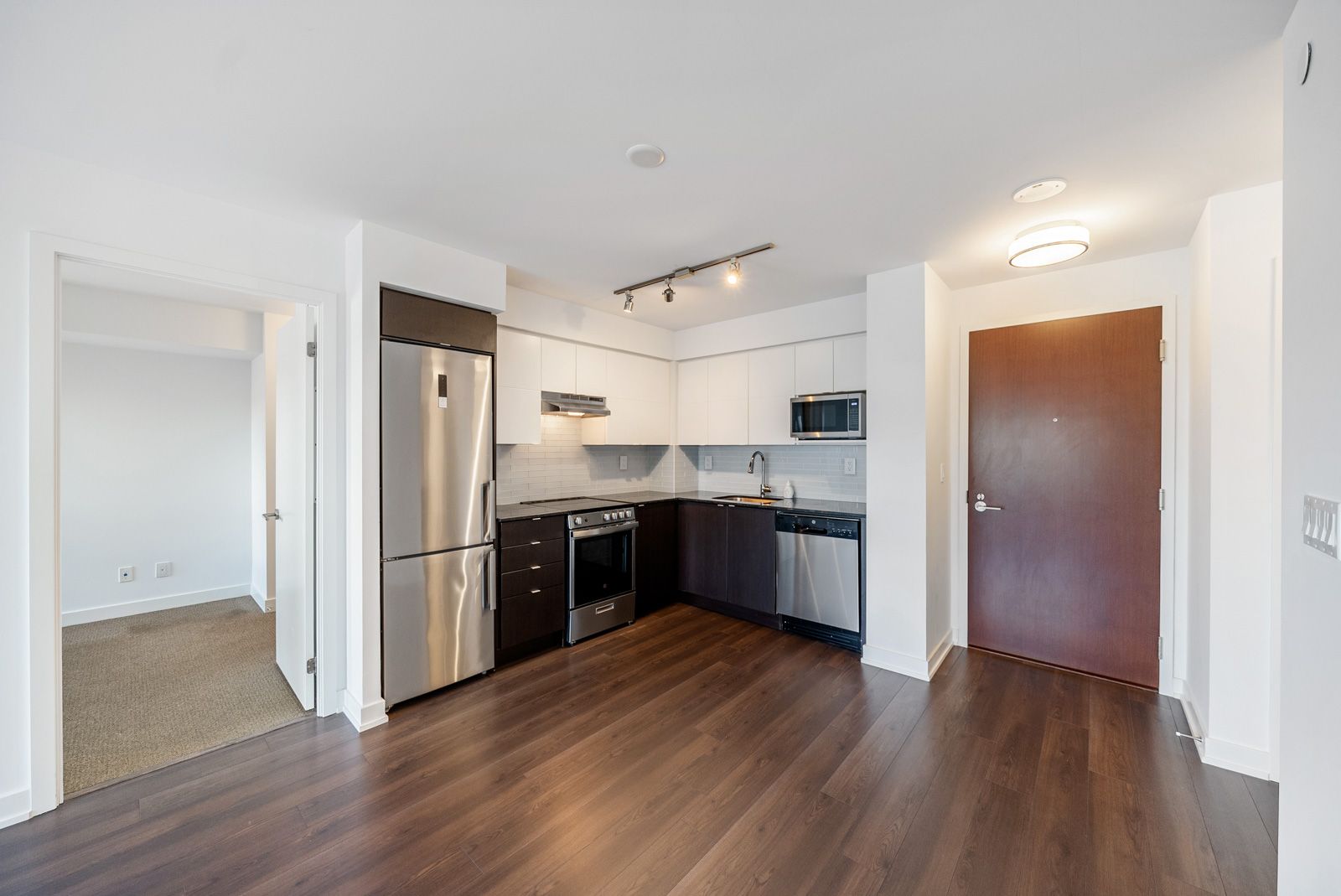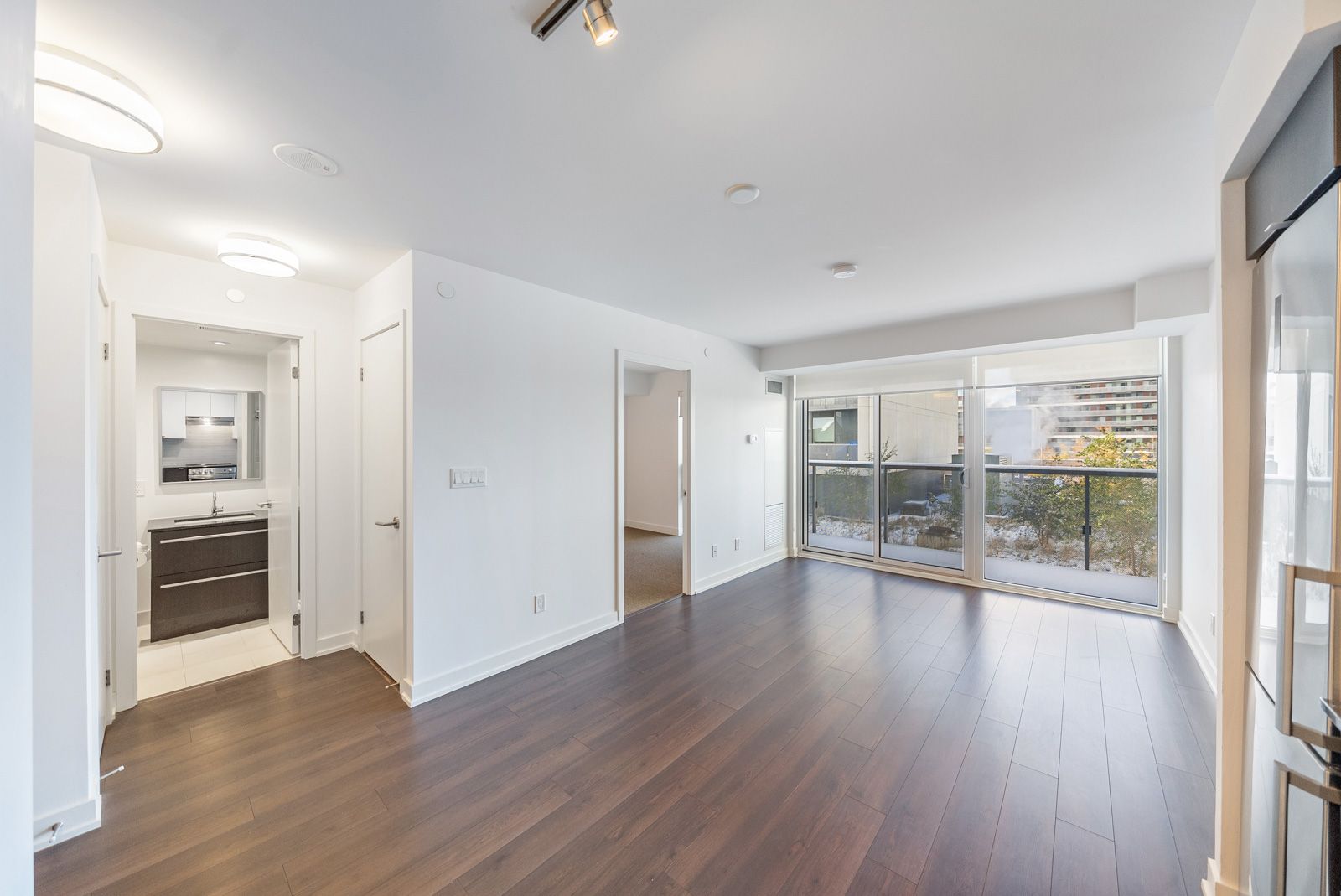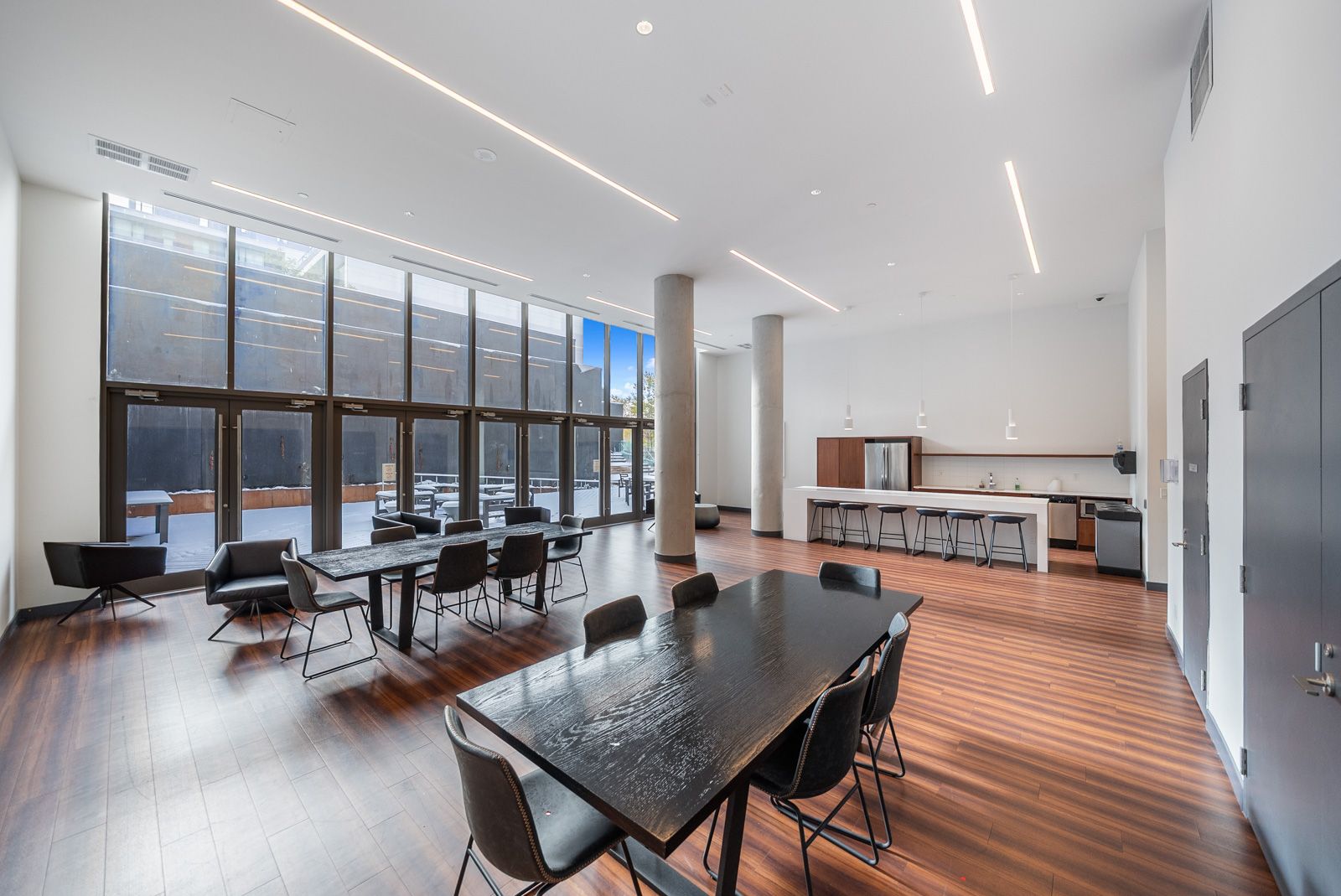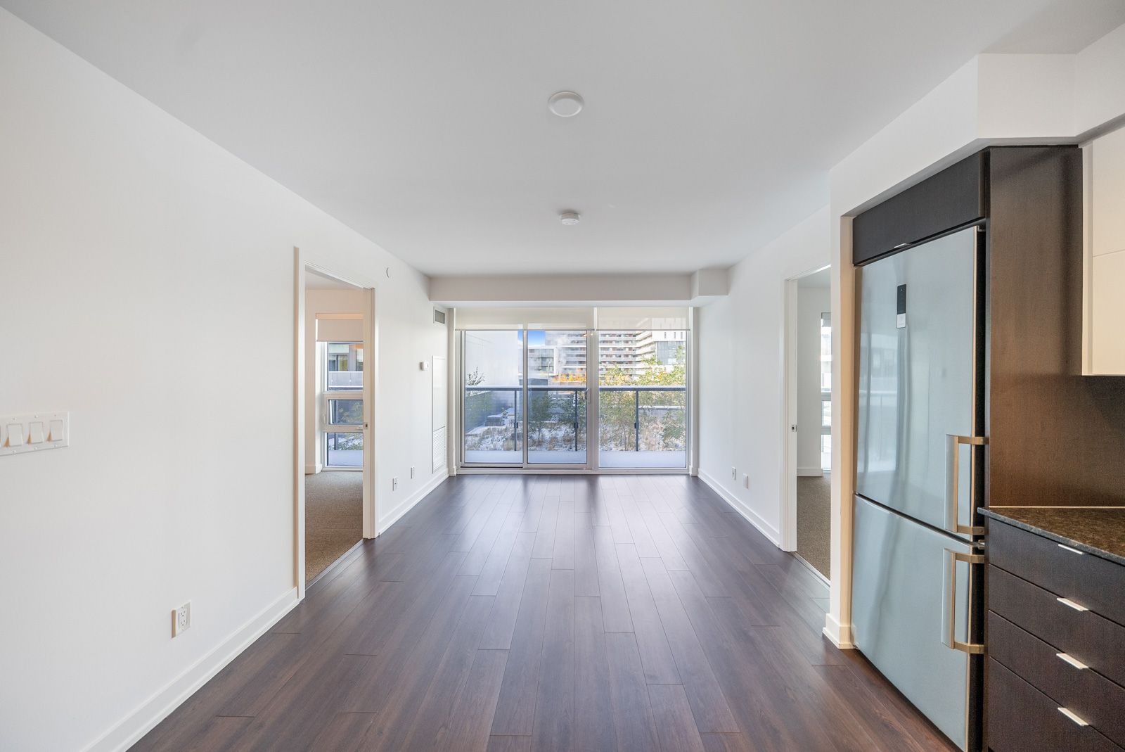 • Open-concept living area featuring elegant flooring and a stylish kitchen.
