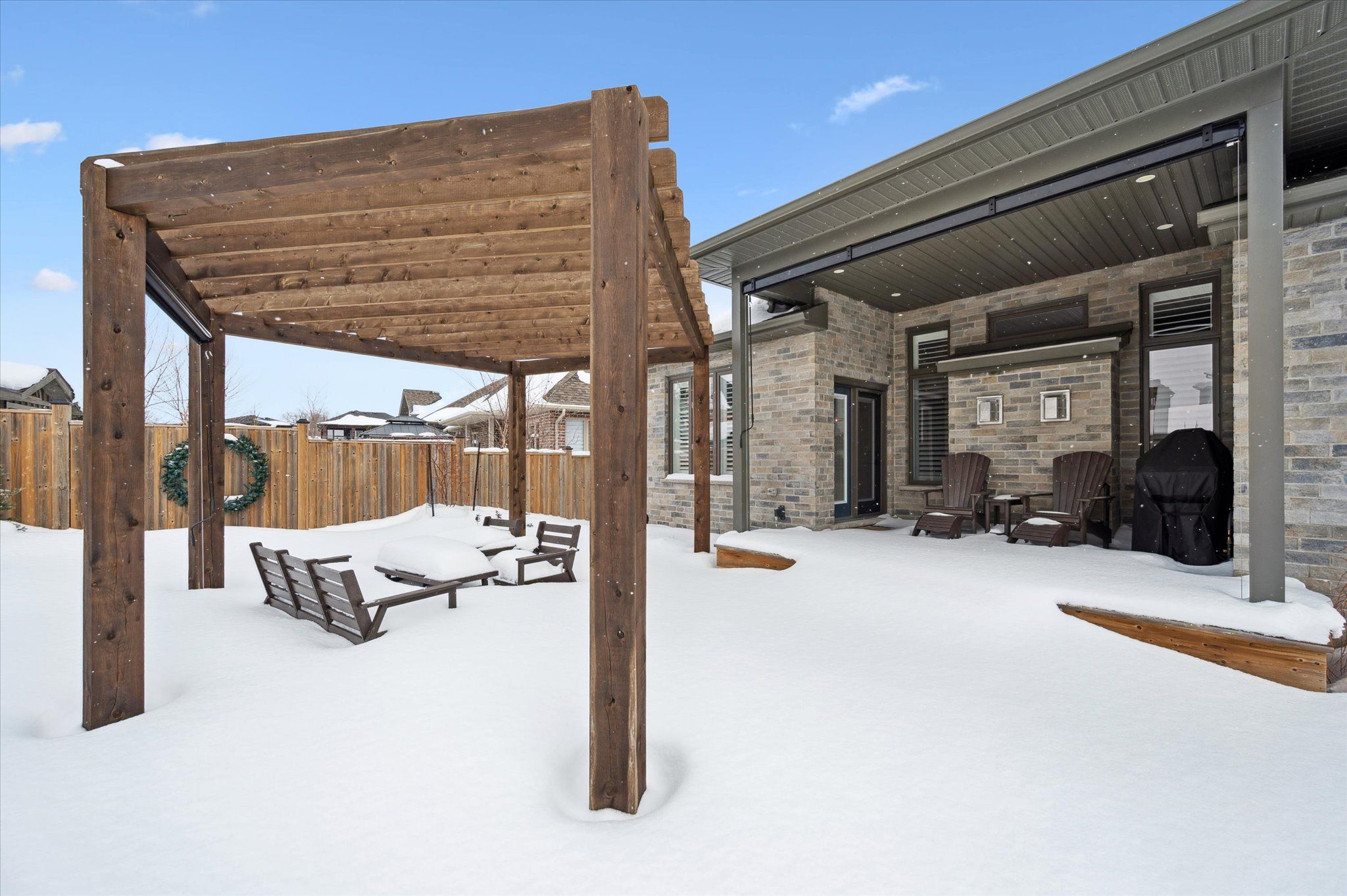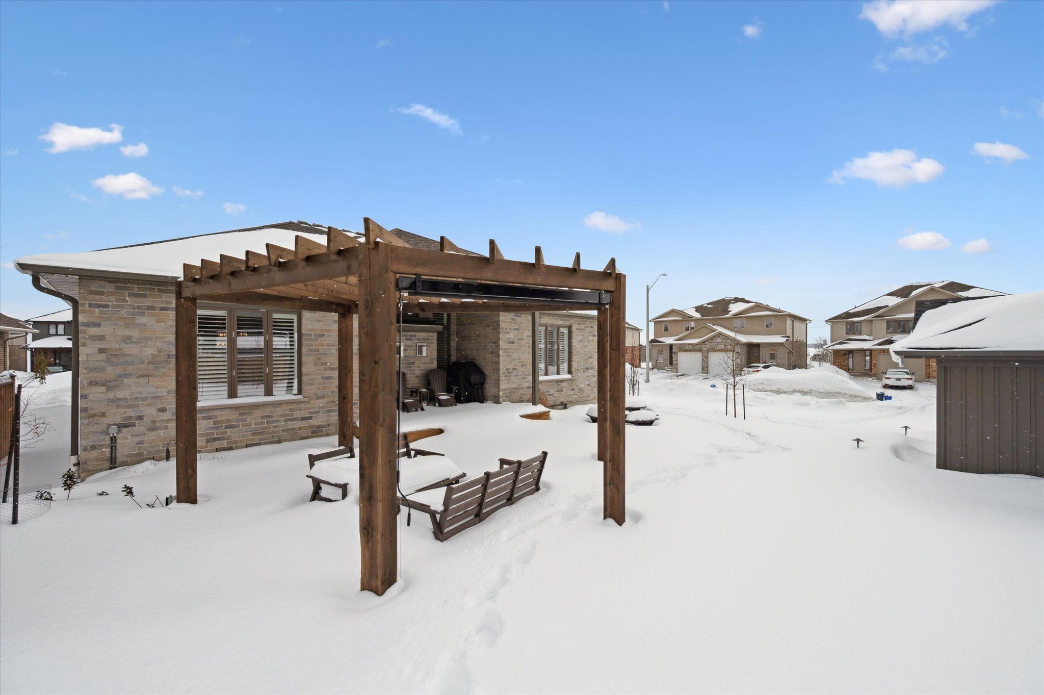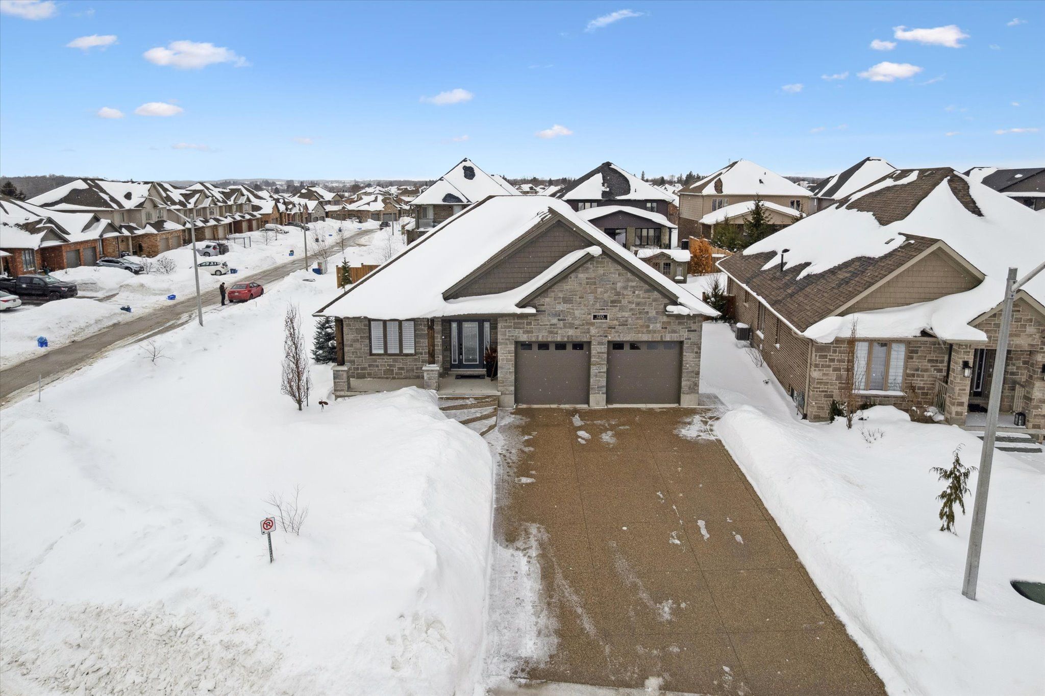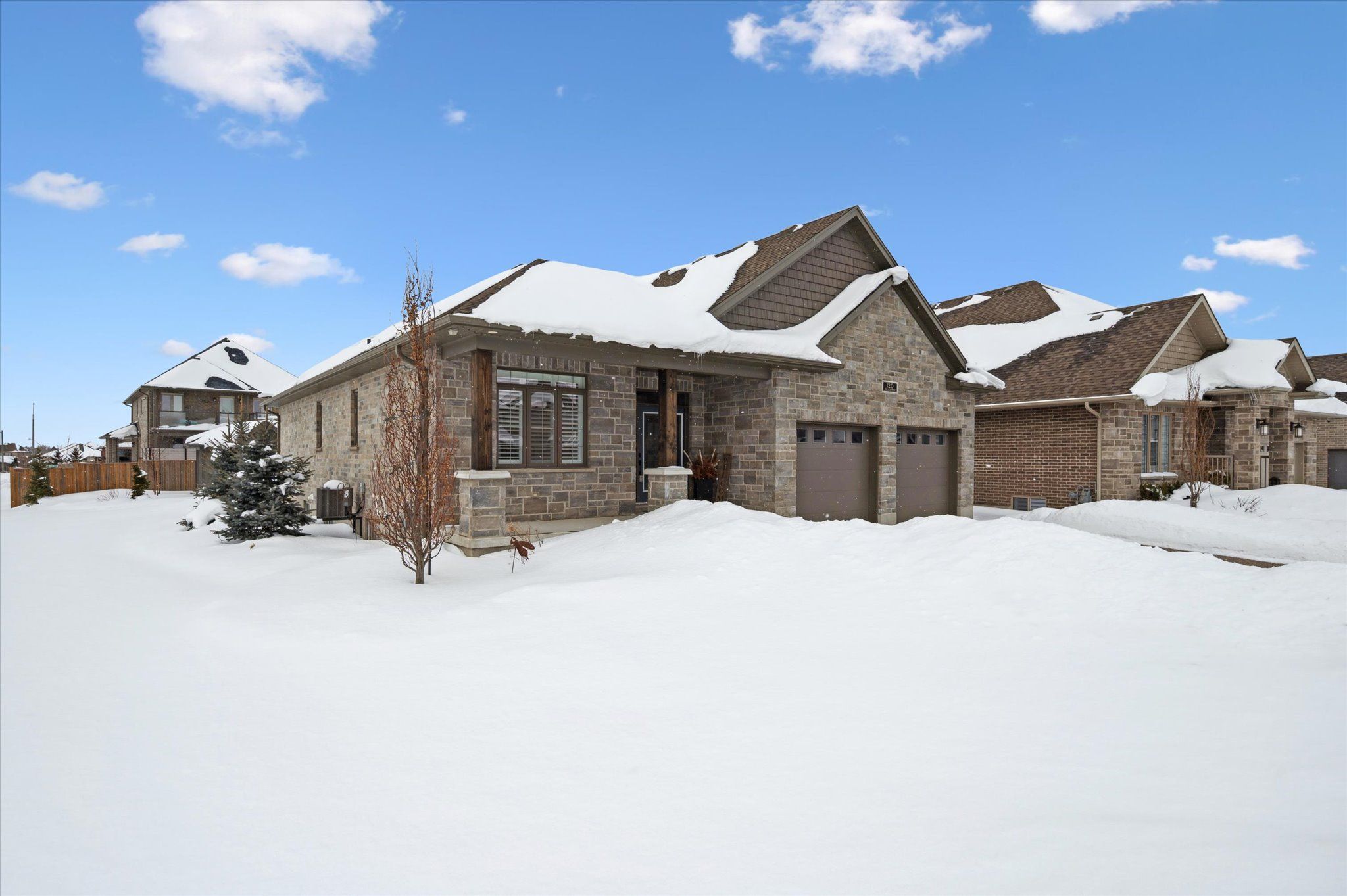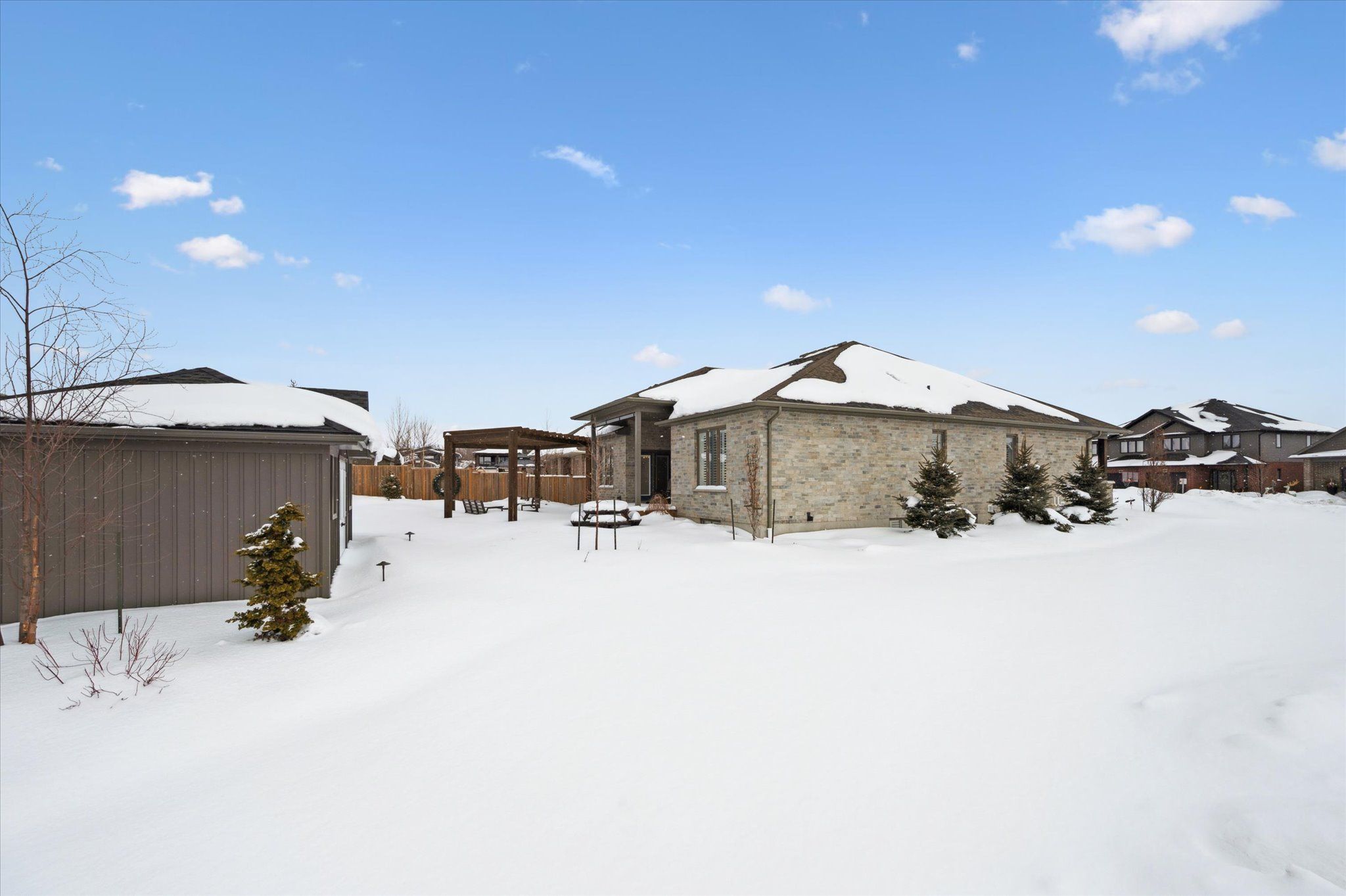 This captivating custom- built bungalow has been lovingly maintained and cared for by the original owners. You'll love the stunning kitchen with white cupboards, elegant creamy white quartz counter tops, custom range hood crafted by thak ironworks, lots of storage and workspace, a spacious walk-in pantry, and a huge center island in contrasting wood. Gracious entertaining can be yours in the elegant dining room with large windows to offer a romantic setting for special moments. Here you will also find the entrance to the back porch overlooking the tranquil yard. The welcoming great room boasts engineered hardwood floors and large windows flanking the cozy gas stone fireplace. Relax and unwind in the tranquil primary bedroom retreat with large walk-in closet and inviting primary spa bath with deep soaker tub and separate shower. You'll appreciate the convenience of the main floor laundry that you can access off the garage and the kitchen, a second main floor bedroom with spacious closet and an additional full bath. Be comfy-cozy by the rustic stone fireplace in the spacious rec room designed for informal gatherings and room for a pool table. The basement also features 2 roomy bedrooms, a full bath, loads of storage and staircase to insulated double garage! Enjoy cool summer evenings on the lovely back porch or under the pergola with a picturesque view of the lawn and gardens. Apollo shade screens on back patio and pergola. Quality craftmanship by stroh homes! Desirably located close to the school, scenic walking trails, gently rolling hills and valleys and the meandering nith river. House and garden!