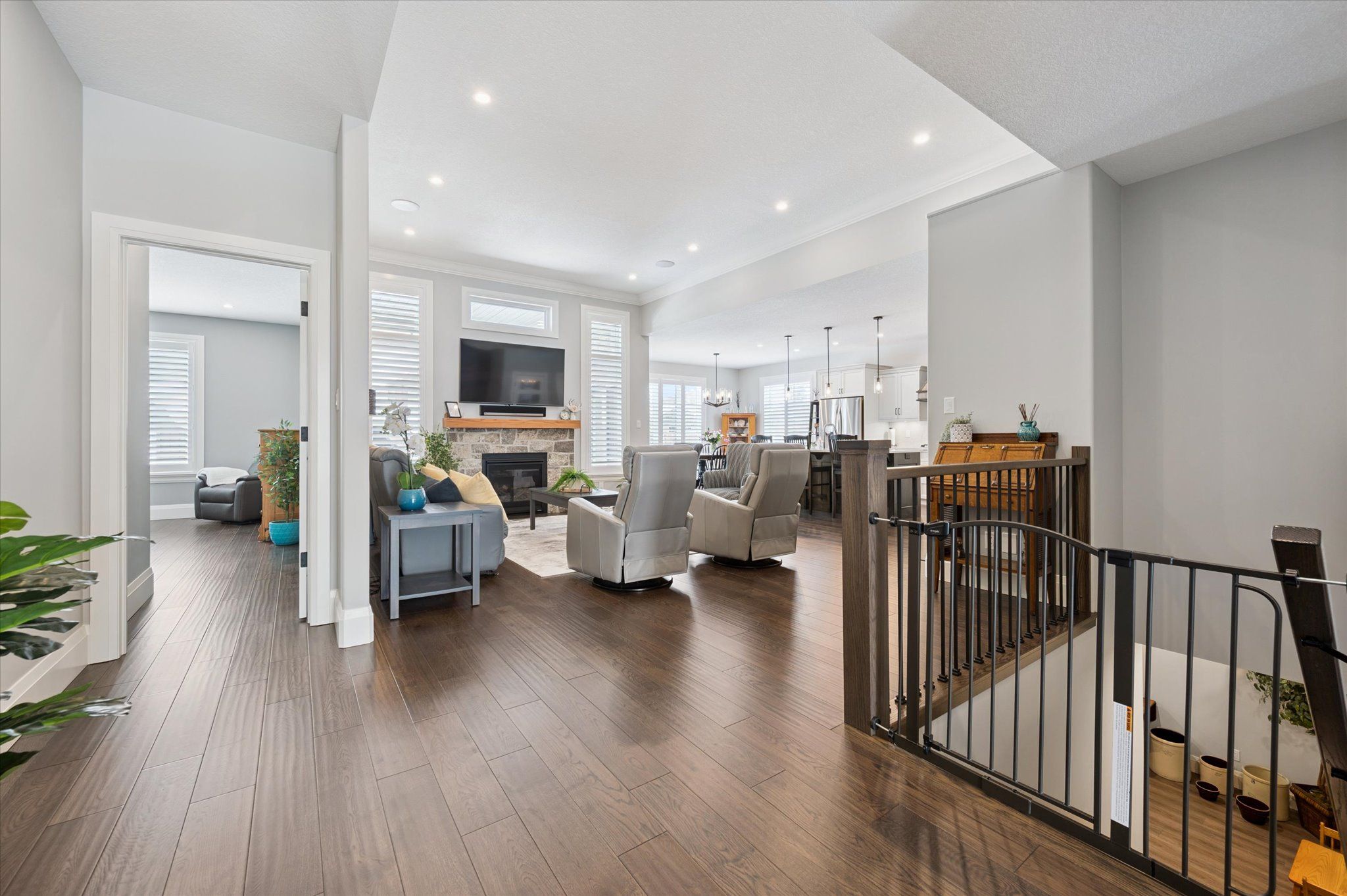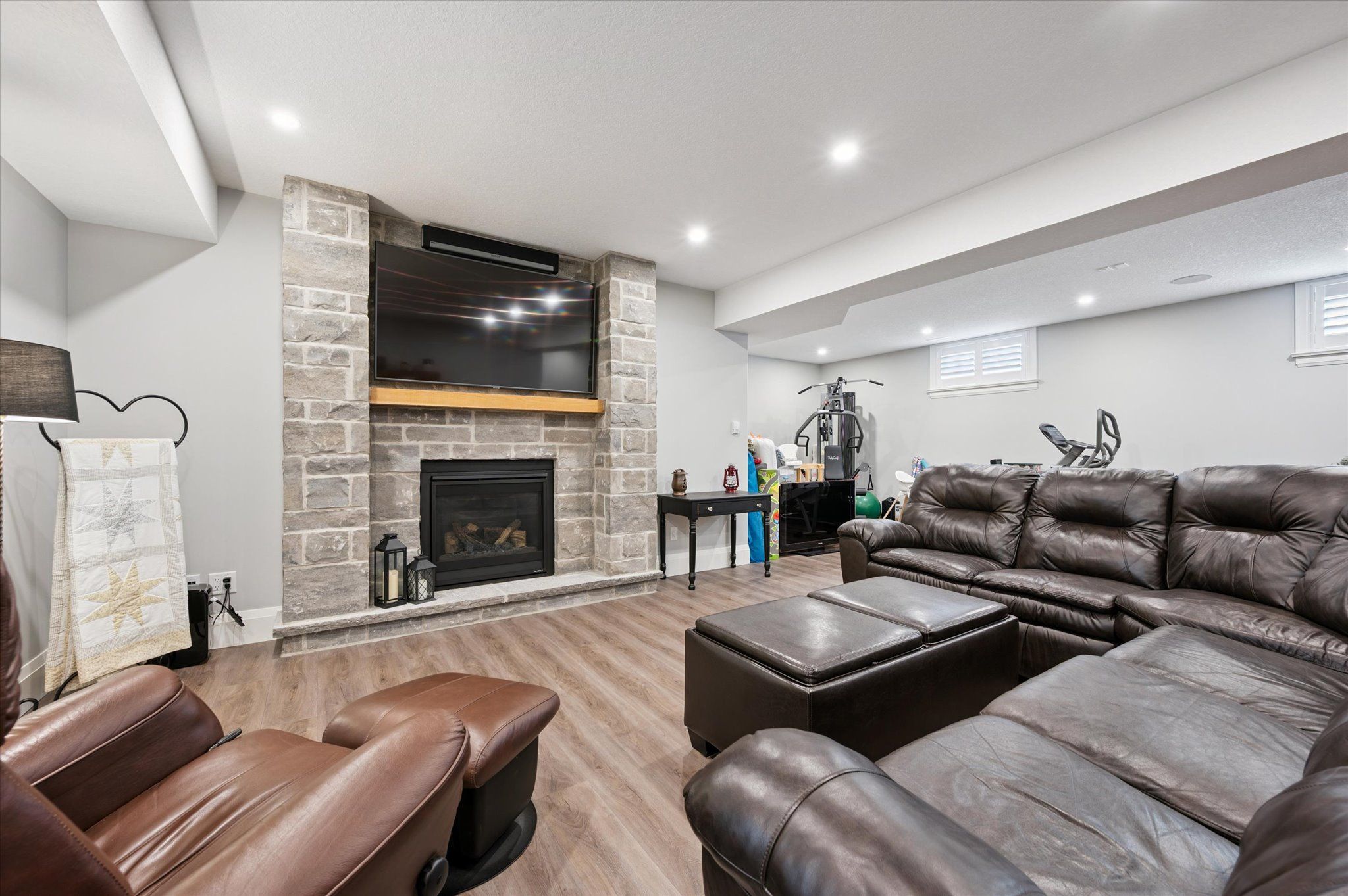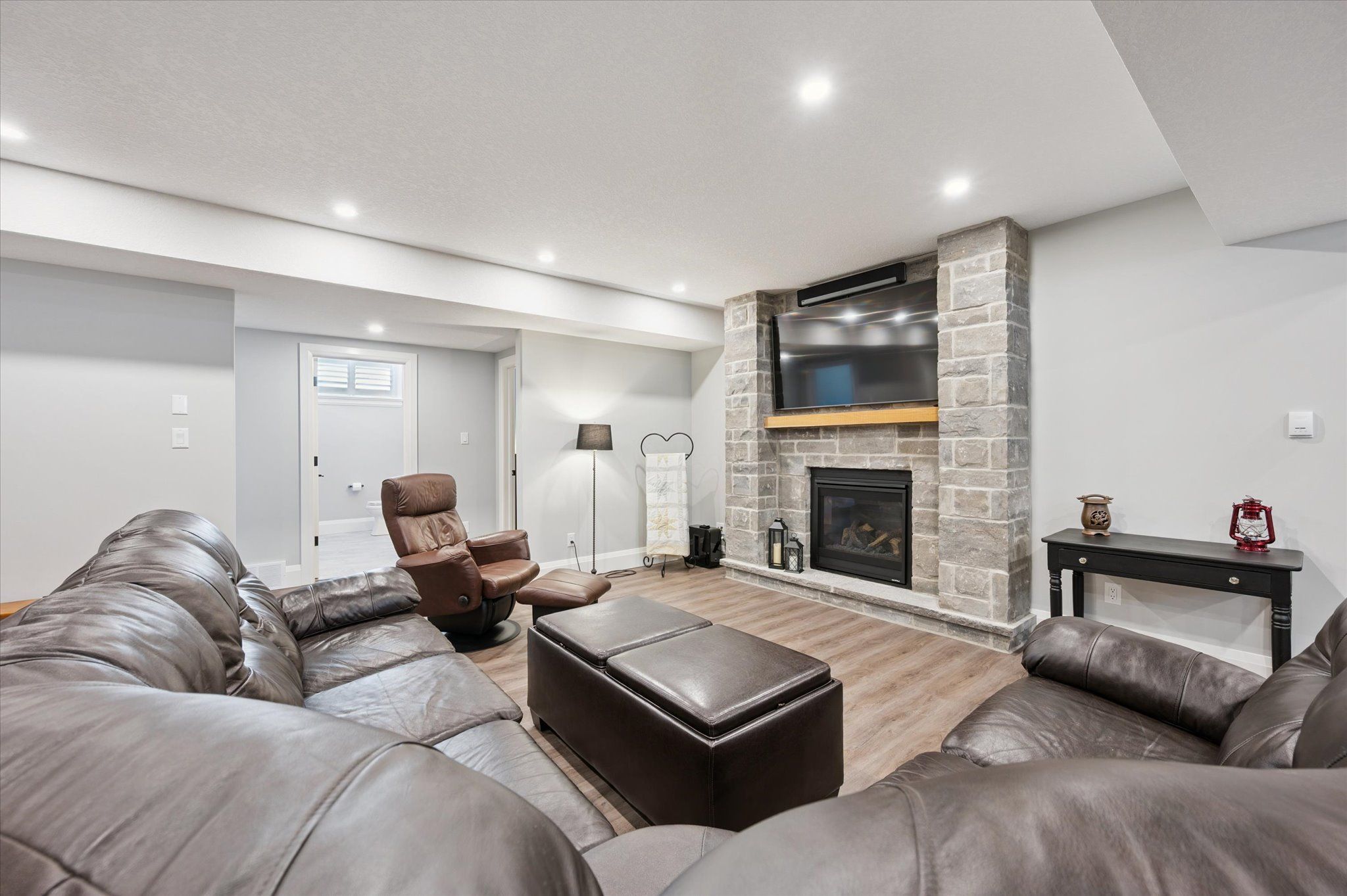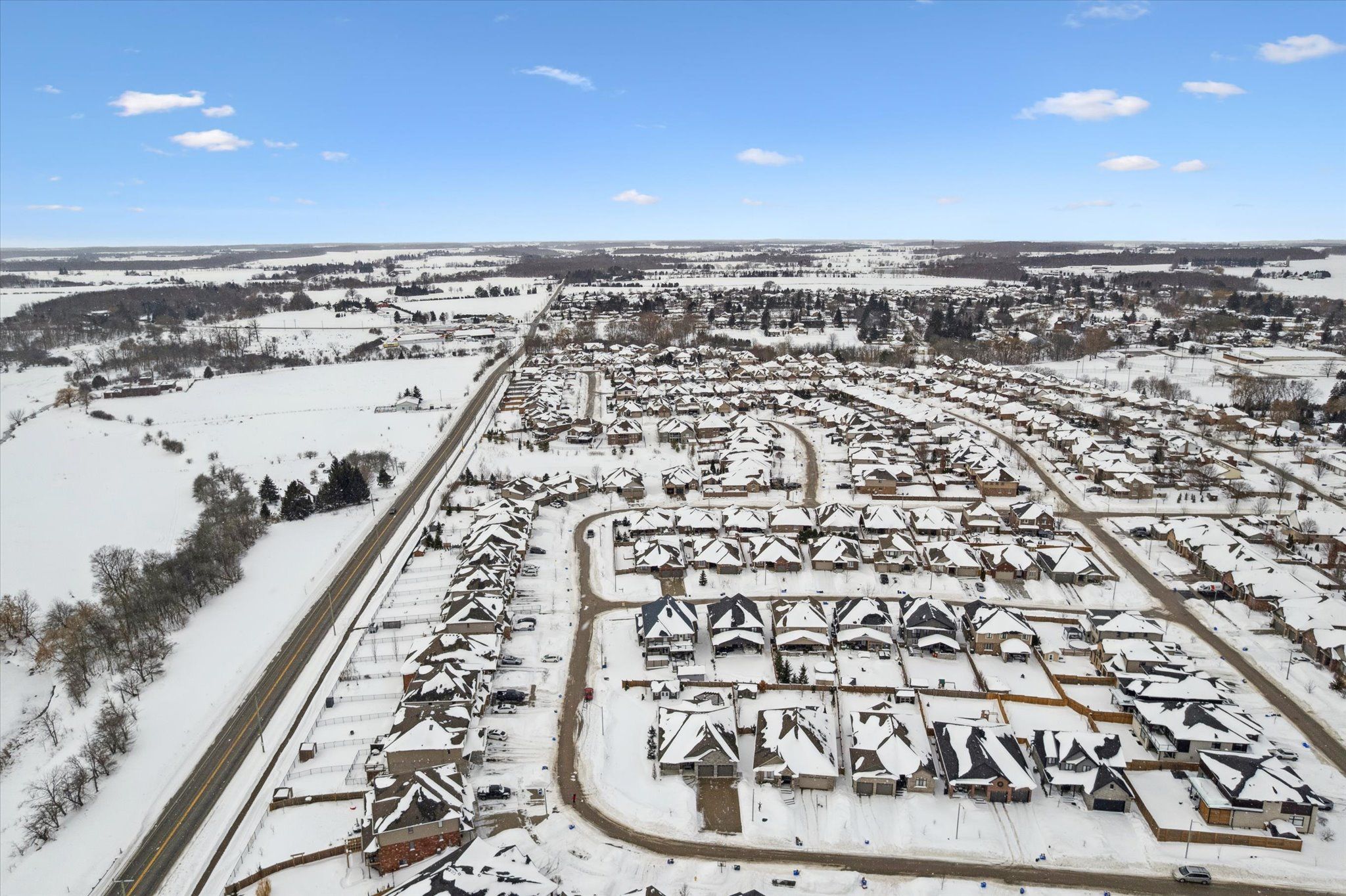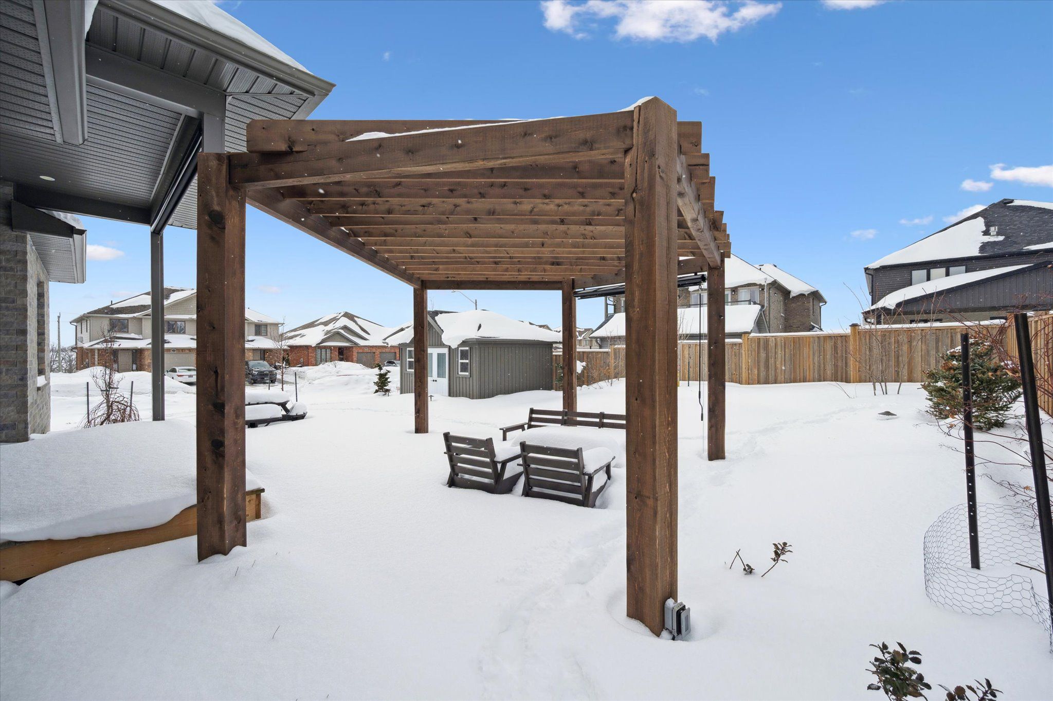 This captivating custom- built bungalow has been lovingly maintained and cared for by the original owners. You'll love the stunning kitchen with white cupboards, elegant creamy white quartz counter tops, custom range hood crafted by thak ironworks, lots of storage and workspace, a spacious walk-in pantry, and a huge center island in contrasting wood. Gracious entertaining can be yours in the elegant dining room with large windows to offer a romantic setting for special moments. Here you will also find the entrance to the back porch overlooking the tranquil yard. The welcoming great room boasts engineered hardwood floors and large windows flanking the cozy gas stone fireplace. Relax and unwind in the tranquil primary bedroom retreat with large walk-in closet and inviting primary spa bath with deep soaker tub and separate shower. You'll appreciate the convenience of the main floor laundry that you can access off the garage and the kitchen, a second main floor bedroom with spacious closet and an additional full bath. Be comfy-cozy by the rustic stone fireplace in the spacious rec room designed for informal gatherings and room for a pool table. The basement also features 2 roomy bedrooms, a full bath, loads of storage and staircase to insulated double garage! Enjoy cool summer evenings on the lovely back porch or under the pergola with a picturesque view of the lawn and gardens. Apollo shade screens on back patio and pergola. Quality craftmanship by stroh homes! Desirably located close to the school, scenic walking trails, gently rolling hills and valleys and the meandering nith river. House and garden!