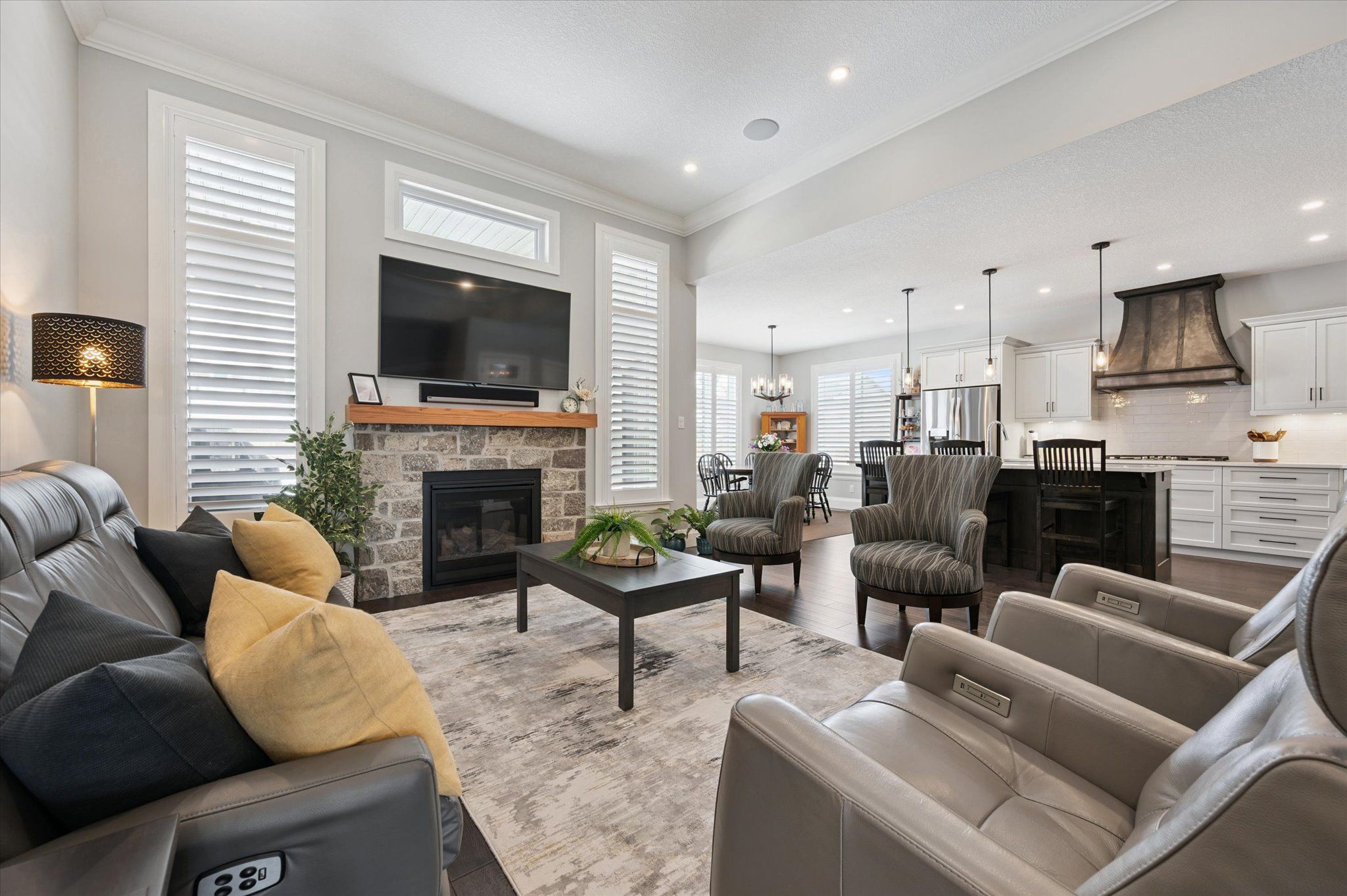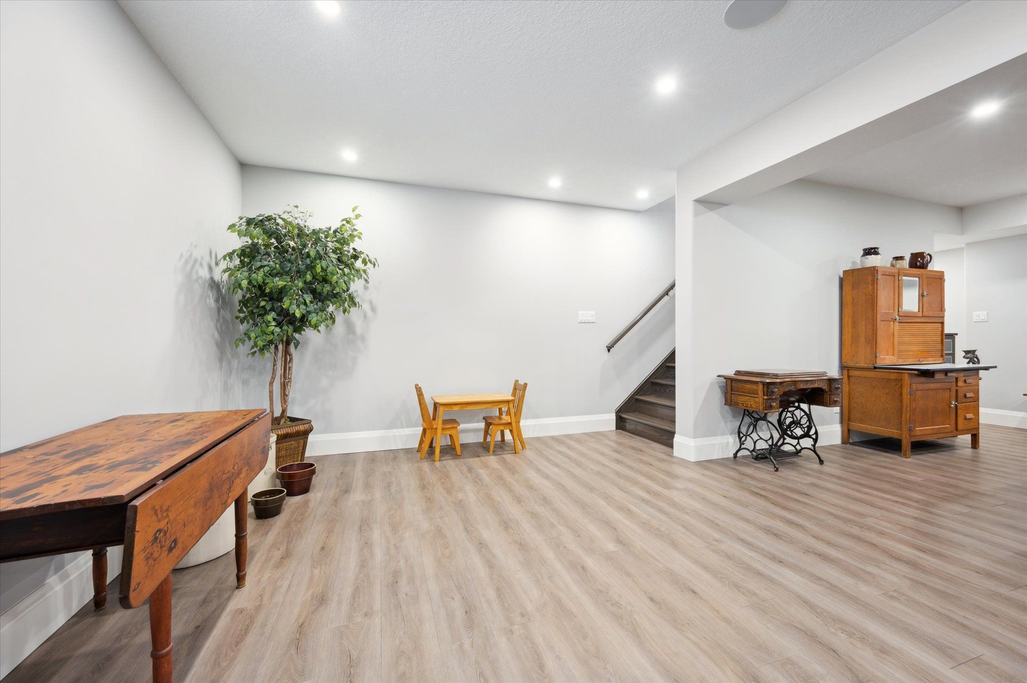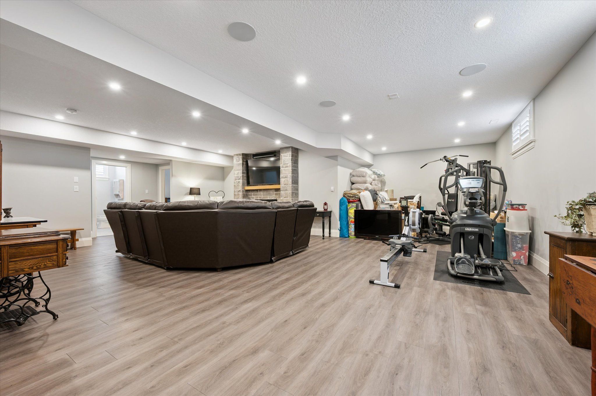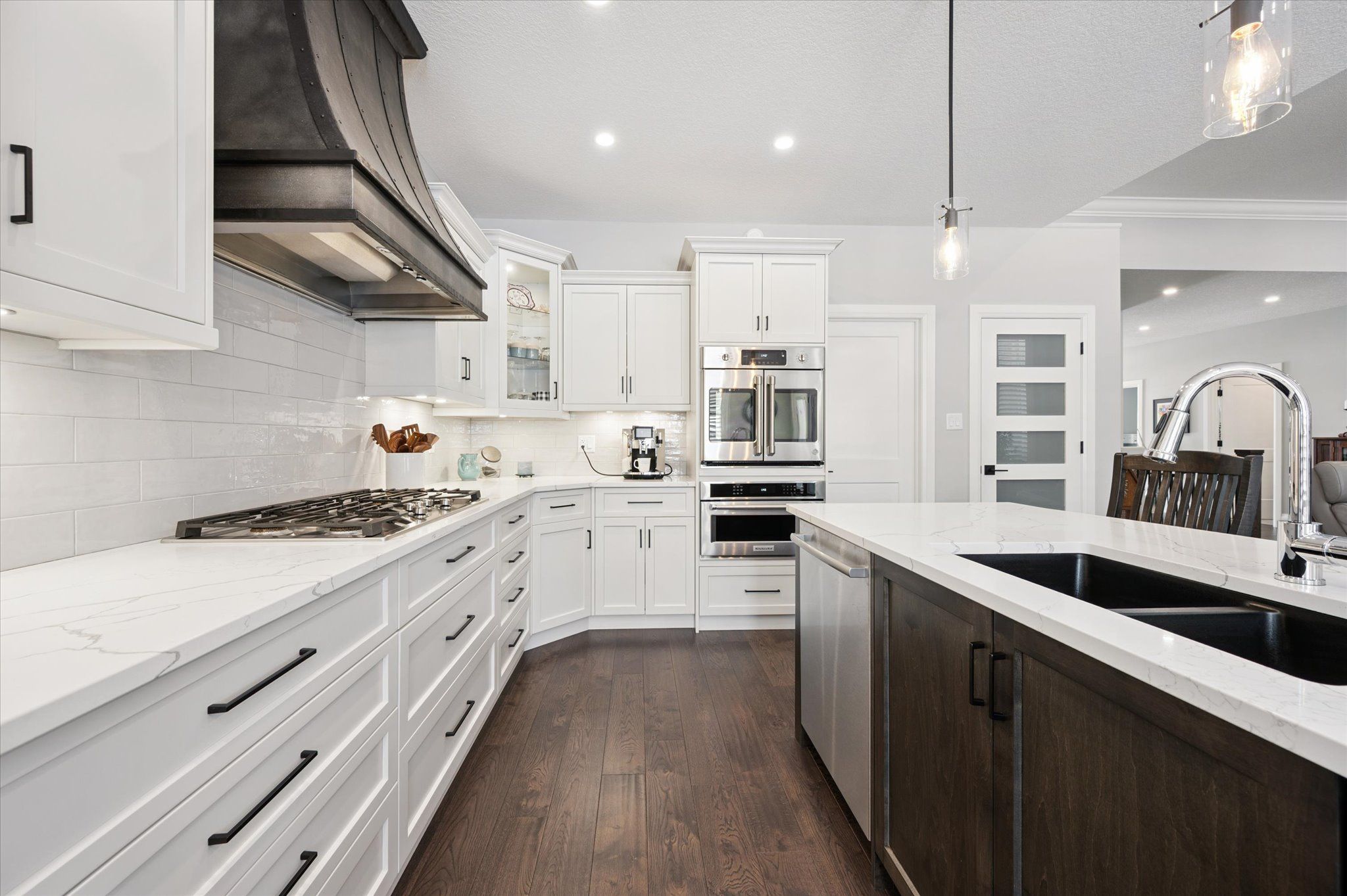 This captivating custom- built bungalow has been lovingly maintained and cared for by the original owners. You'll love the stunning kitchen with white cupboards, elegant creamy white quartz counter tops, custom range hood crafted by thak ironworks, lots of storage and workspace, a spacious walk-in pantry, and a huge center island in contrasting wood. Gracious entertaining can be yours in the elegant dining room with large windows to offer a romantic setting for special moments. Here you will also find the entrance to the back porch overlooking the tranquil yard. The welcoming great room boasts engineered hardwood floors and large windows flanking the cozy gas stone fireplace. Relax and unwind in the tranquil primary bedroom retreat with large walk-in closet and inviting primary spa bath with deep soaker tub and separate shower. You'll appreciate the convenience of the main floor laundry that you can access off the garage and the kitchen, a second main floor bedroom with spacious closet and an additional full bath. Be comfy-cozy by the rustic stone fireplace in the spacious rec room designed for informal gatherings and room for a pool table. The basement also features 2 roomy bedrooms, a full bath, loads of storage and staircase to insulated double garage! Enjoy cool summer evenings on the lovely back porch or under the pergola with a picturesque view of the lawn and gardens. Apollo shade screens on back patio and pergola. Quality craftmanship by stroh homes! Desirably located close to the school, scenic walking trails, gently rolling hills and valleys and the meandering nith river. House and garden!