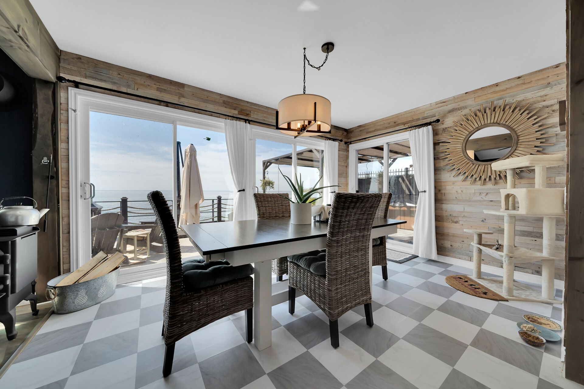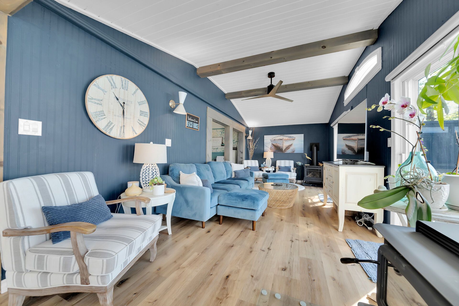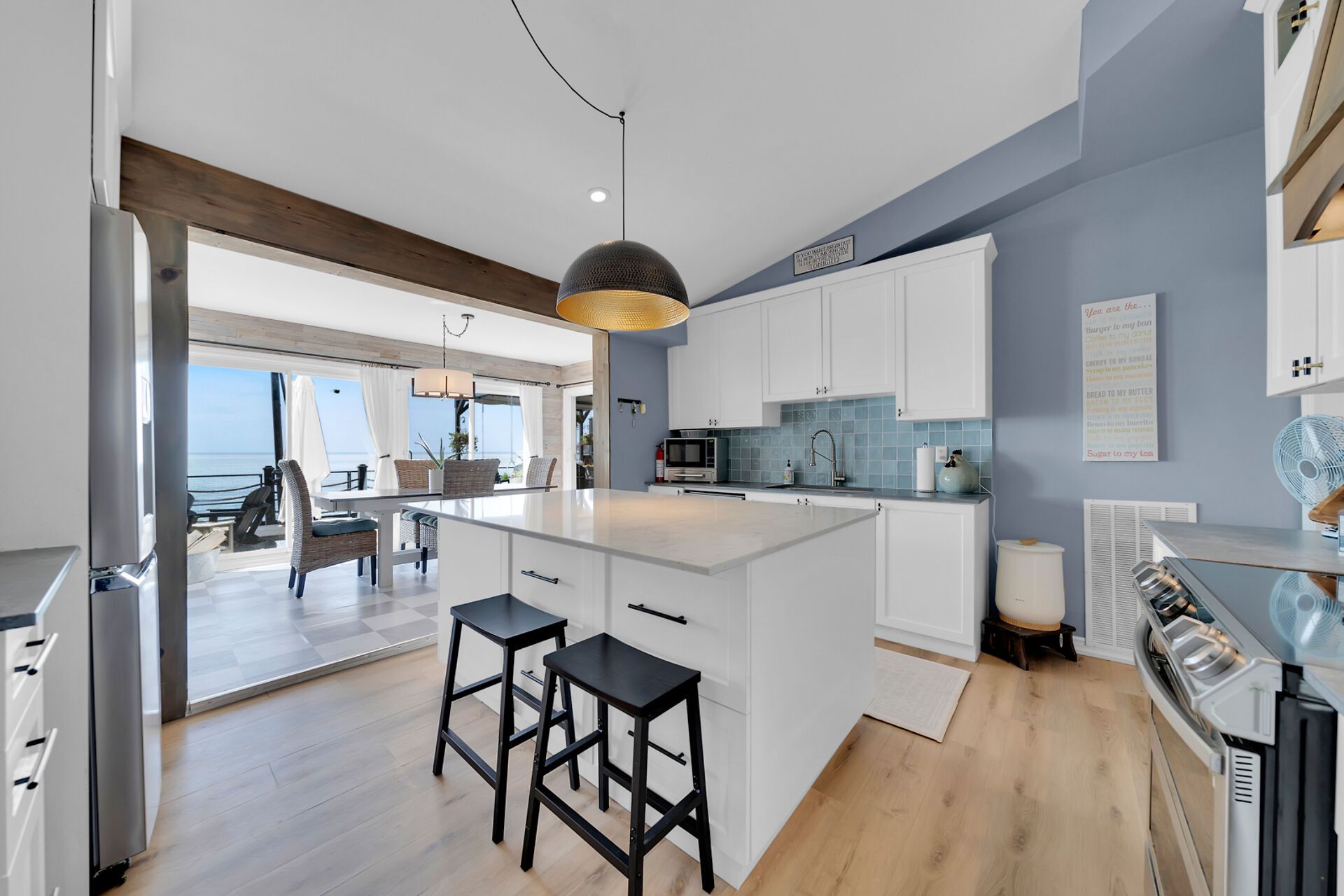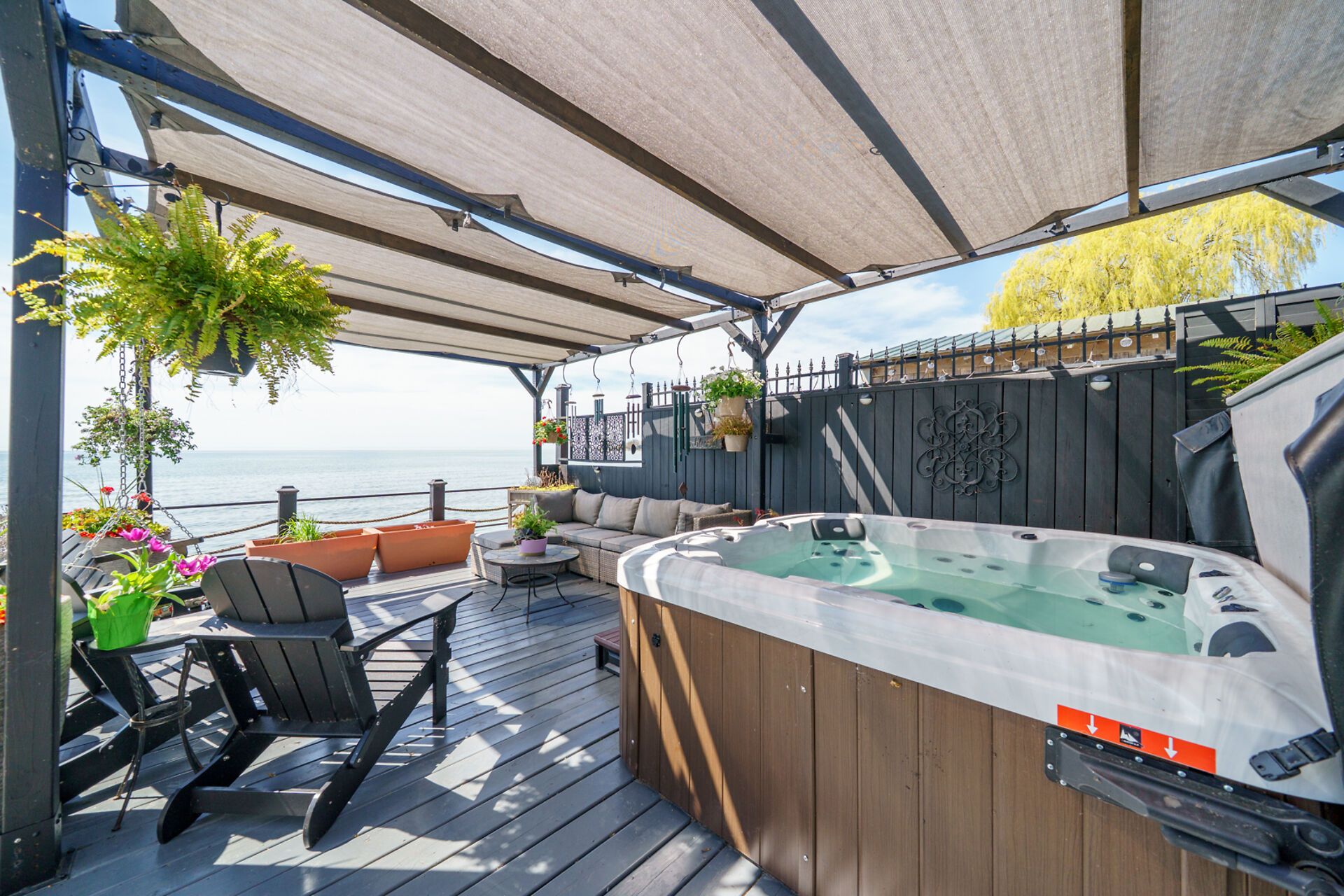 • Backyard oasis features a stone patio, pergola, and private beach access.