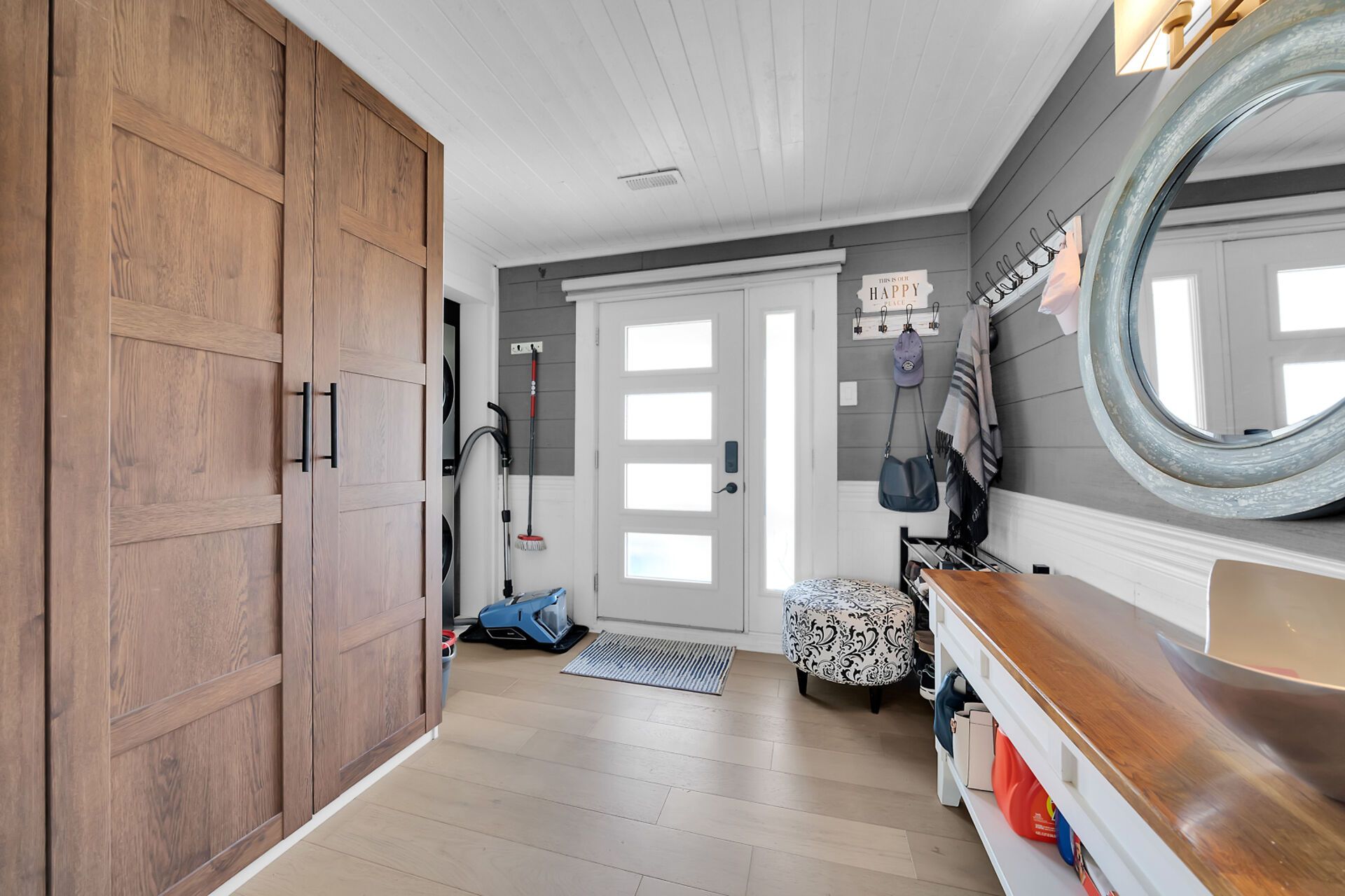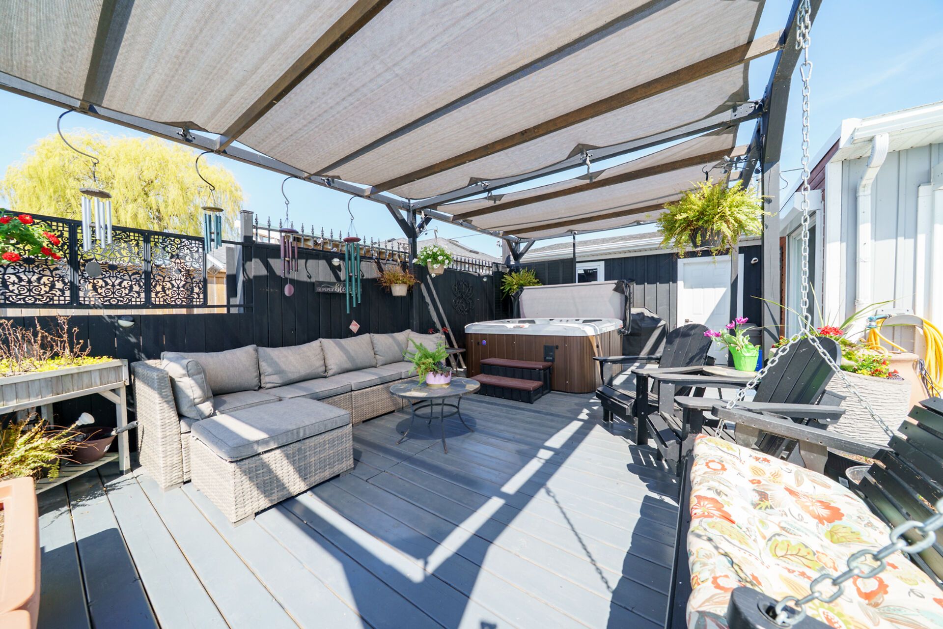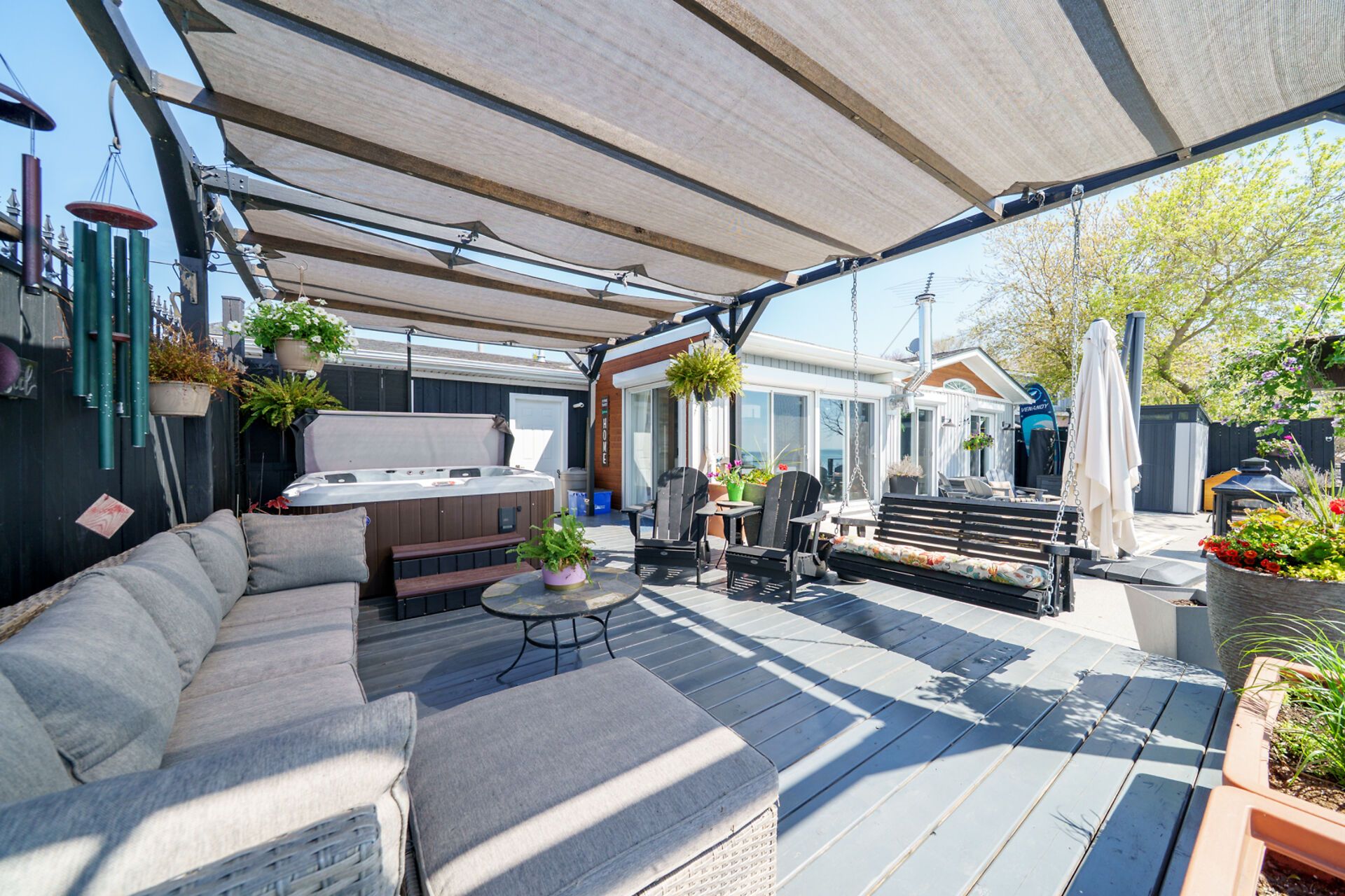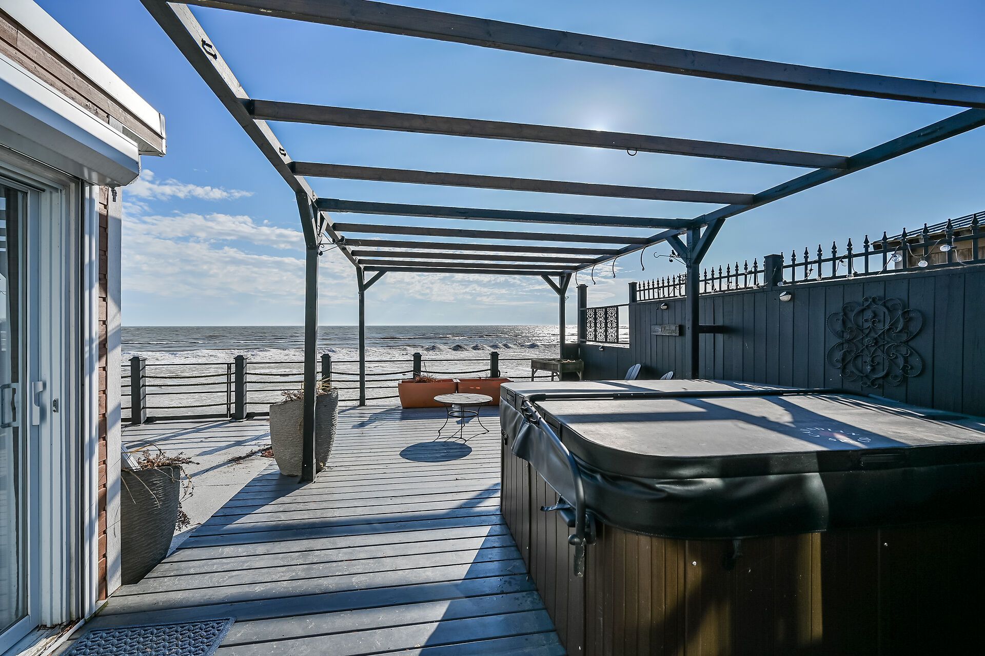 • Backyard oasis features a stone patio, pergola, and private beach access.