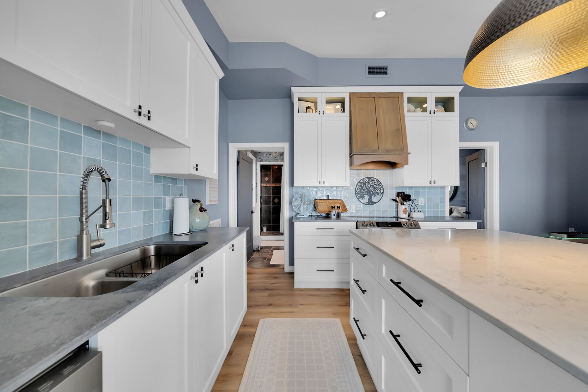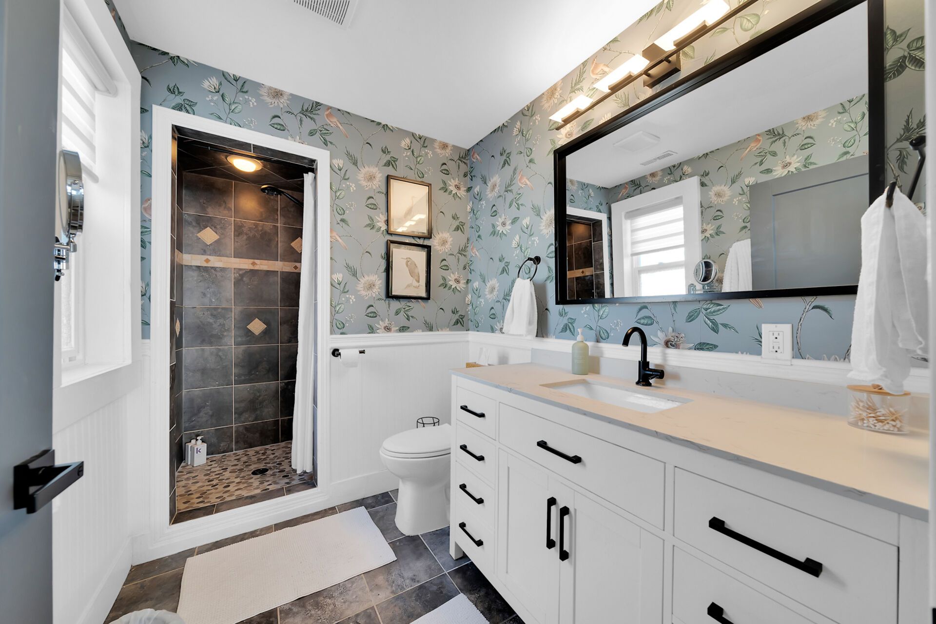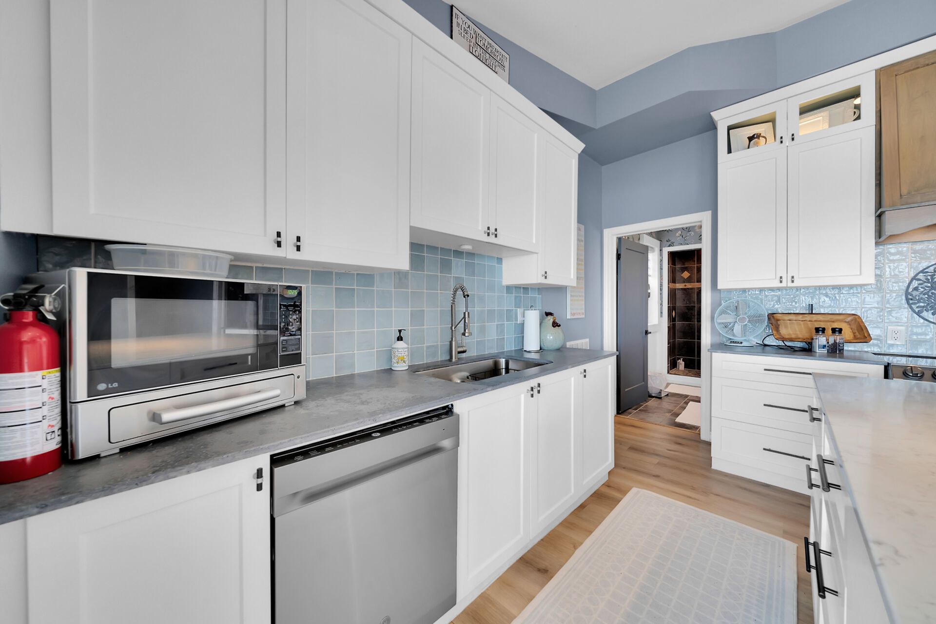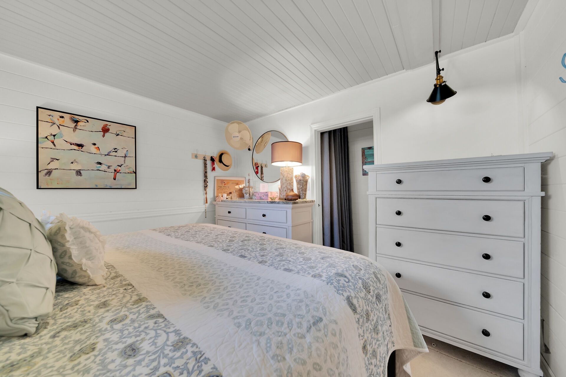• Backyard oasis features a stone patio, pergola, and private beach access.