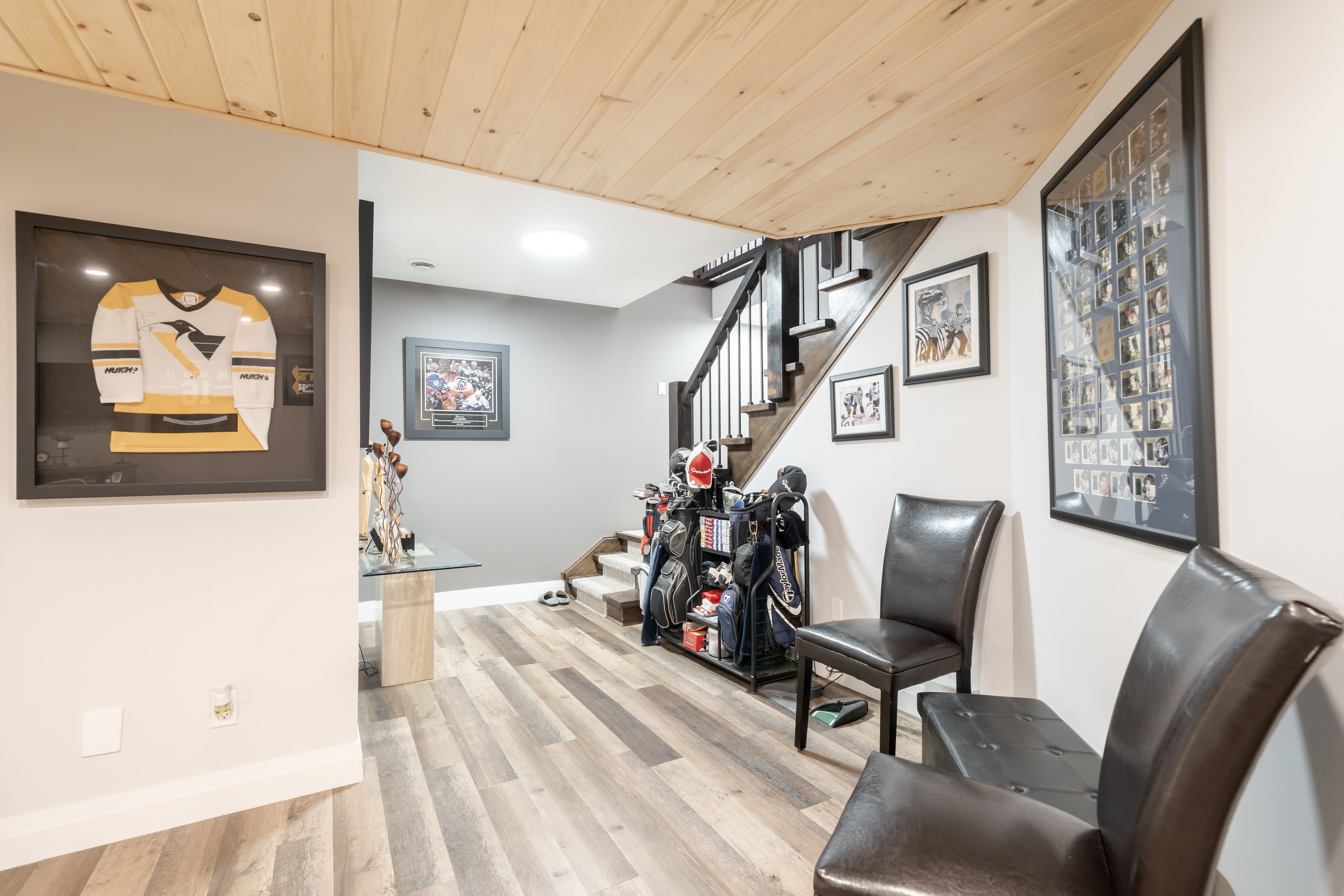 • Spacious open-concept area with cathedral ceilings and cozy gas fireplace.
