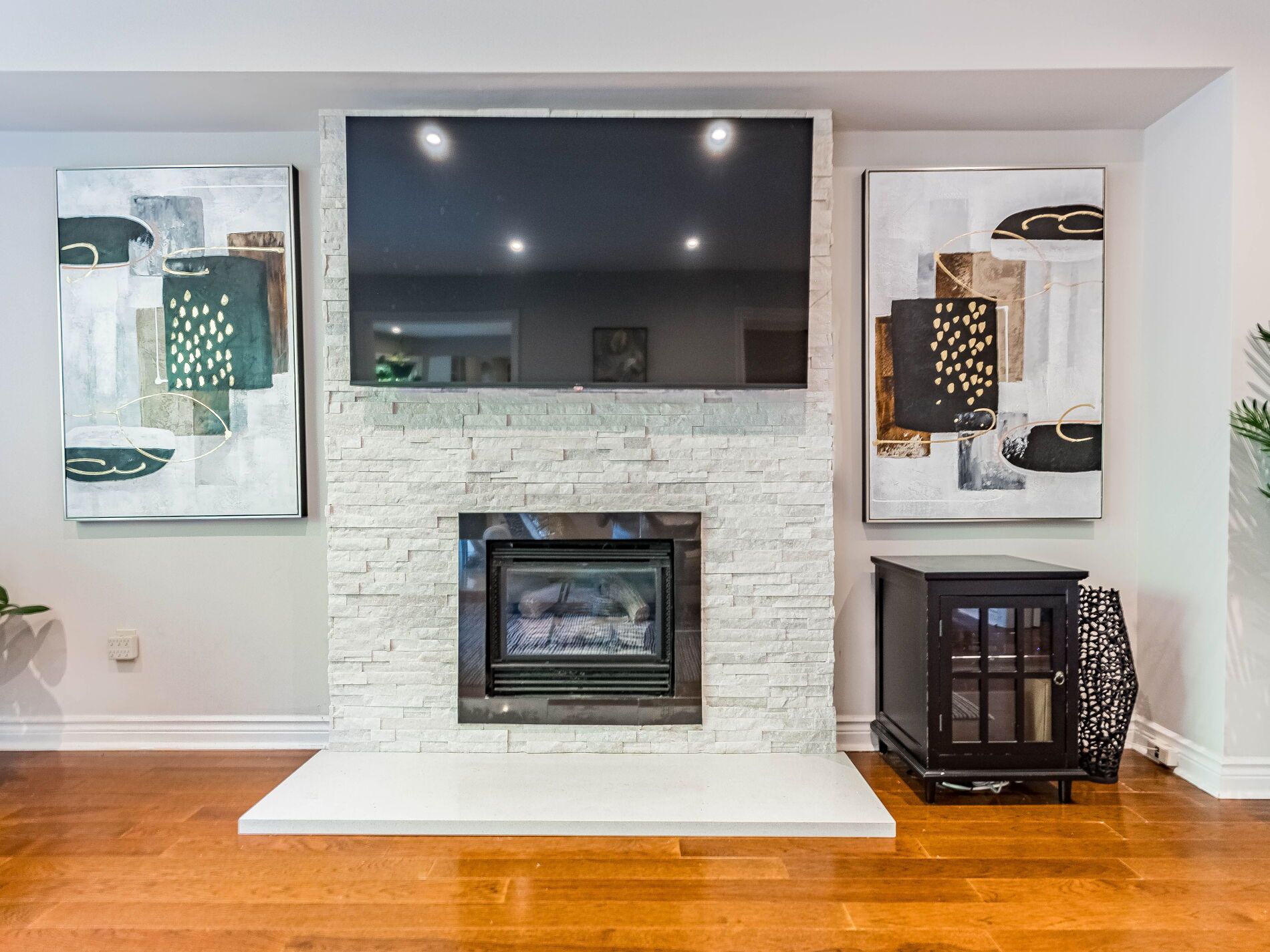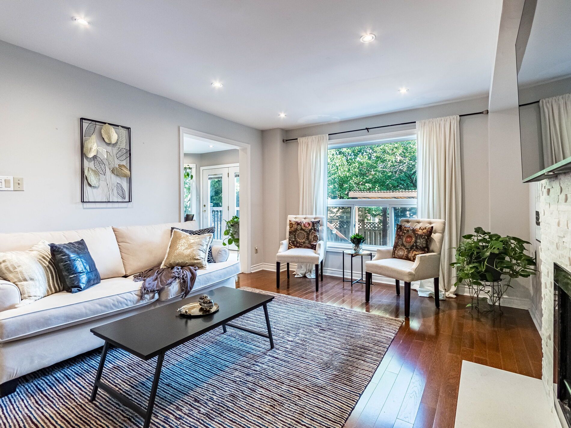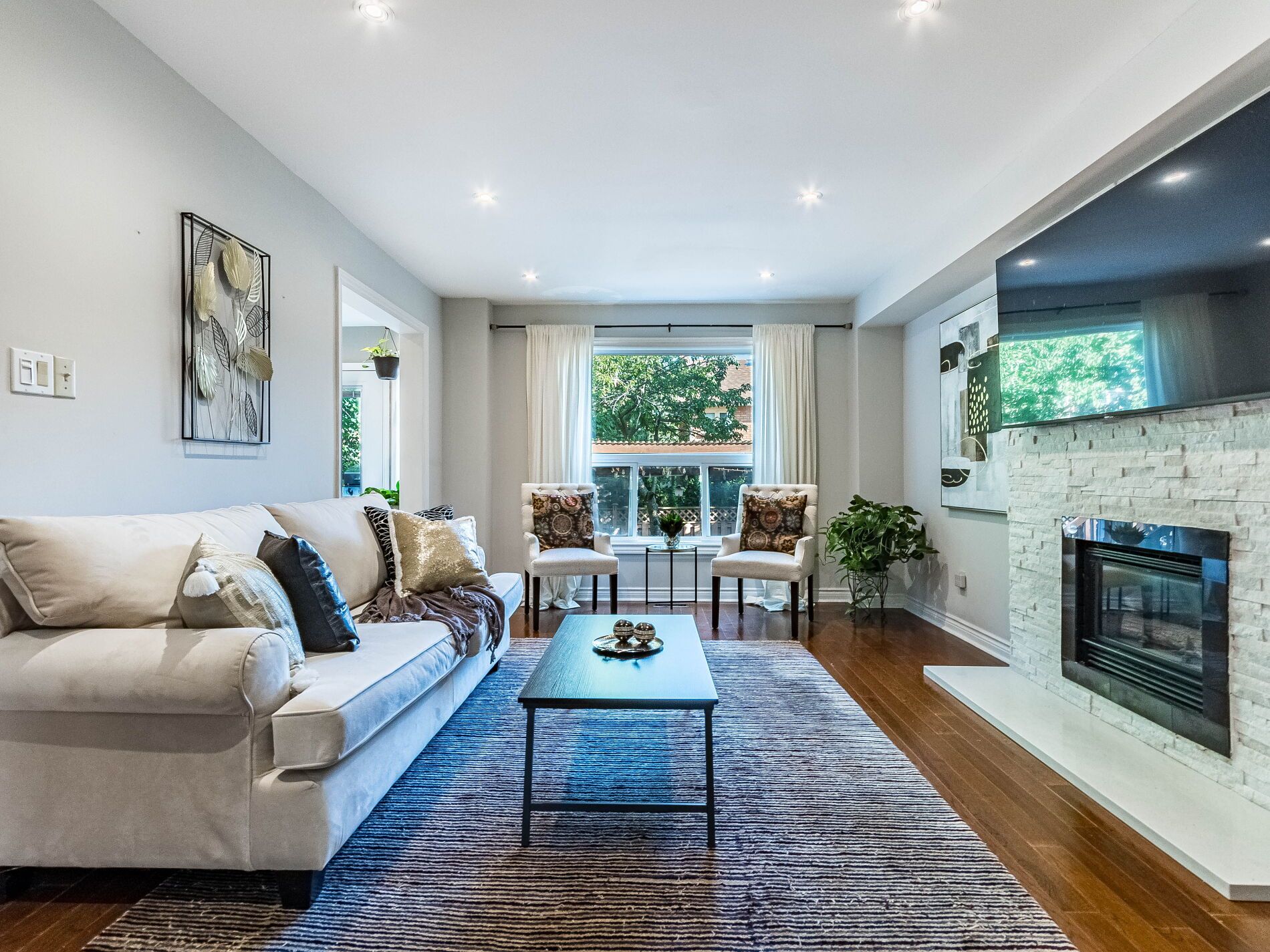 • Open-concept main floor with natural light and a stunning stone fireplace.
